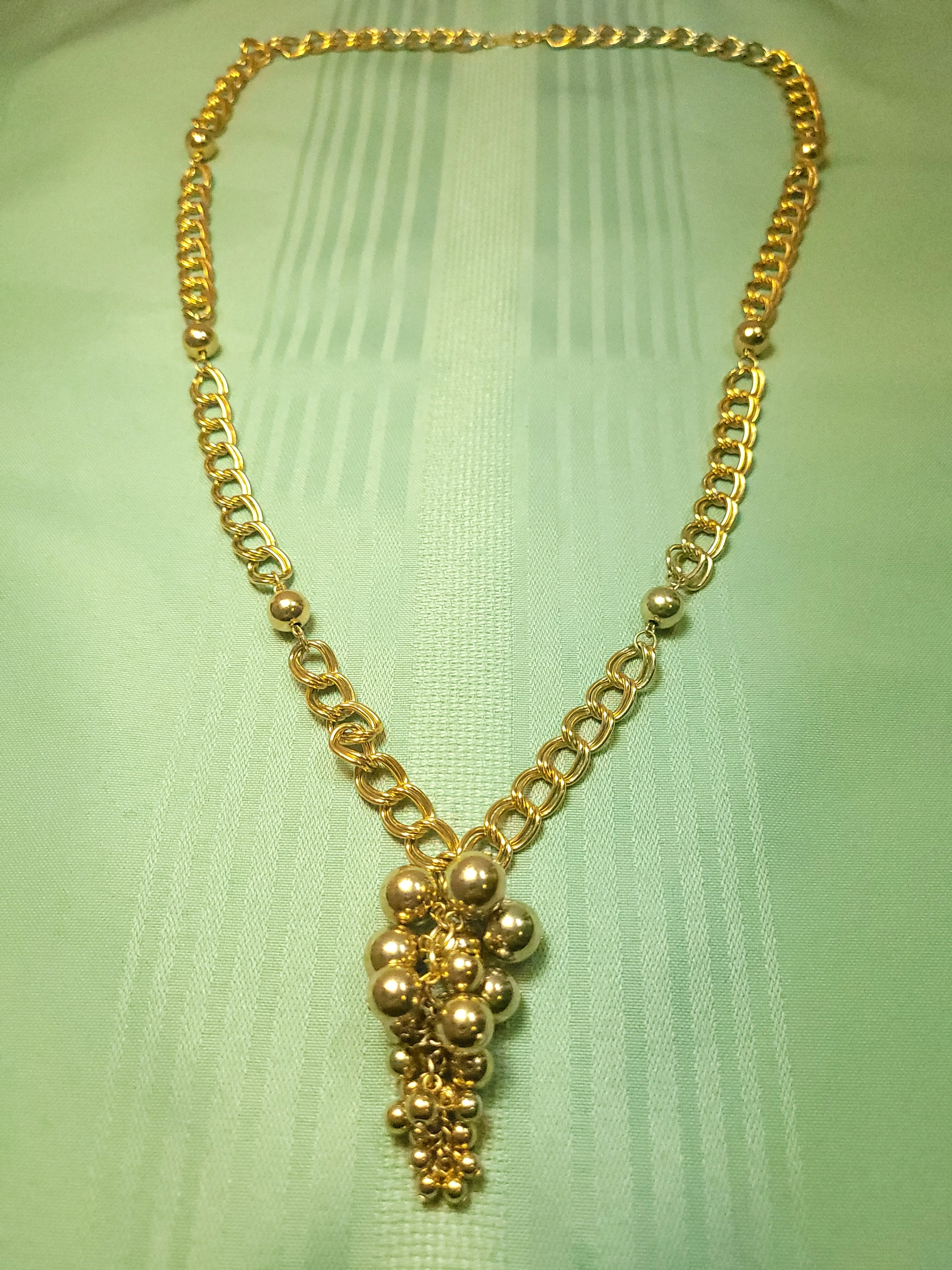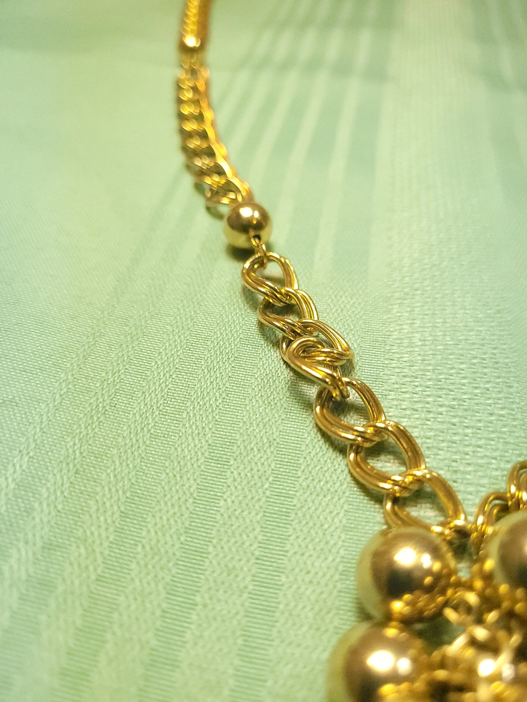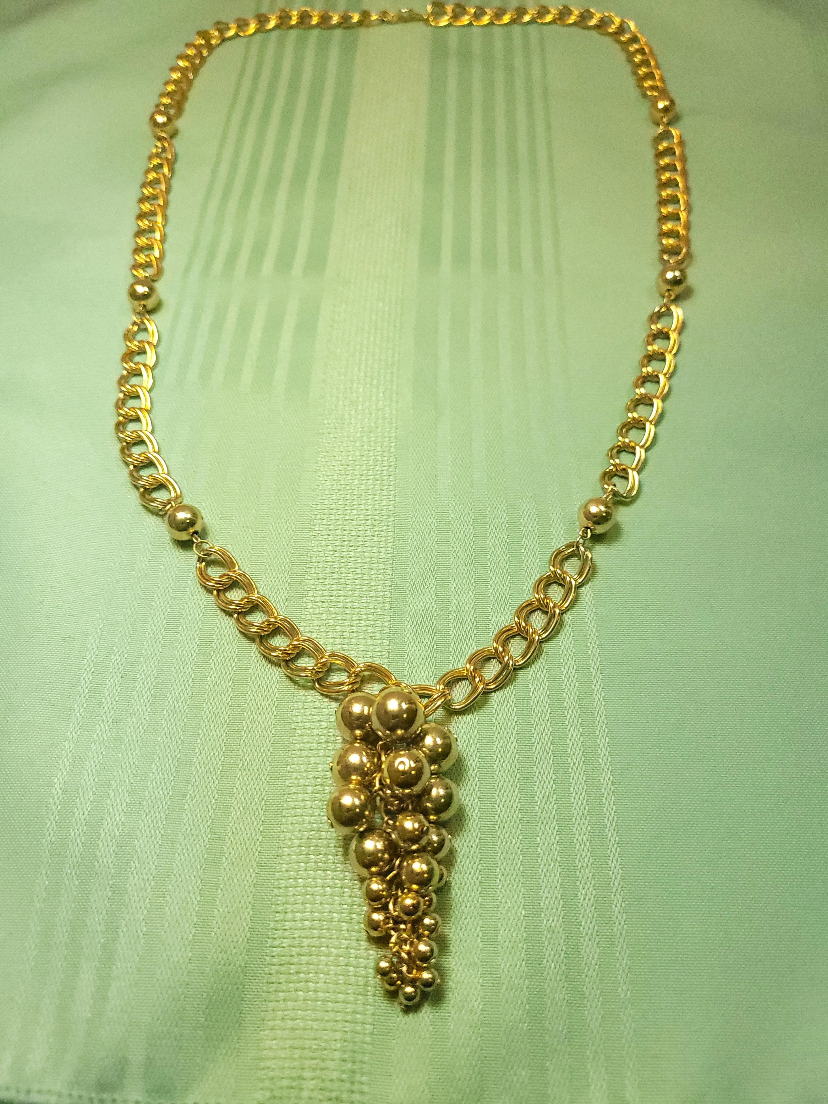 Step back into the early 1970s with this iconic "Golden Berries" statement necklace. This piece features a large, 2.5-inch dimensional cluster of polished gold-tone spheres (grapes) suspended from a substantial 32-inch textured rope chain.