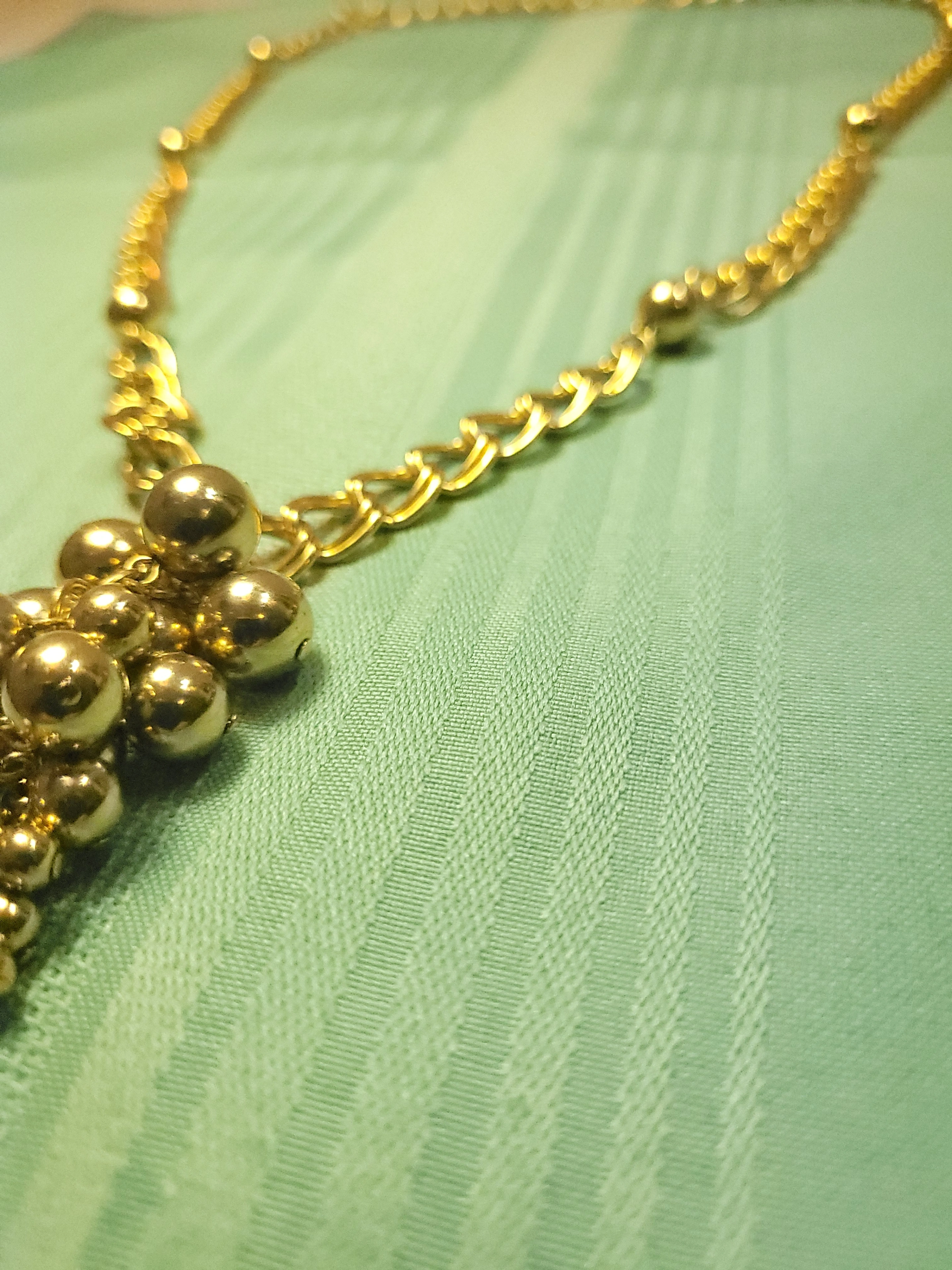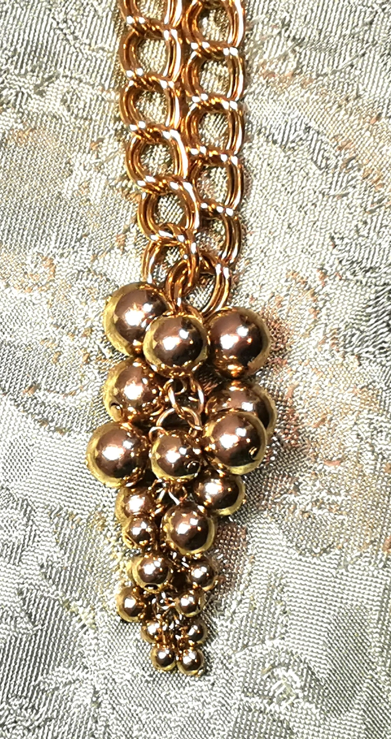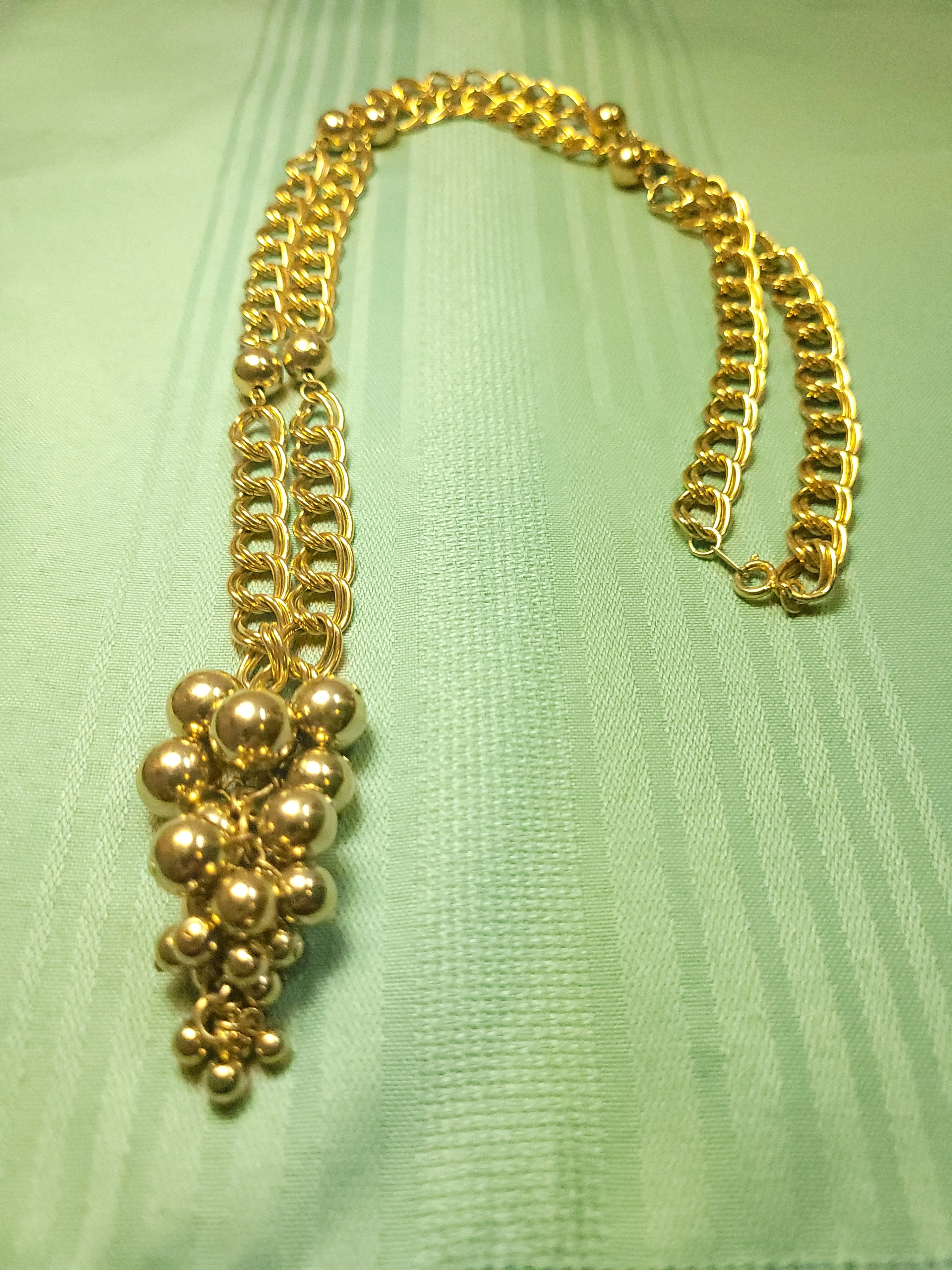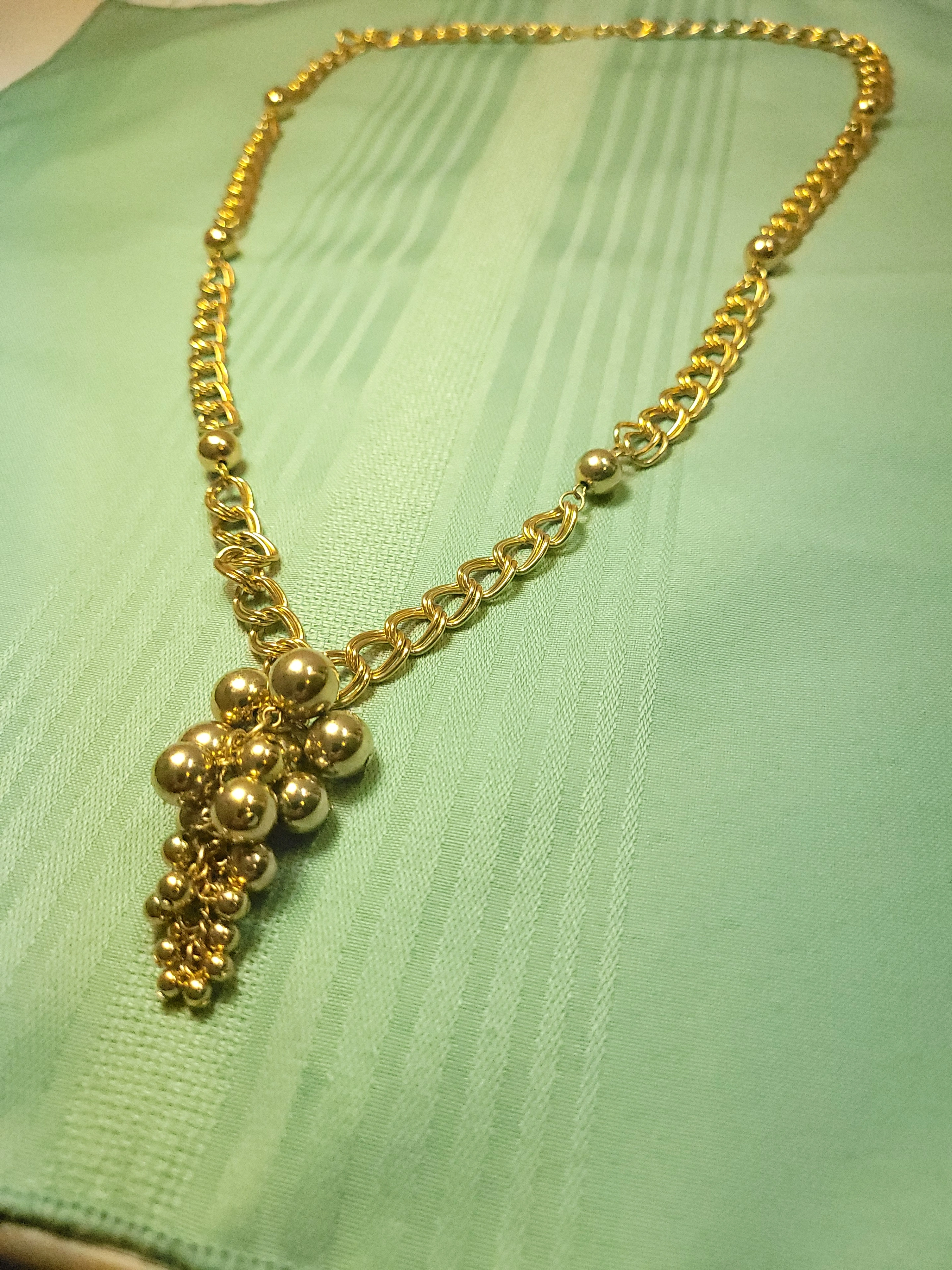 Step back into the early 1970s with this iconic "Golden Berries" statement necklace. This piece features a large, 2.5-inch dimensional cluster of polished gold-tone spheres (grapes) suspended from a substantial 32-inch textured rope chain.