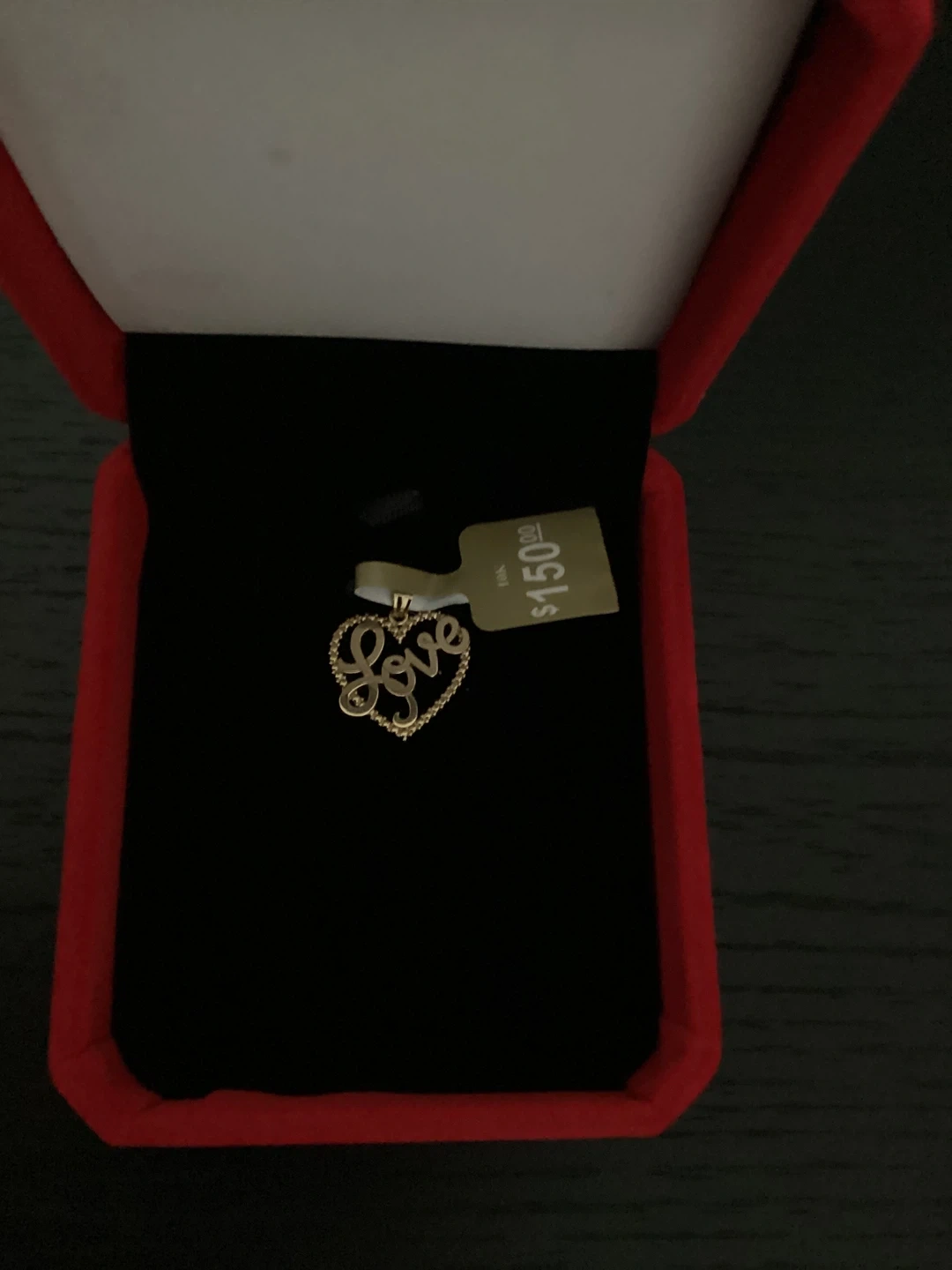 Selling a cute "Love" heart pendant necklace. It's gold in color and comes in a red box. The tag shows it was originally $150