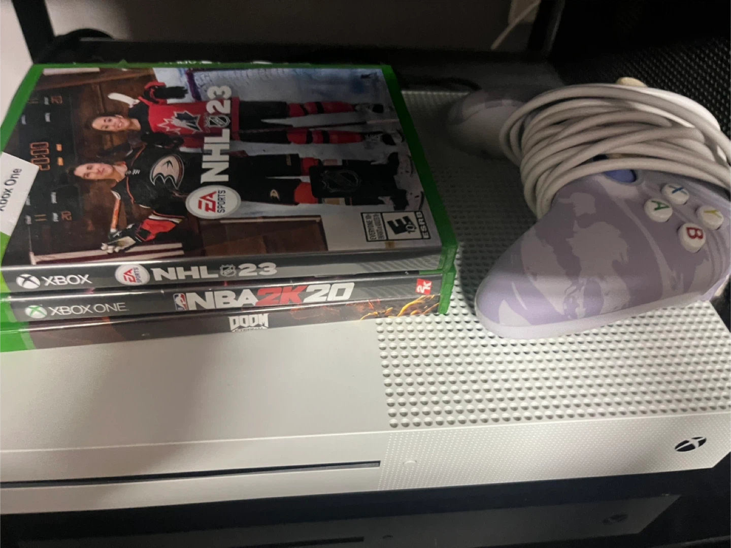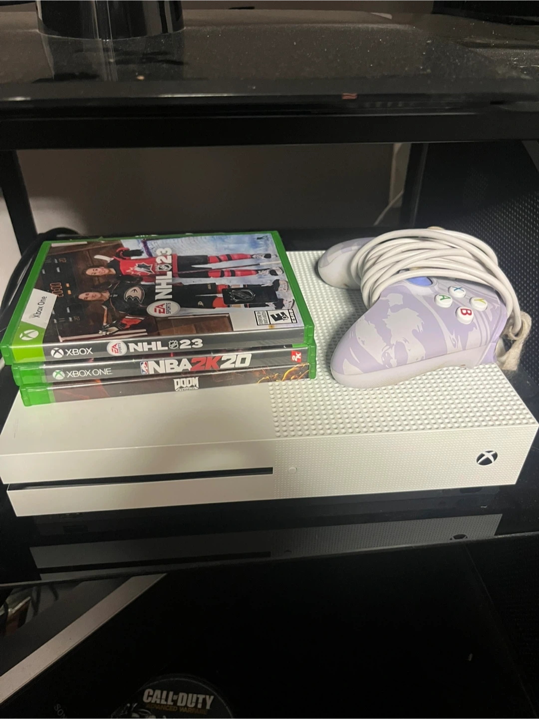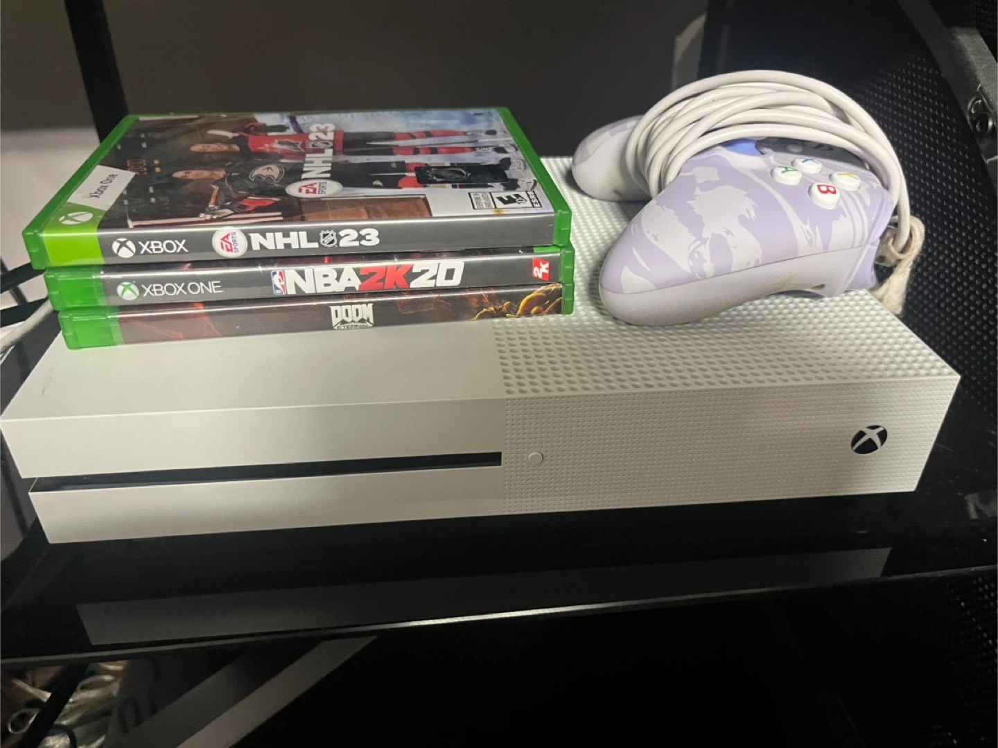 Selling an Xbox One S console in great condition! Comes with a pink and white controller, and a black and grey camo one not pictured in the ad, so 2 total.