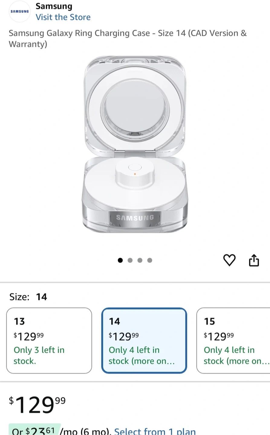 Selling a Samsung Galaxy Ring charging case, size 14. It comes with the box and charging cable. Retails for $129.99