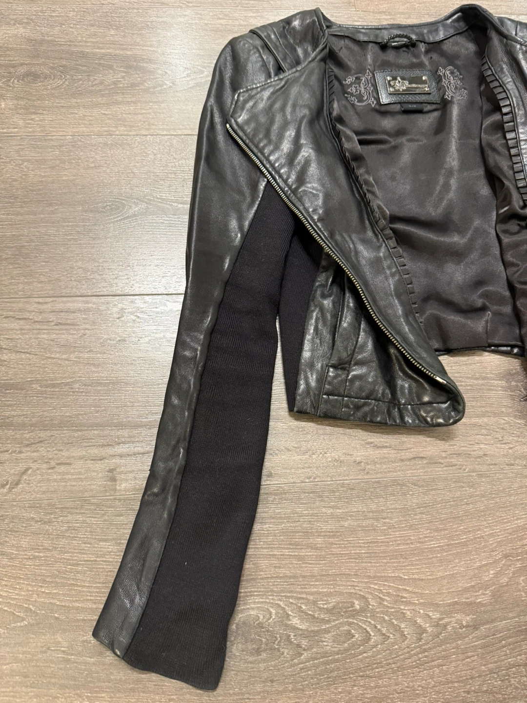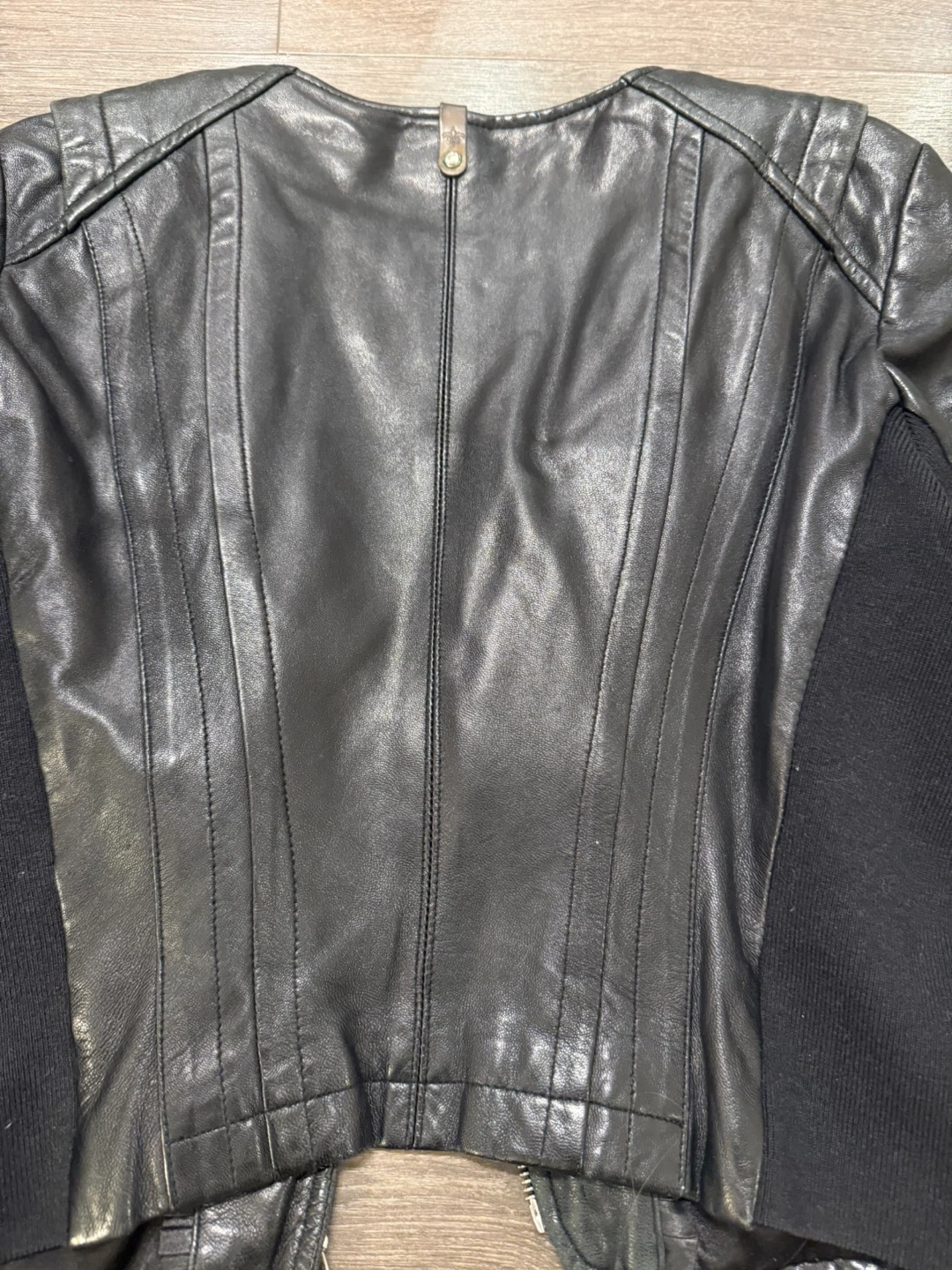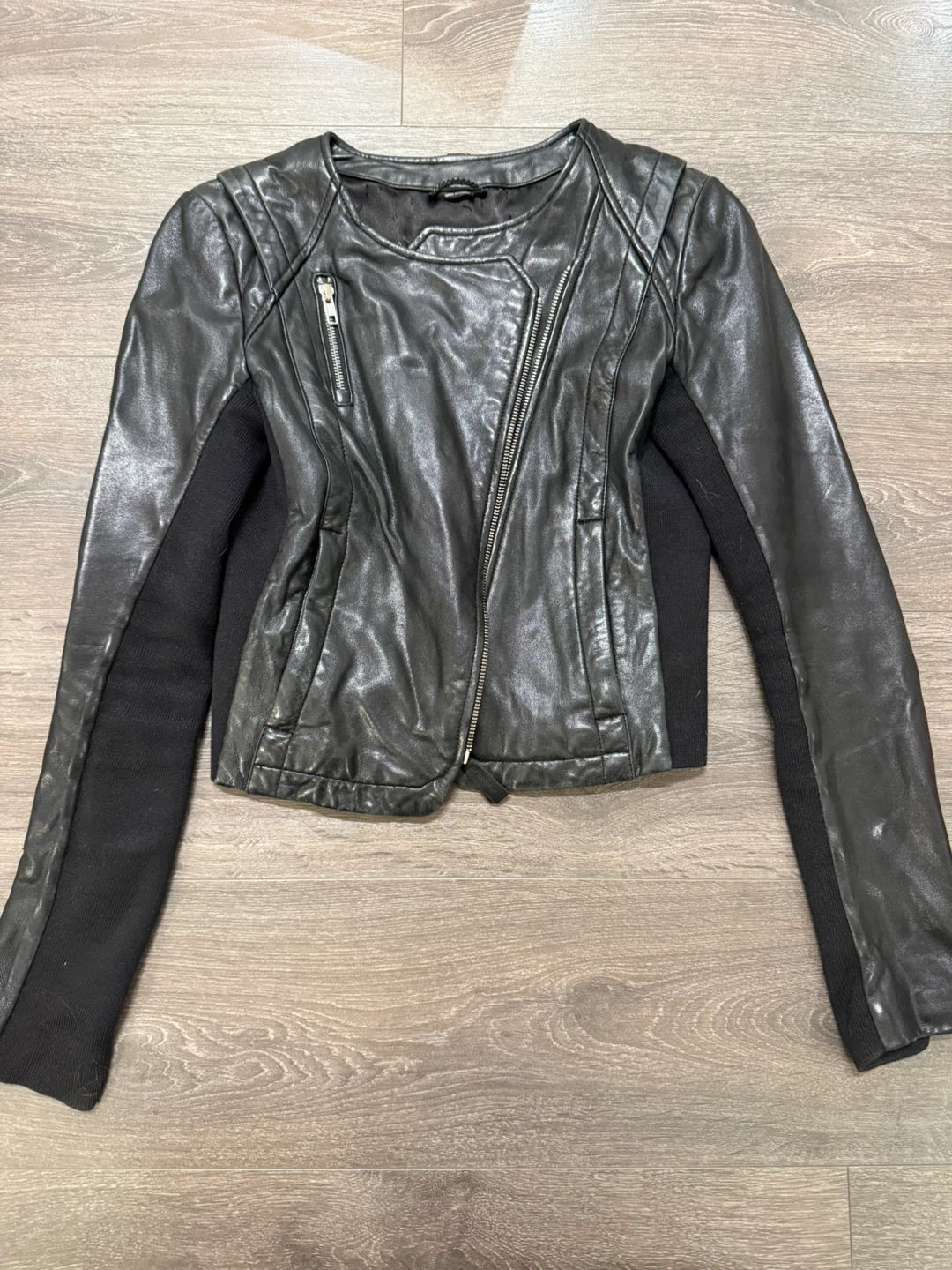 Selling a stylish Mackage black leather jacket in size small! It features an asymmetrical zipper and a unique design with knit sleeves. Great for adding a bit of edge to any outfit!