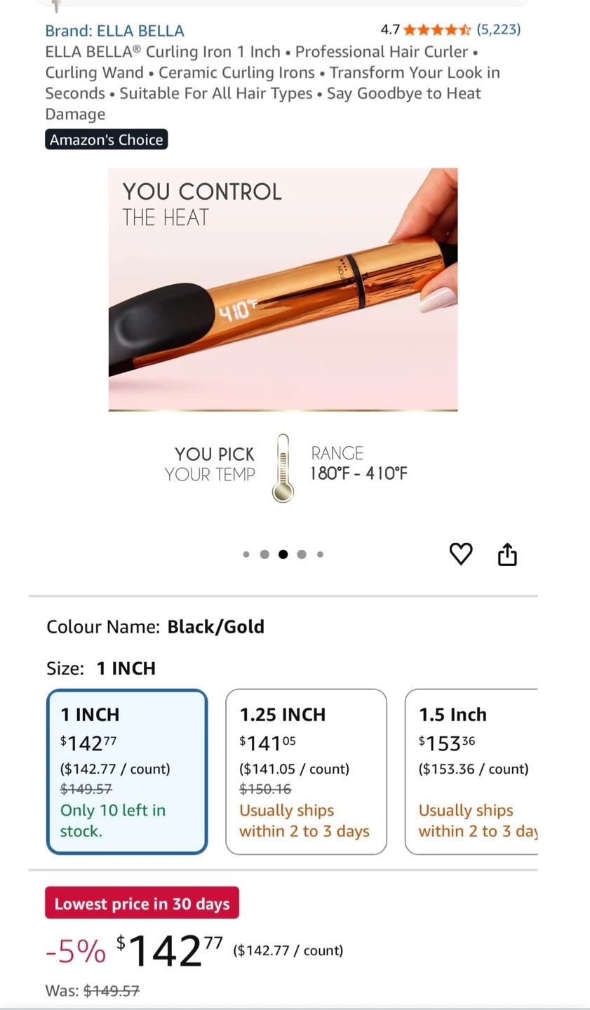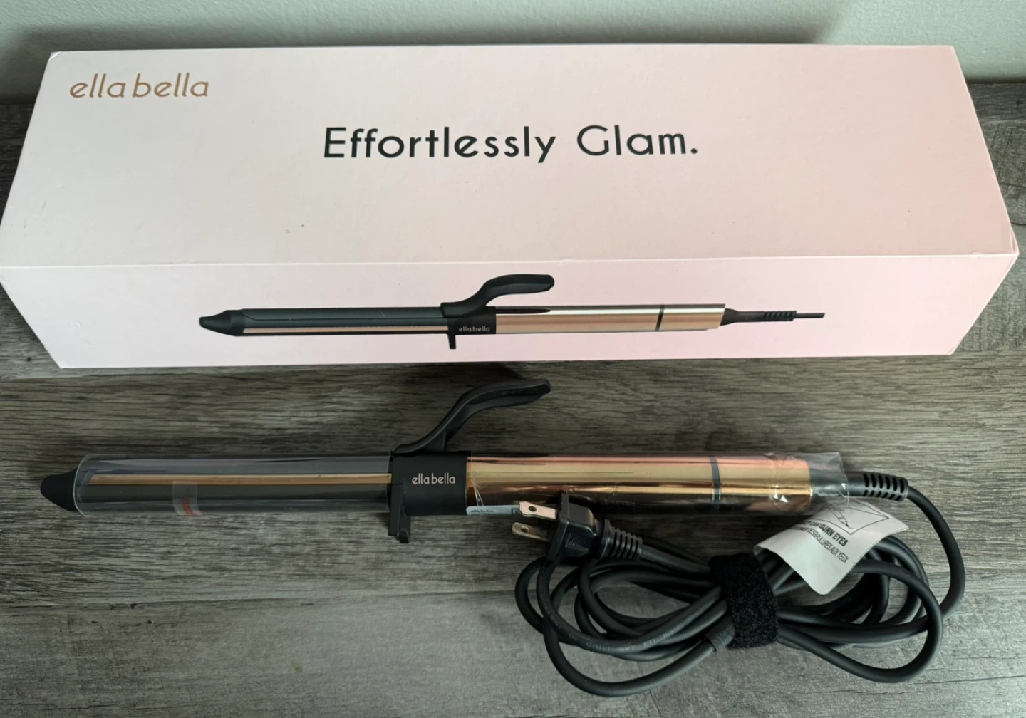 I'm selling a brand new ELLA BELLA curling iron, still in its stylish gift box! This is the 1-inch professional hair curler in black and gold.