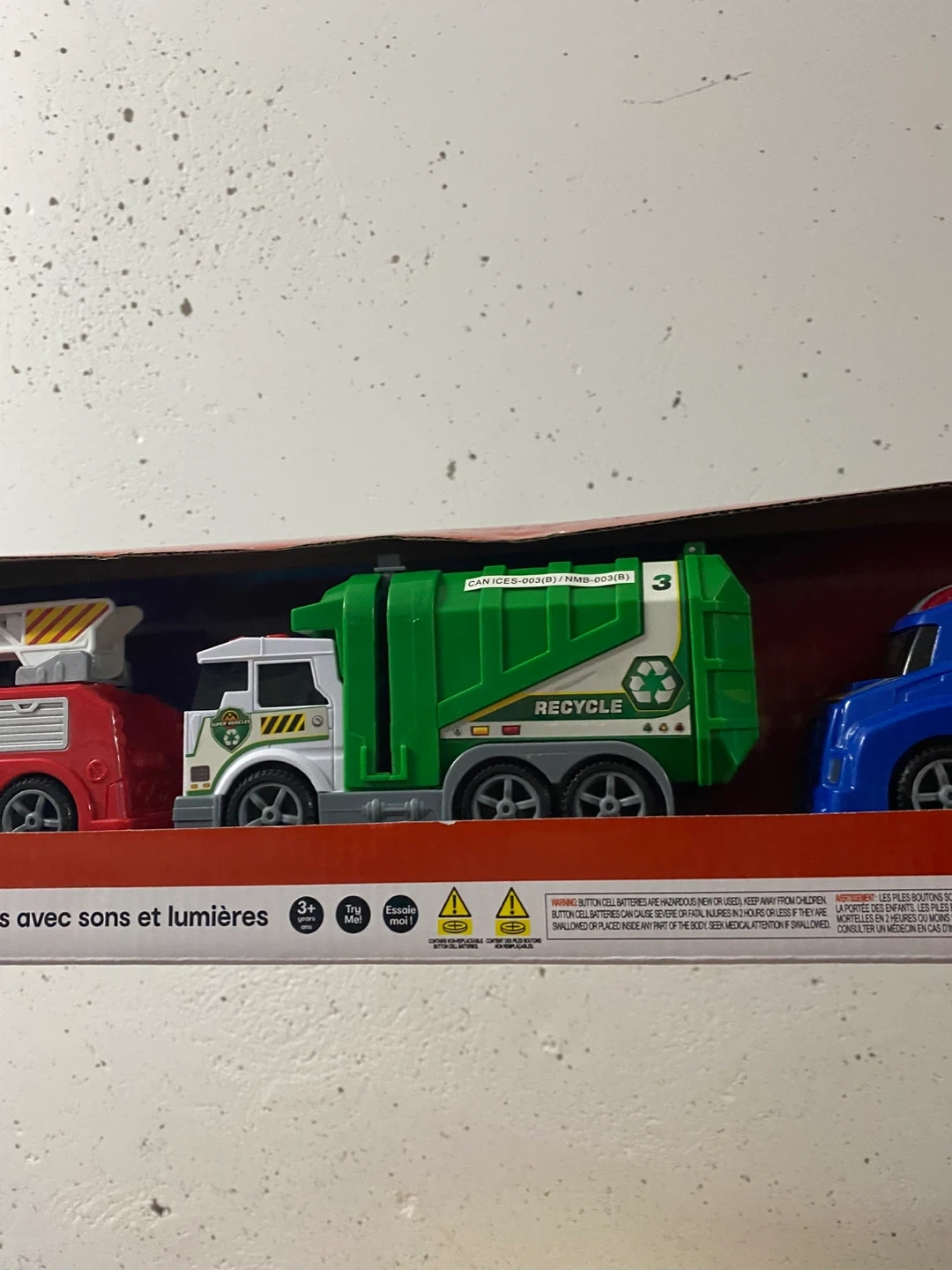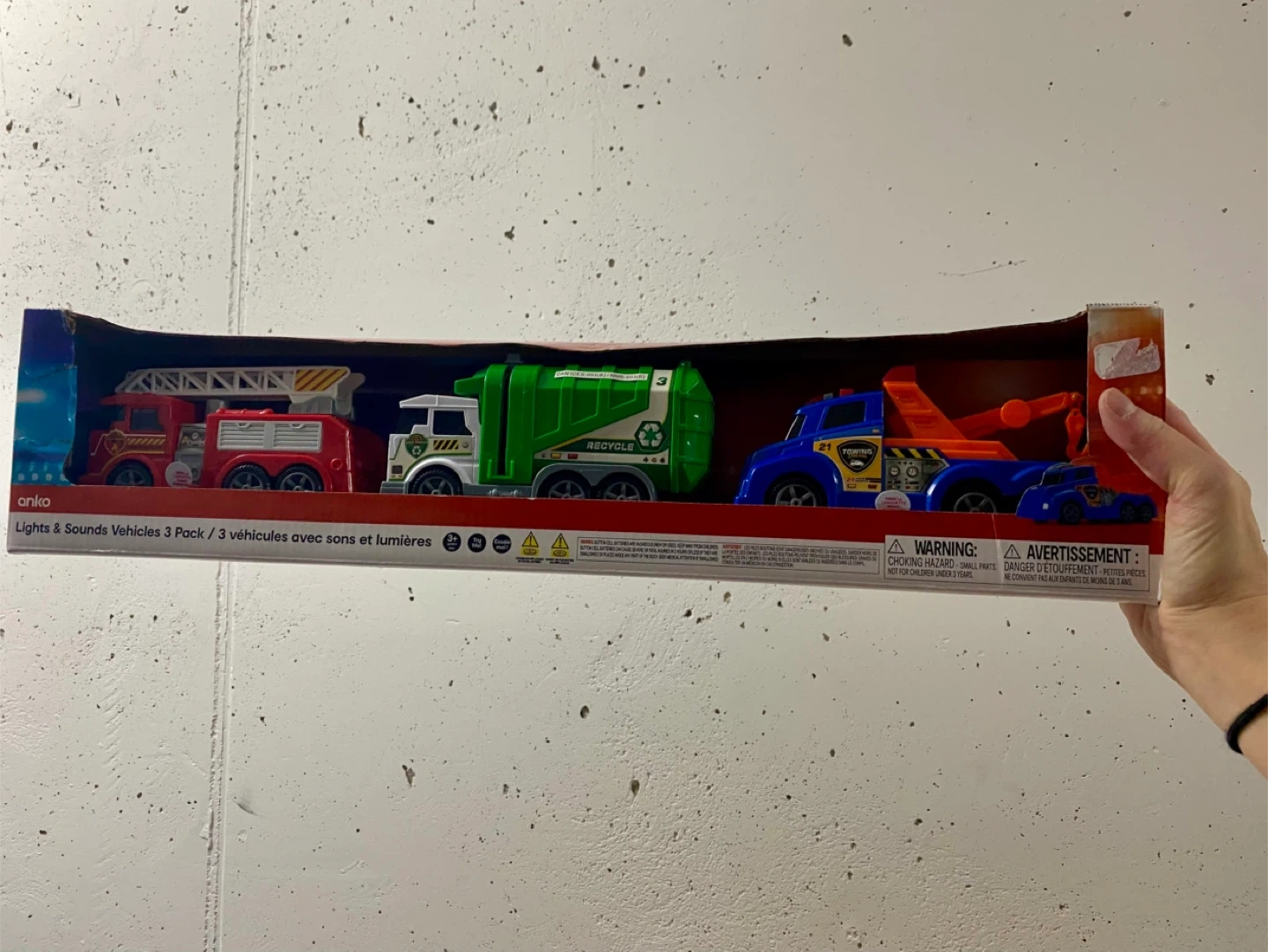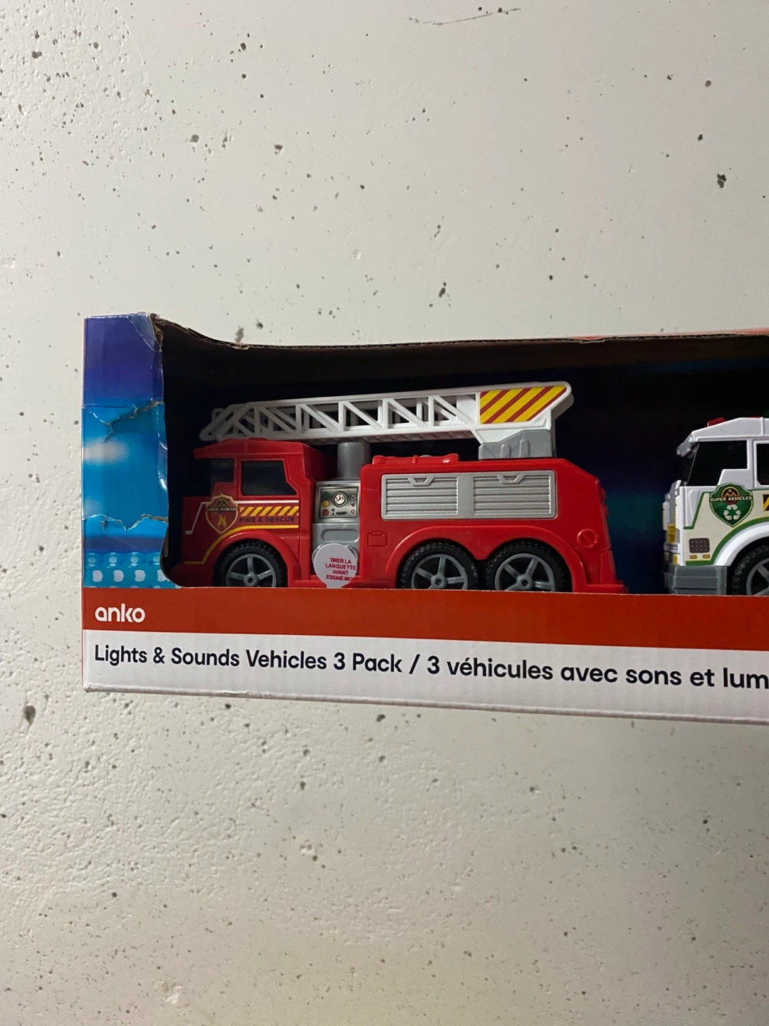 Selling a brand new Anko Lights & Sounds Vehicles 3 Pack, still in its original packaging! This set includes a fire truck, a recycle truck, and a tow truck, all with fun lights and sounds. Perfect for kids who love vehicles!