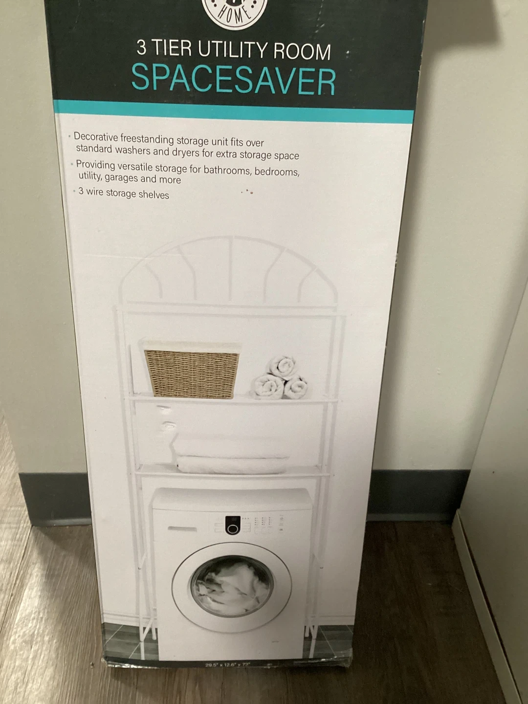 Selling a 3 Tier Utility Room Spacesaver! It's a decorative freestanding storage unit designed to fit over standard washers and dryers, perfect for adding extra storage to bathrooms, bedrooms, utility rooms, garages, and more. Includes 3 wire storage shelves