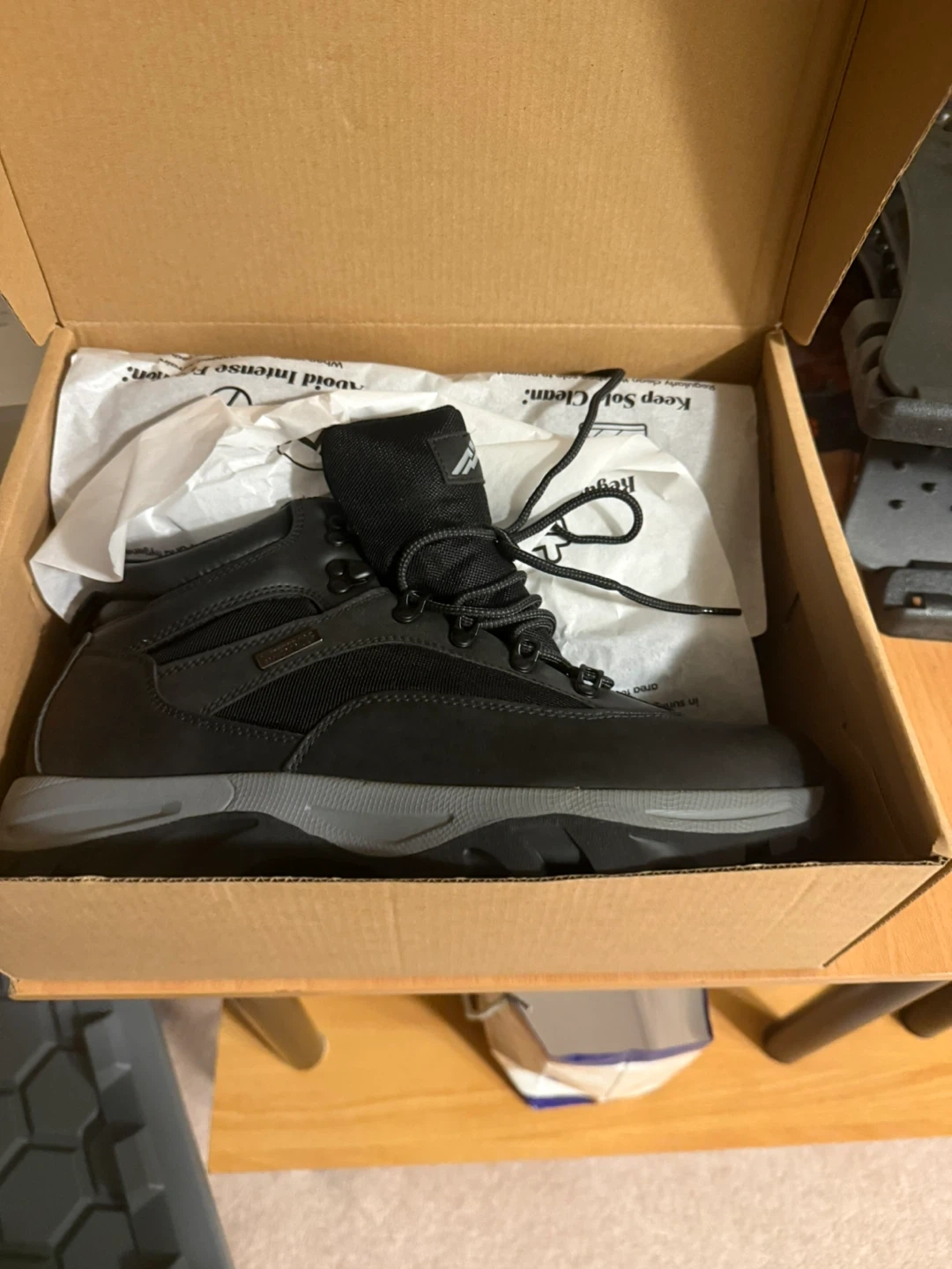 Selling a pair of men's black hiking boots. They come in the original box. Great for outdoor adventures!