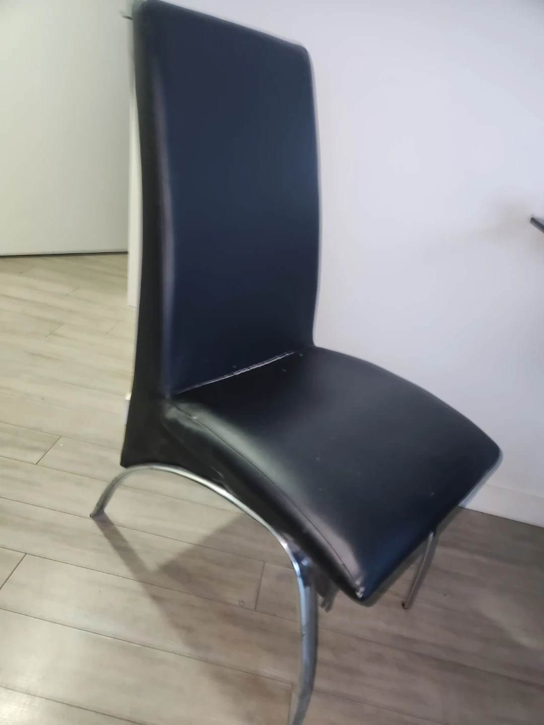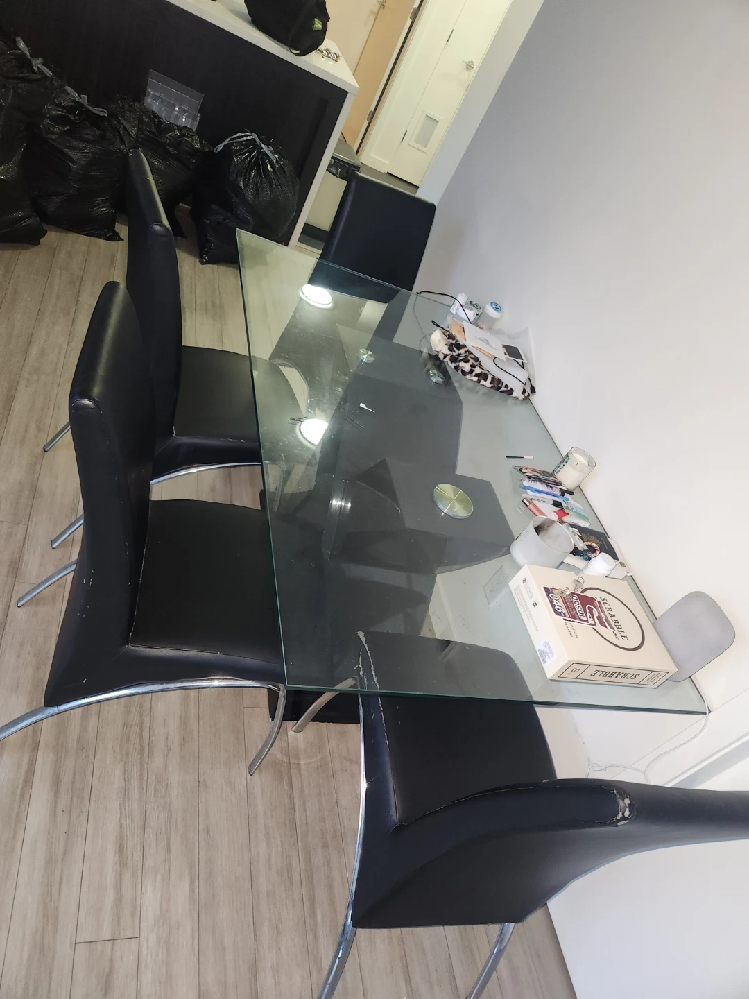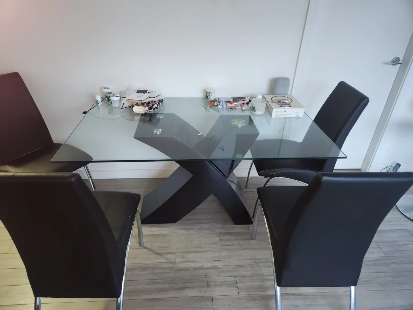 $150- dining table with a glass top and a unique X-shaped base! It comes with four sleek black chairs - heavy glass table chair are slightly worn as pics show
