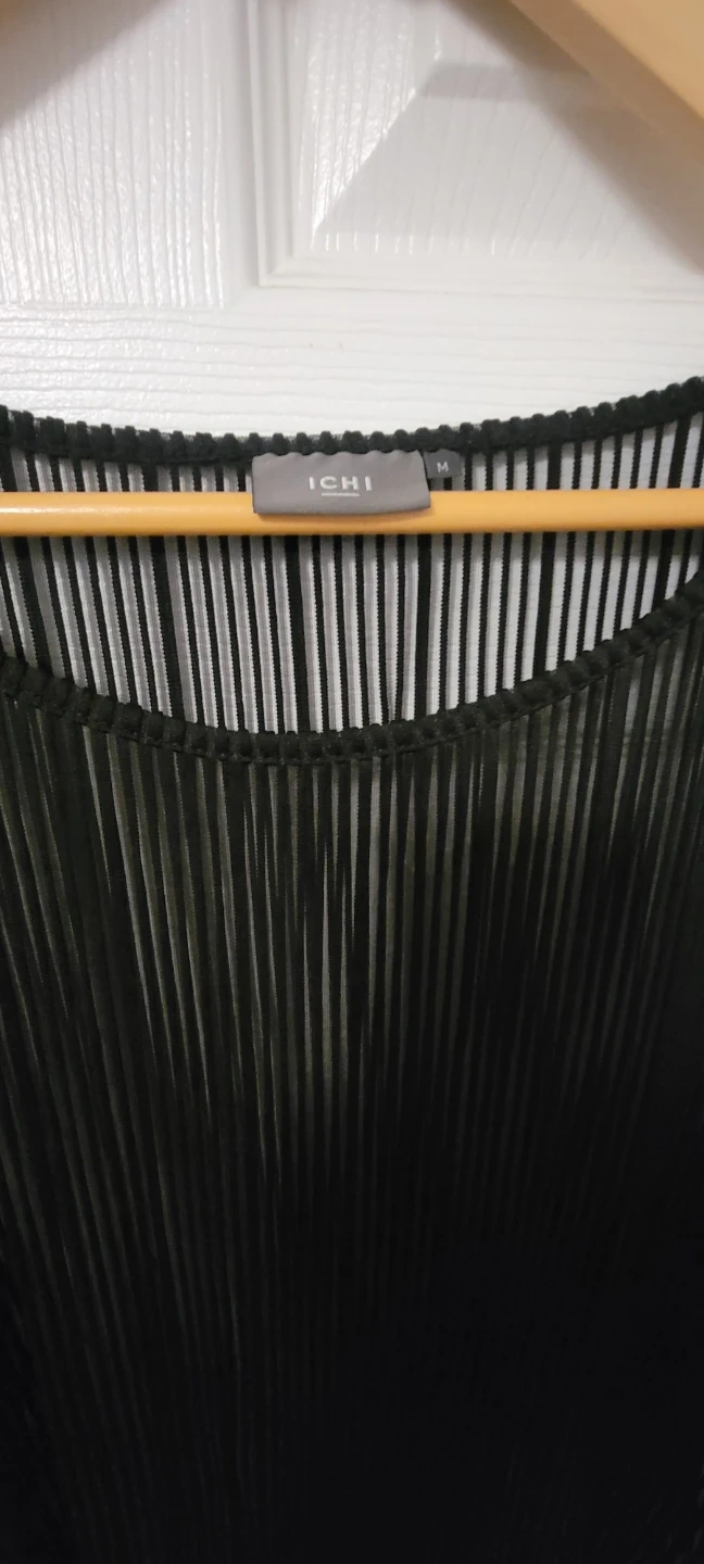 Selling a stylish ICHI black pleated top in size M. This top features a unique design with vertical pleats and a sheer, net-like texture. Perfect for adding a touch of elegance to any outfit!
