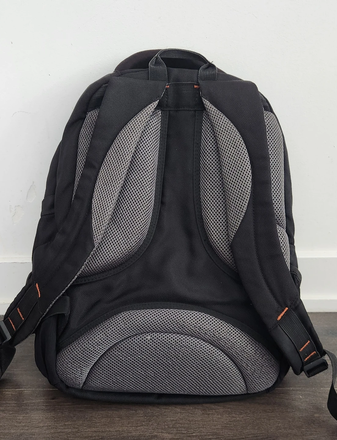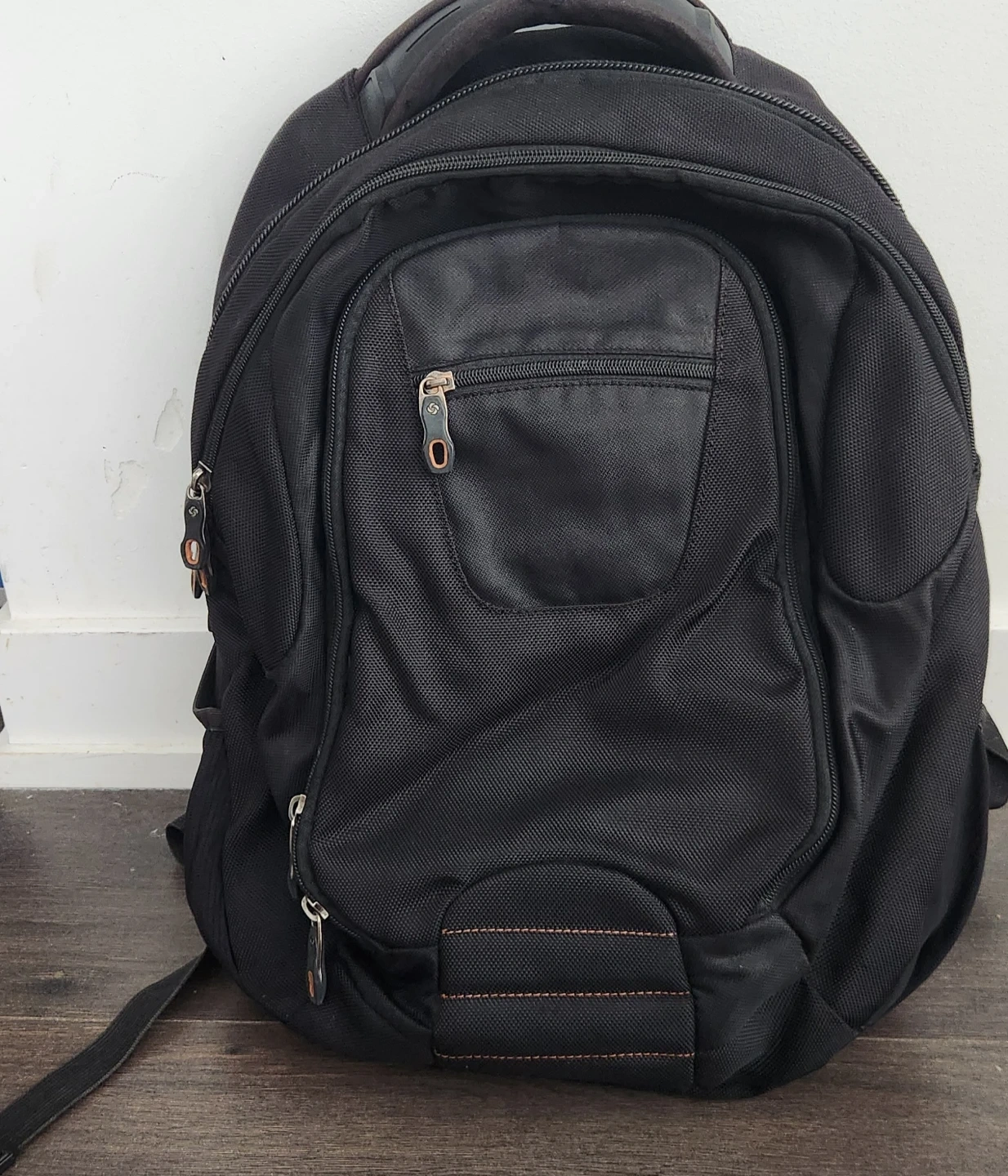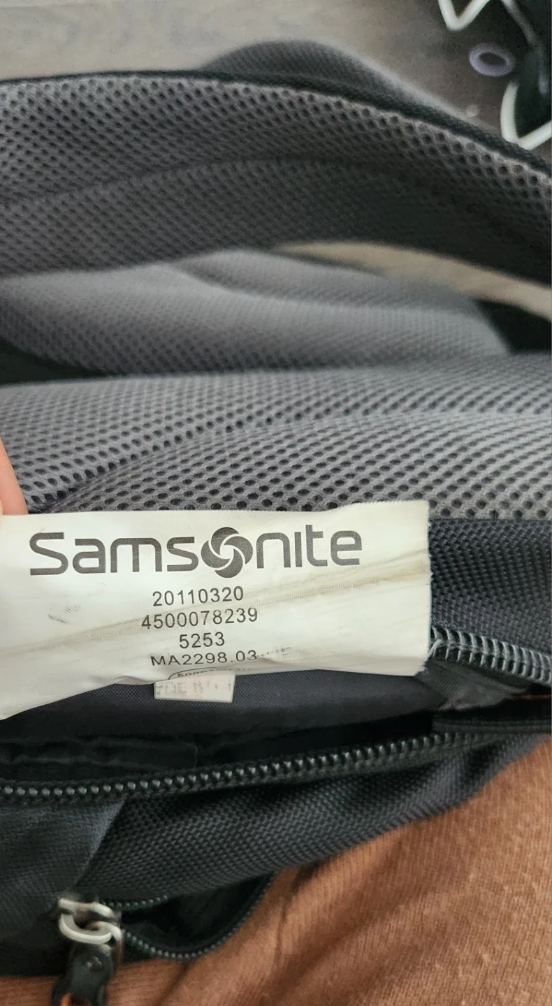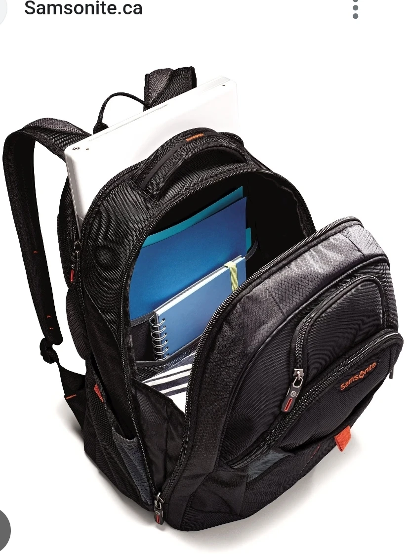 This is a Samsonite backpack in black. It has a few signs of wear, as shown in the pictures, but is still very functional. It's great for school, work, or travel. It has lots of compartments for organizing your belongings.