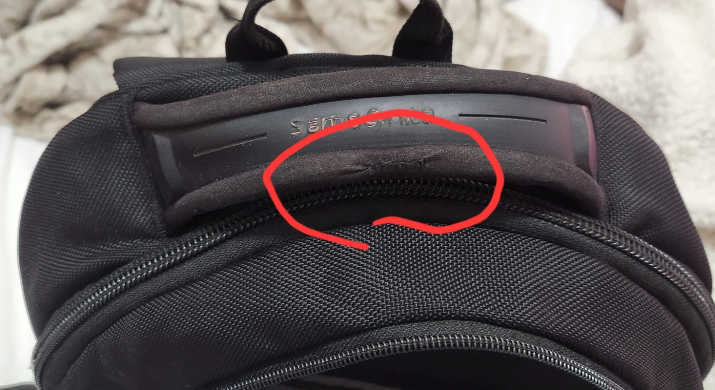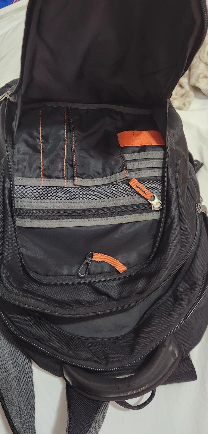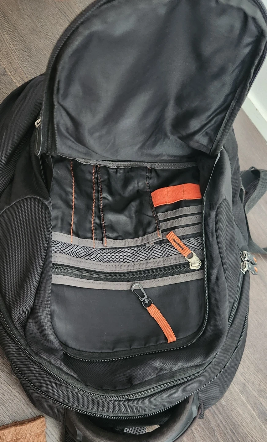 This is a Samsonite backpack in black. It has a few signs of wear, as shown in the pictures, but is still very functional. It's great for school, work, or travel. It has lots of compartments for organizing your belongings.