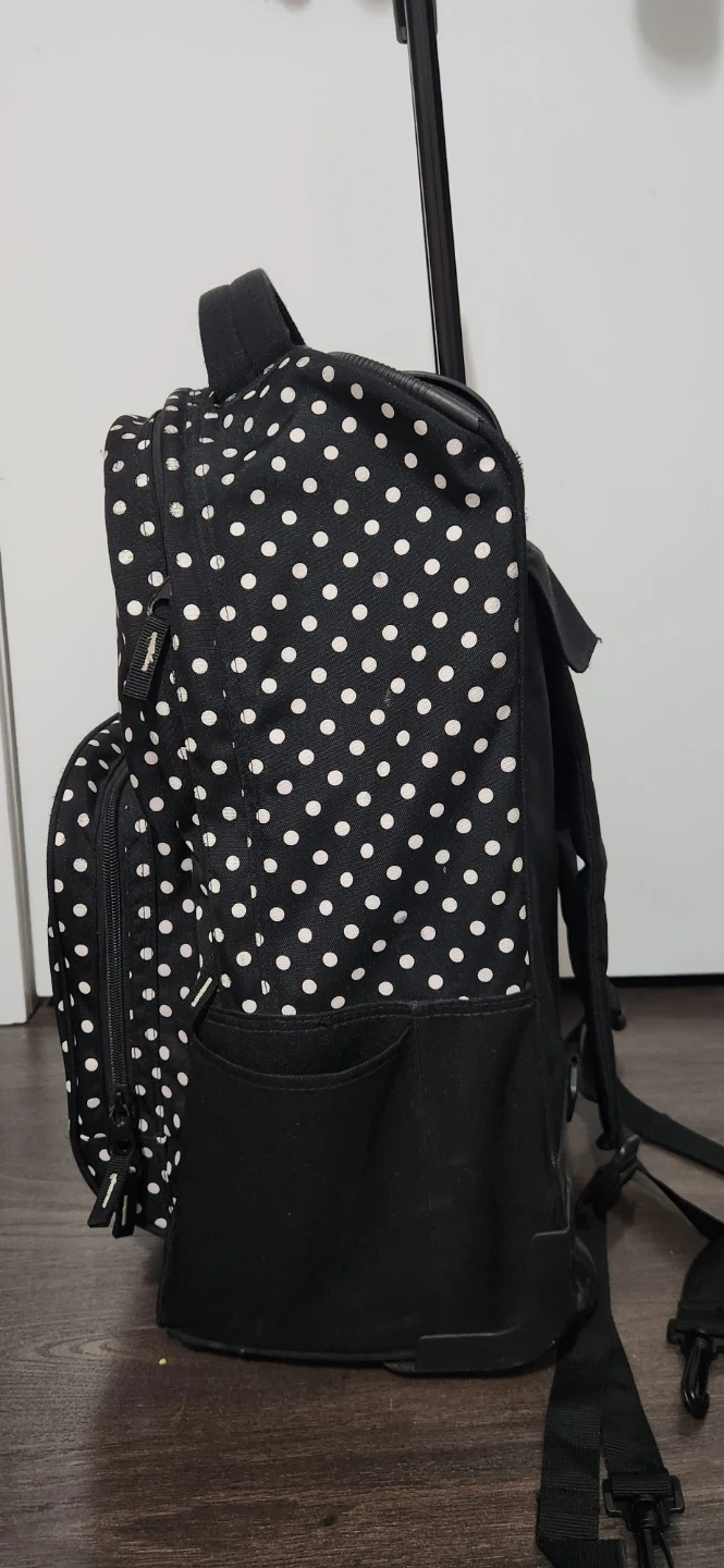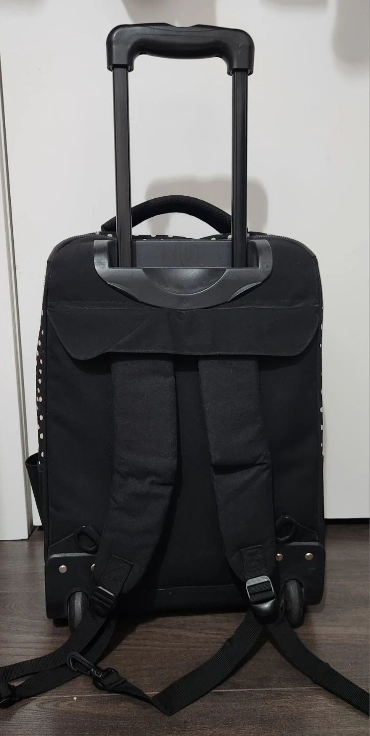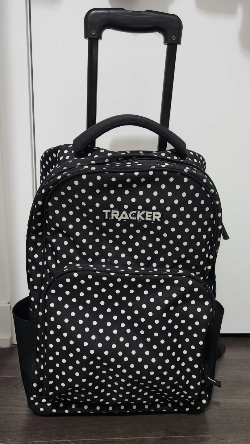 This is a Tracker rolling backpack in black with white polka dots. It has a retractable handle and wheels for easy transport, plus shoulder straps if you prefer to carry it as a backpack. It's in good condition and ready for its next adventure.