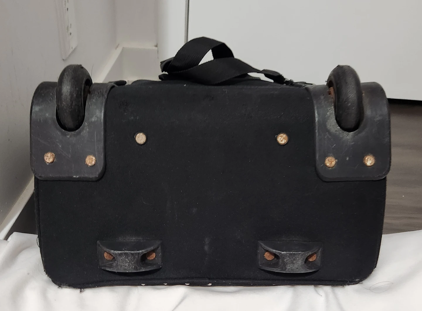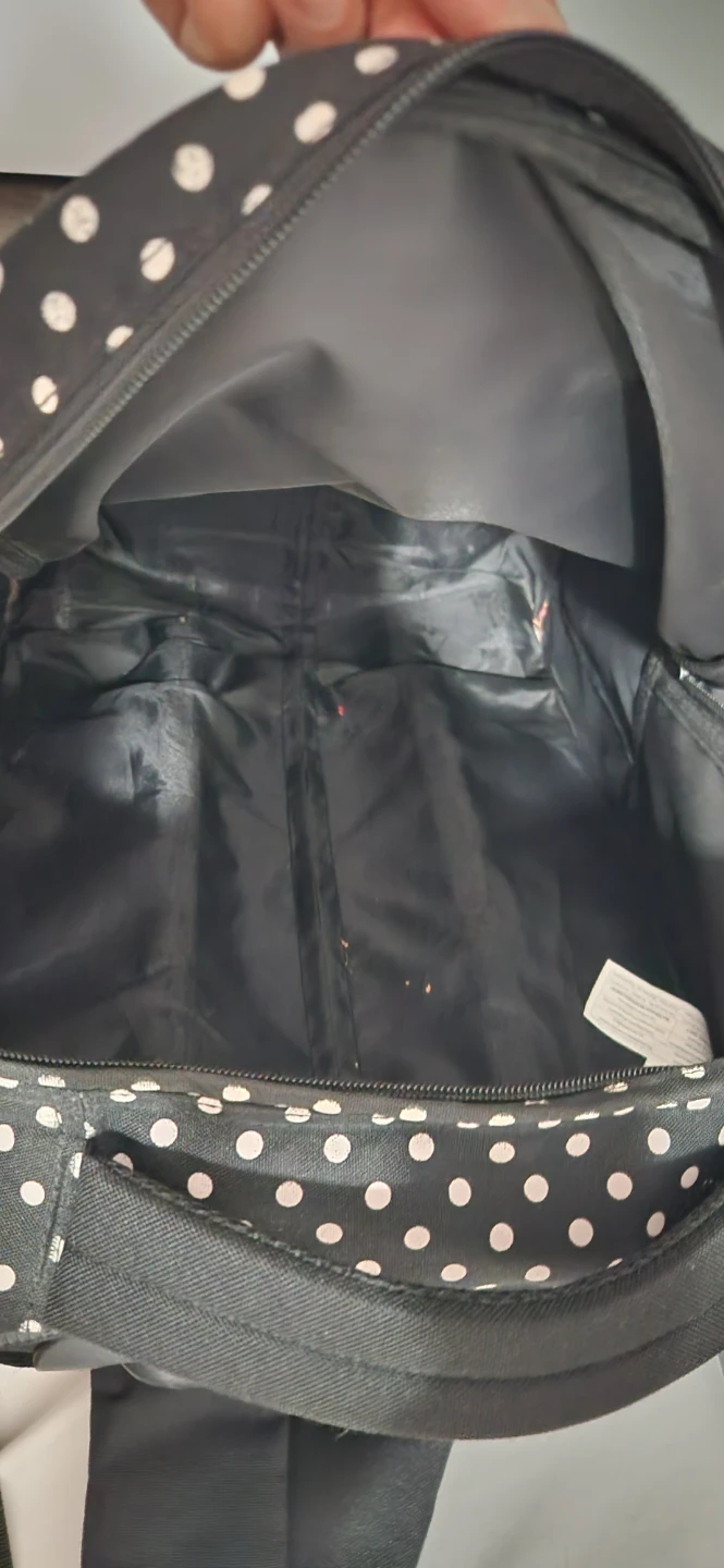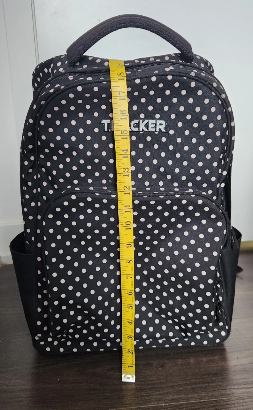 This is a Tracker rolling backpack in black with white polka dots. It has a retractable handle and wheels for easy transport, plus shoulder straps if you prefer to carry it as a backpack. It's in good condition and ready for its next adventure.