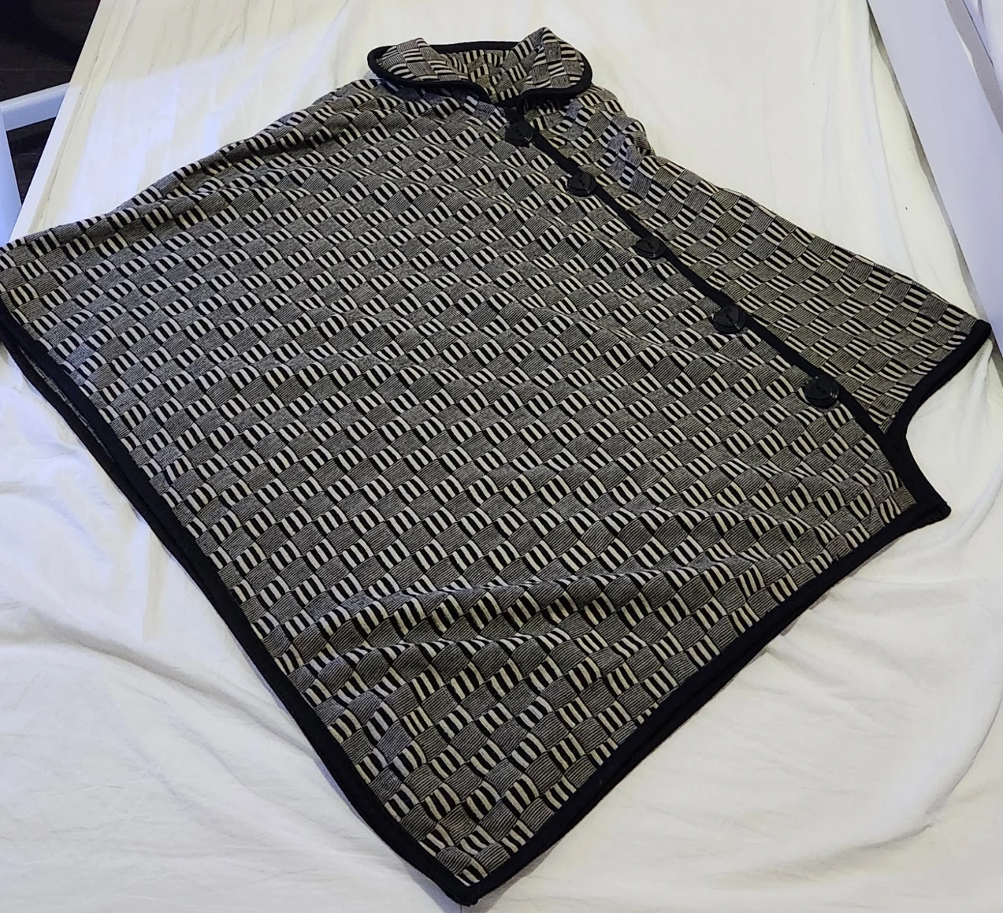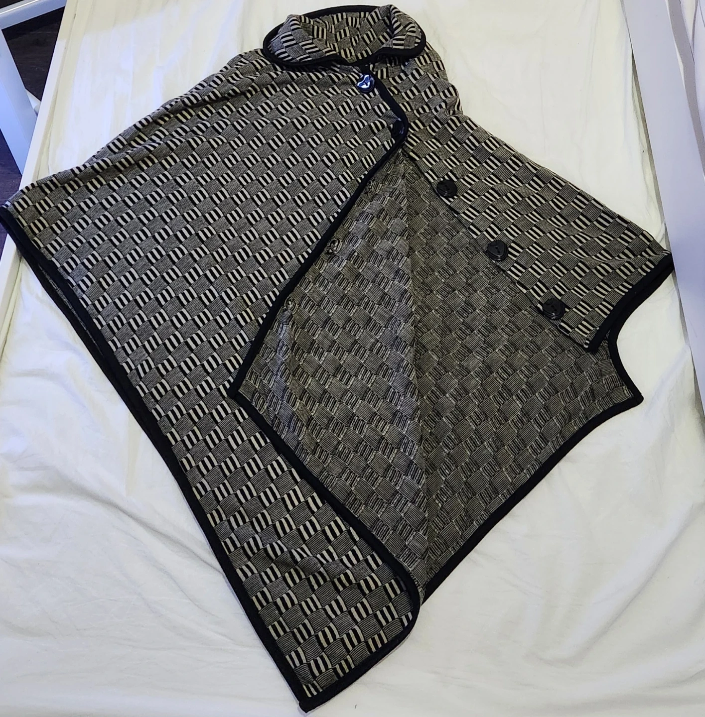 Selling a stylish poncho featuring a unique patterned design and button accents. It's in great condition and ready to add a touch of flair to your wardrobe! The neutral colour palette makes it easy to pair with any outfit.