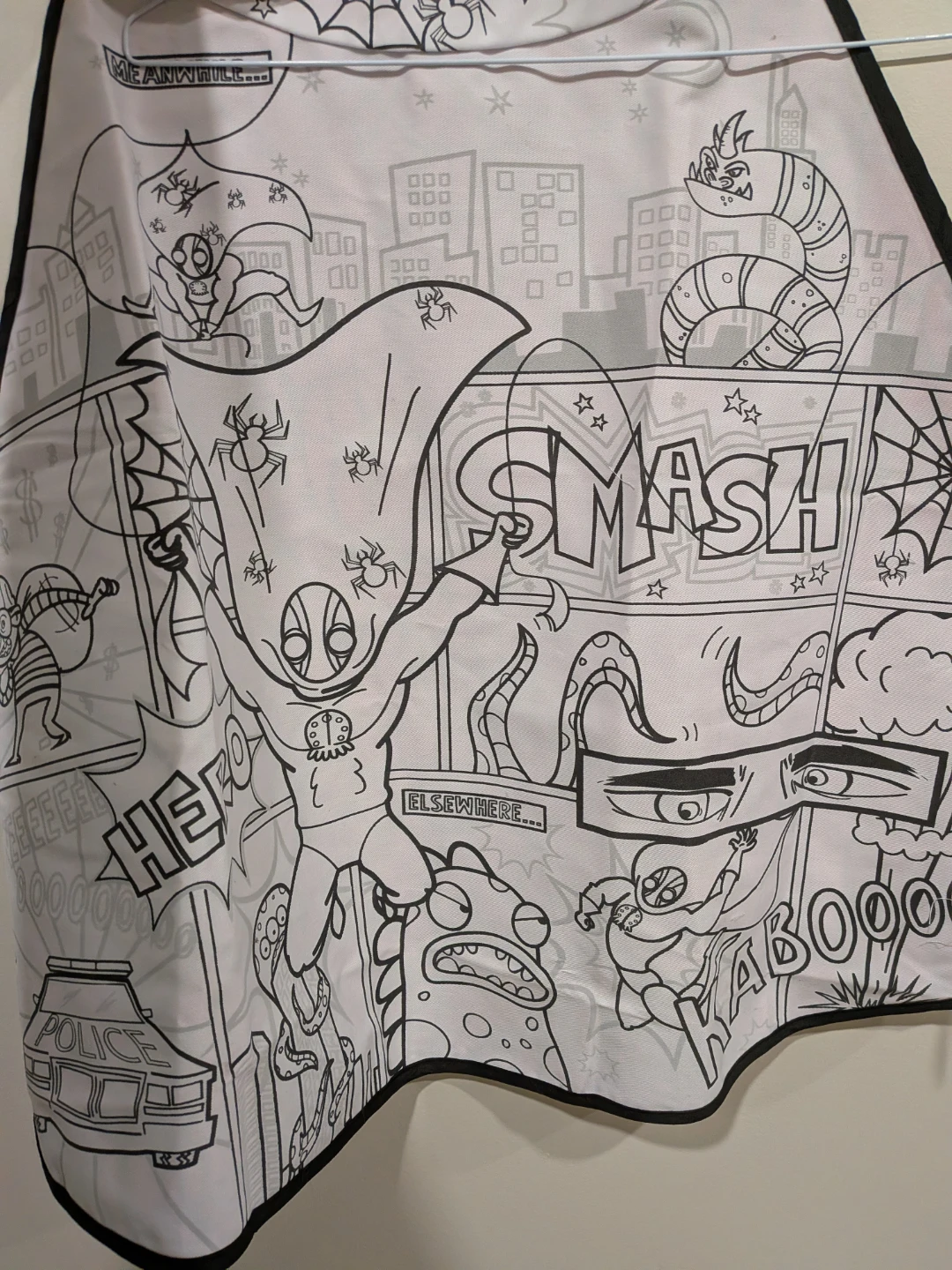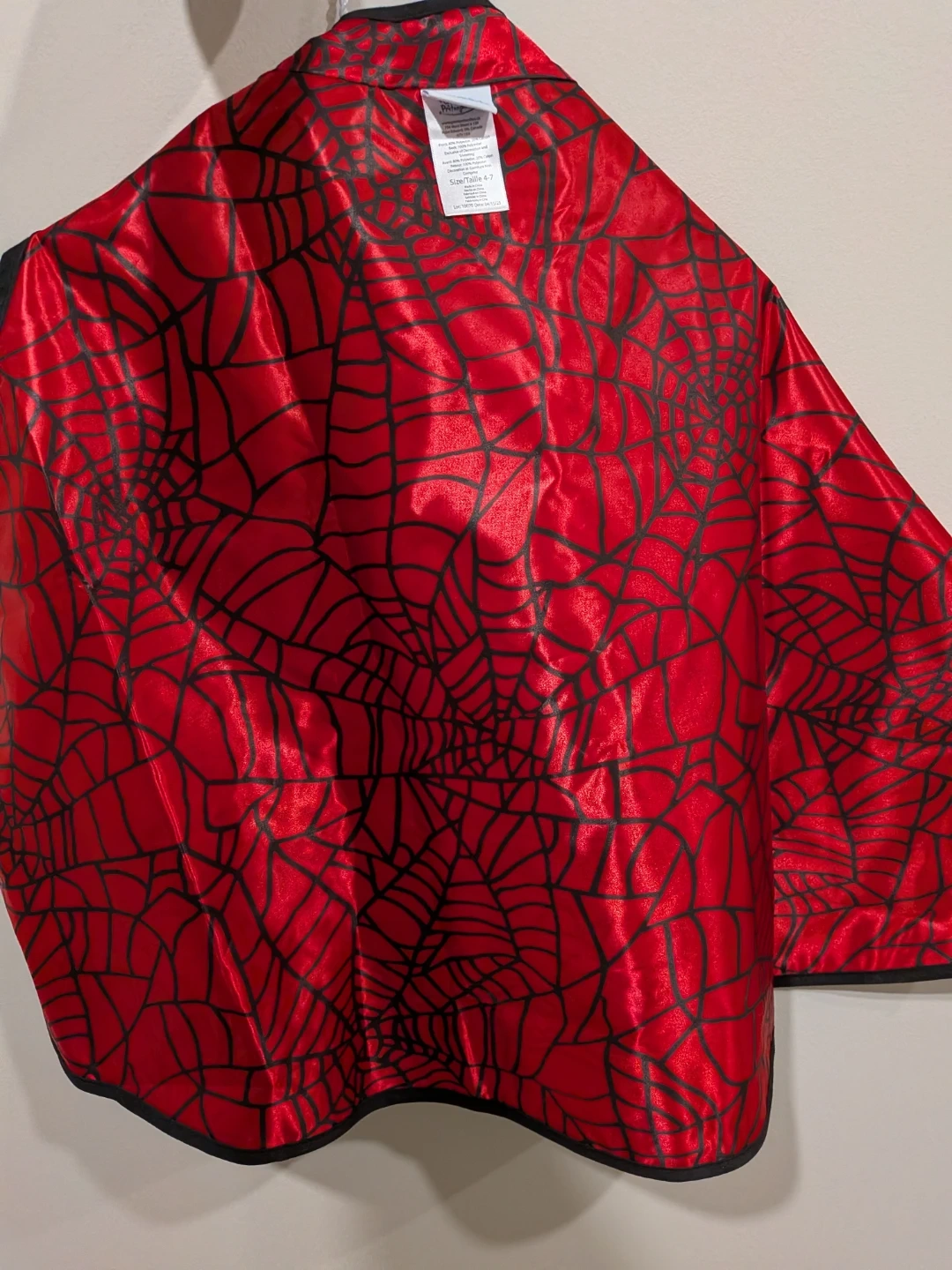 Check out this fun reversible cape! One side features a superhero comic book design in black and white, while the other side has a classic Spiderman web pattern in red and black. Perfect for dress-up or imaginative play!