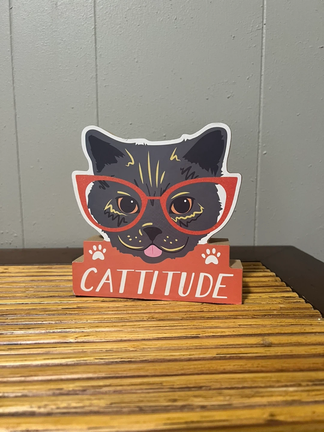Here's a cute table decor item featuring a black cat with red glasses and the word 'Cattitude' on a red base. It's a fun and quirky piece to add to your home decor!