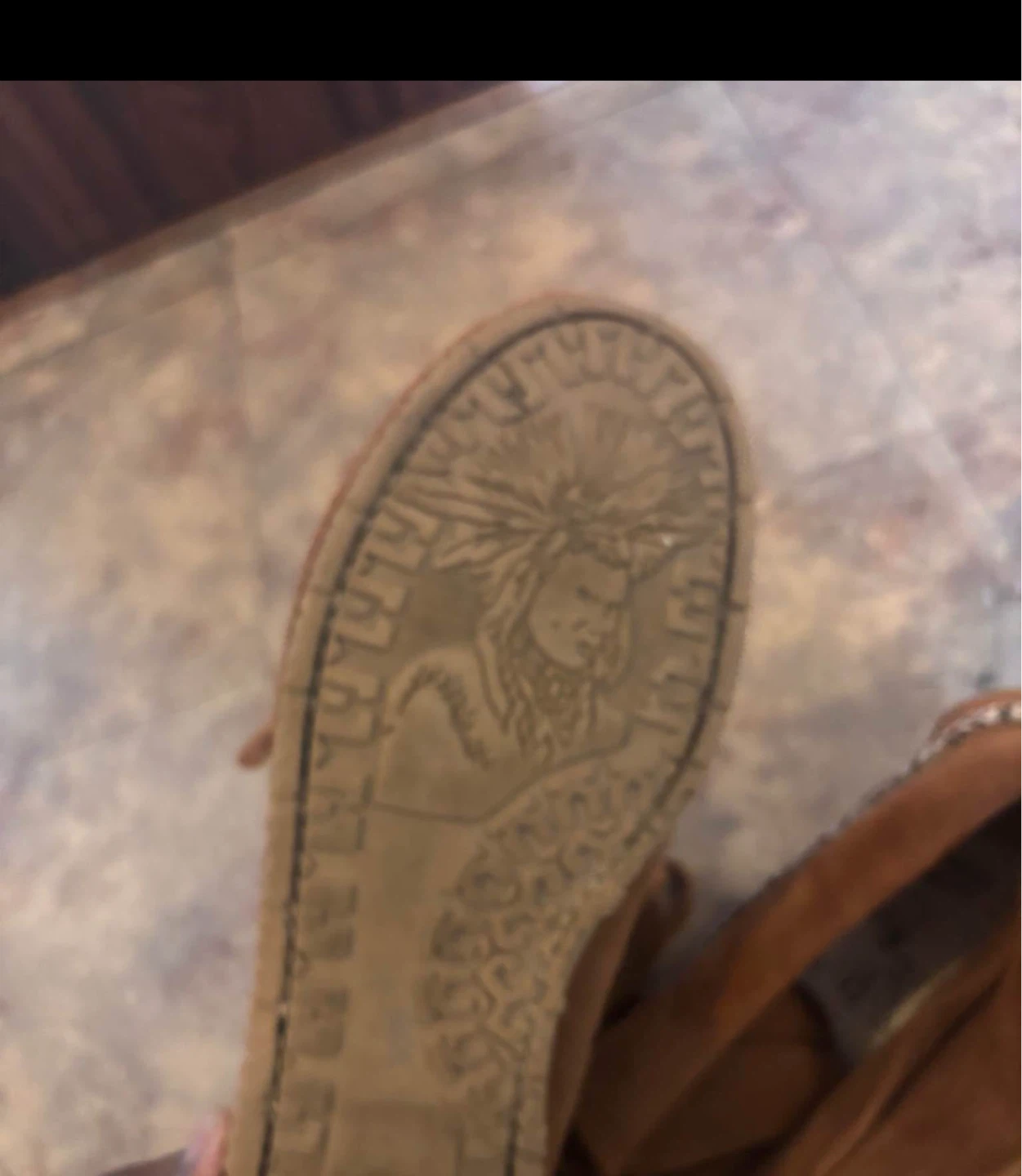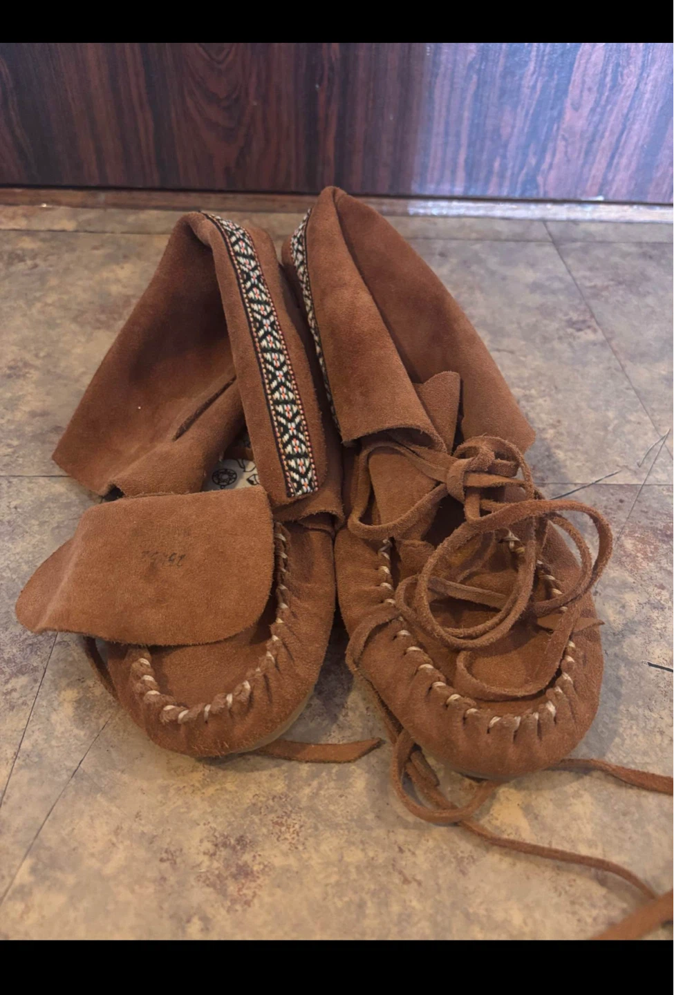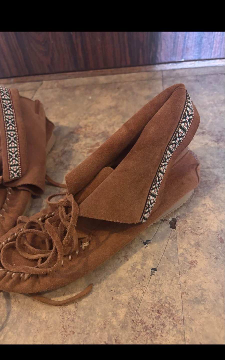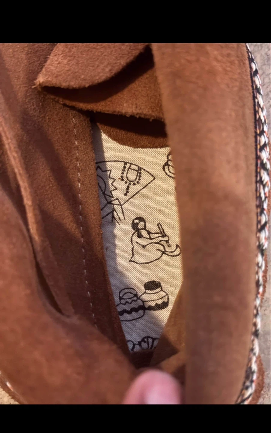 These moccasins are in great shape and ready for a new adventure! They're a soft brown suede with a decorative trim. The inside has a cute pattern of Native American figures and pottery. Perfect for cozy days inside or a stylish casual look