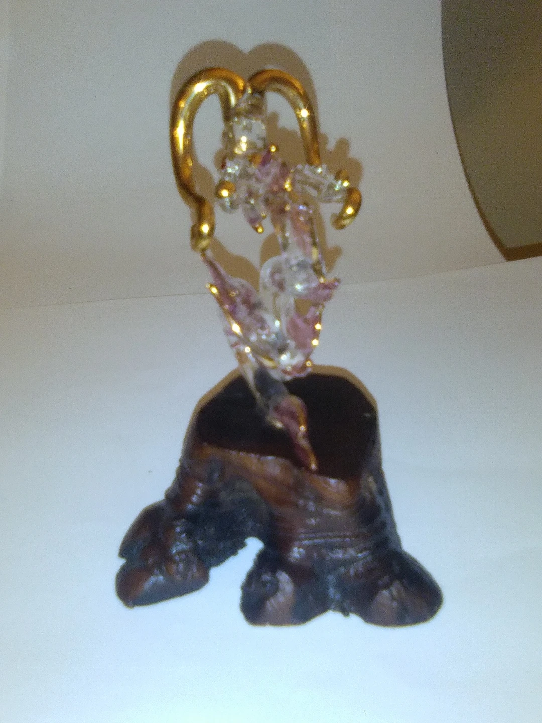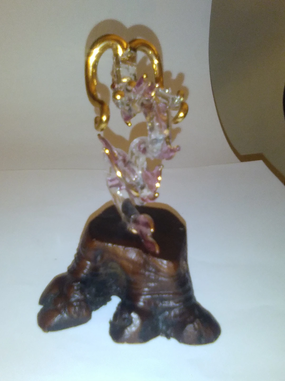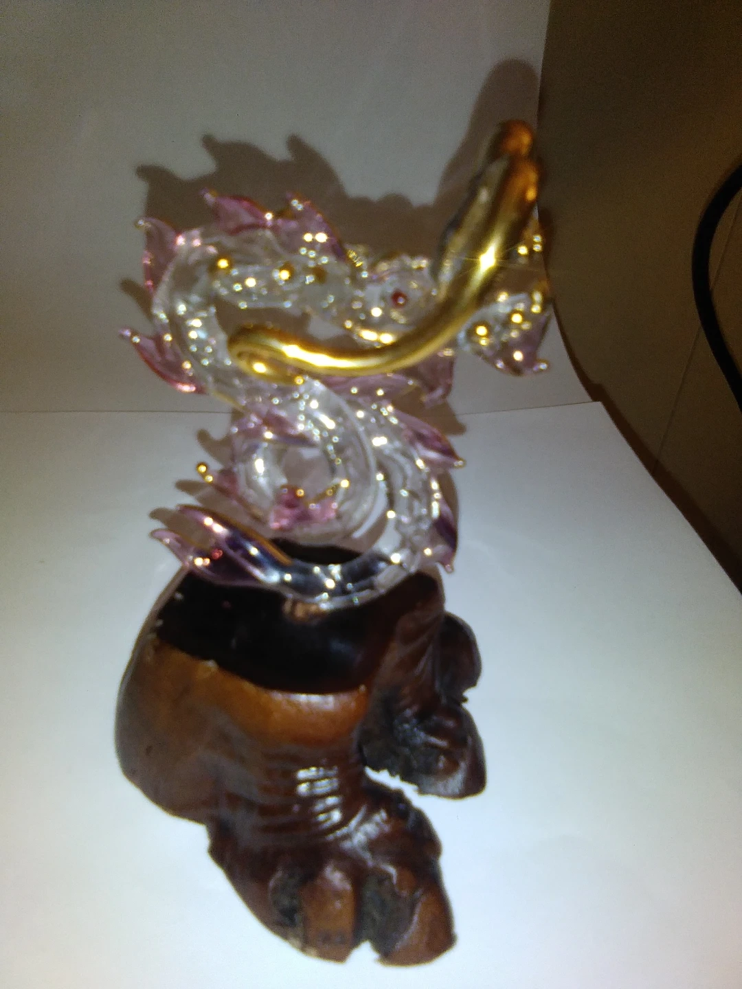 Unique glass dragon figurine with gold accents, mounted on a rustic wood base. Adds a touch of whimsy to any space!