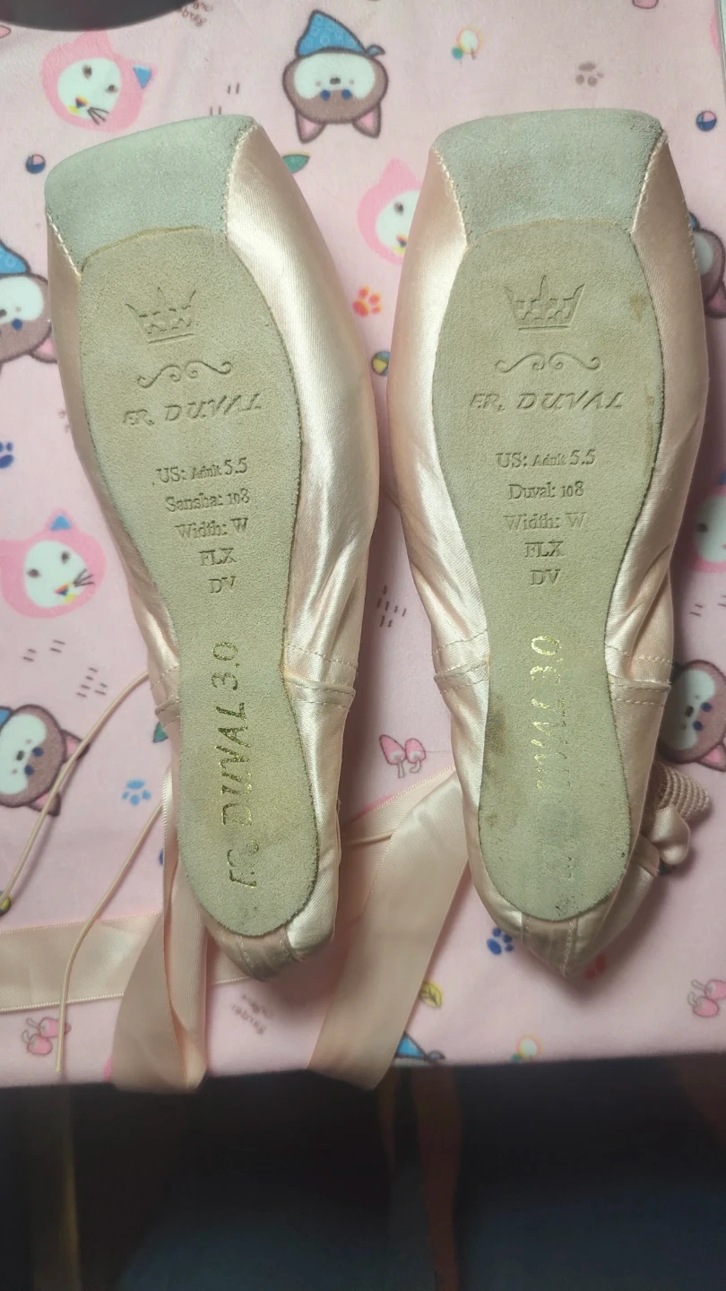 Selling a pair of FR. DUVAL ballet pointe shoes in US size 5.5. They are marked as 'Sansha 108' and 'Width: W'. Great for dance practice or performance