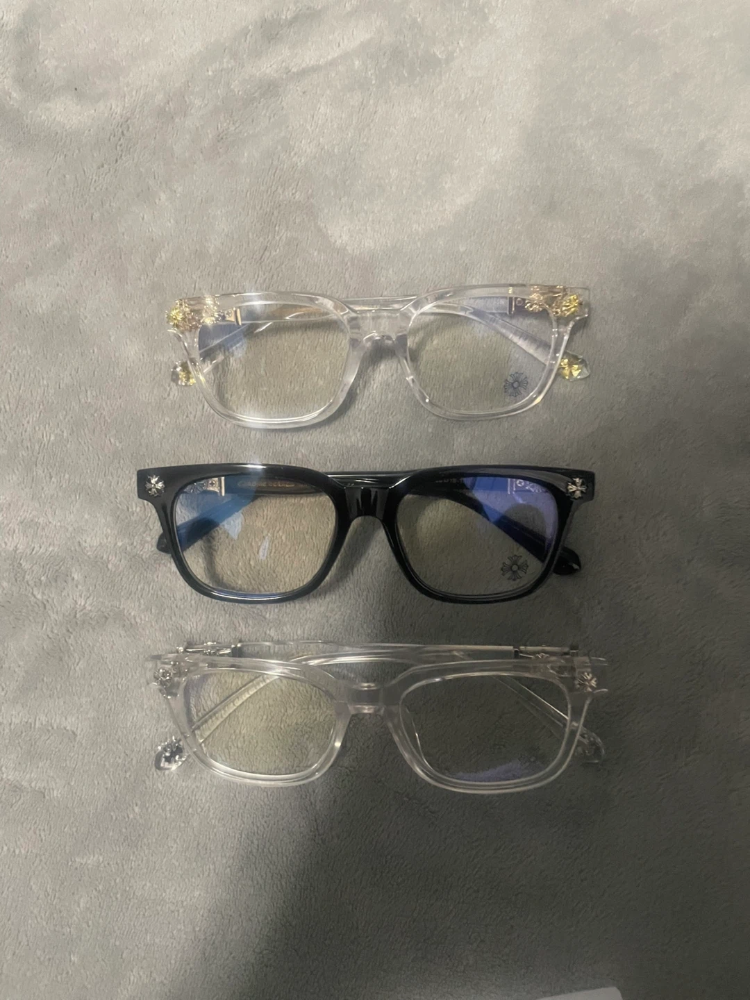 Selling three pairs of Chrome Hearts eyeglasses. One pair is black, and two are clear. They're in great condition and ready for a new owner!