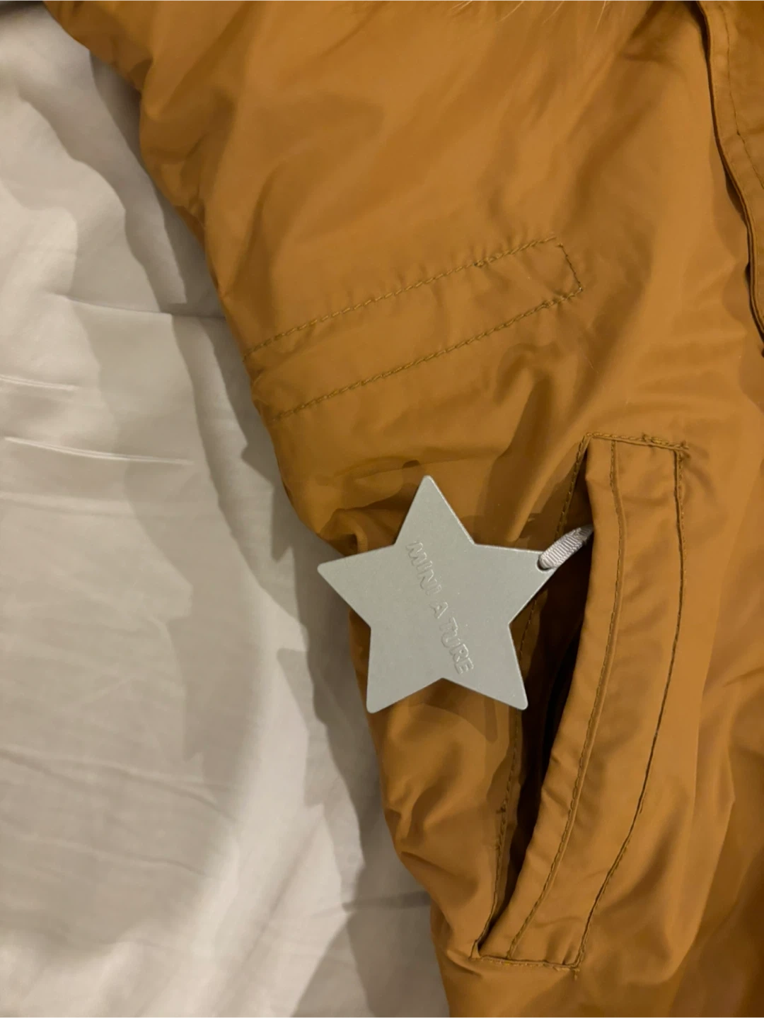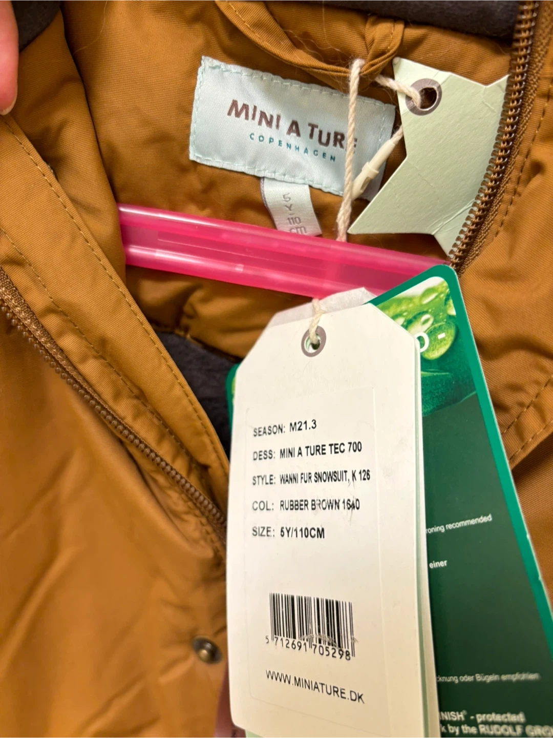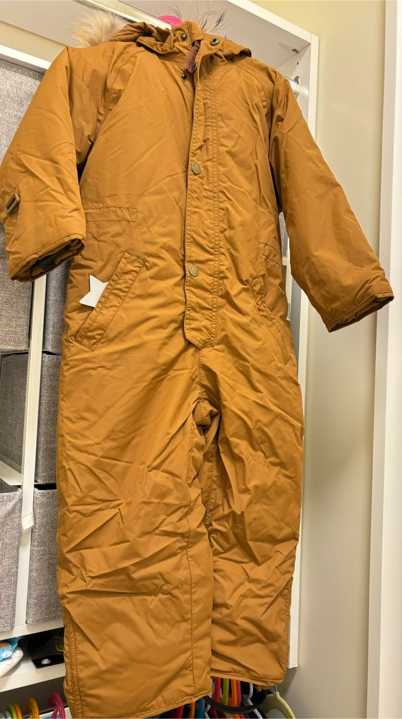 Selling a brand new MINI A TURE snowsuit in size 5Y/110cm. It's a stylish and practical choice for keeping your little one warm during the winter months! The color is Rubber Brown (caramel brown).Perfect for outdoor adventures