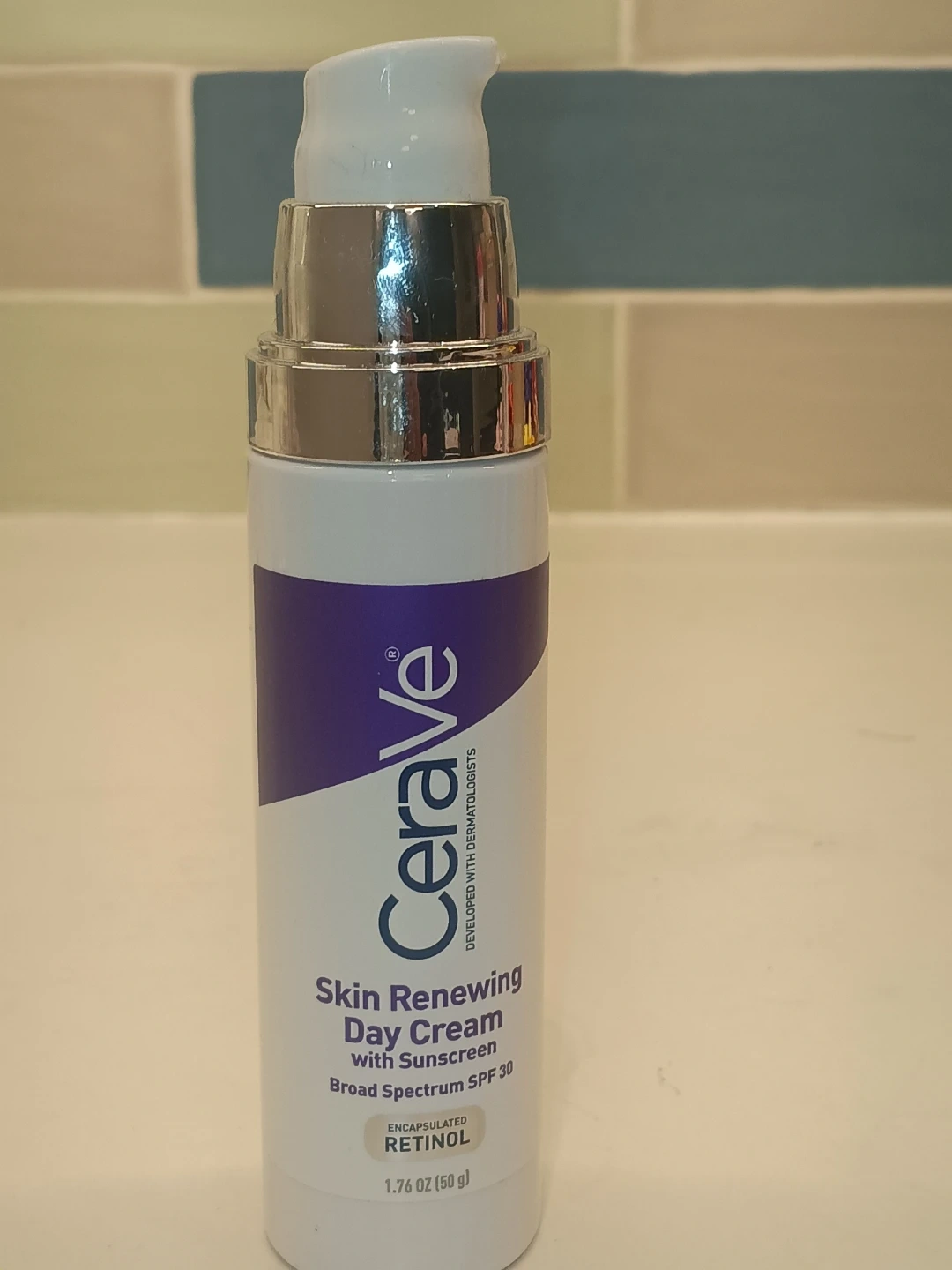 Selling a CeraVe Skin Renewing Day Cream with Sunscreen Broad Spectrum SPF 30. It contains encapsulated retinol and is 1.76 oz (50 g). 70% Full