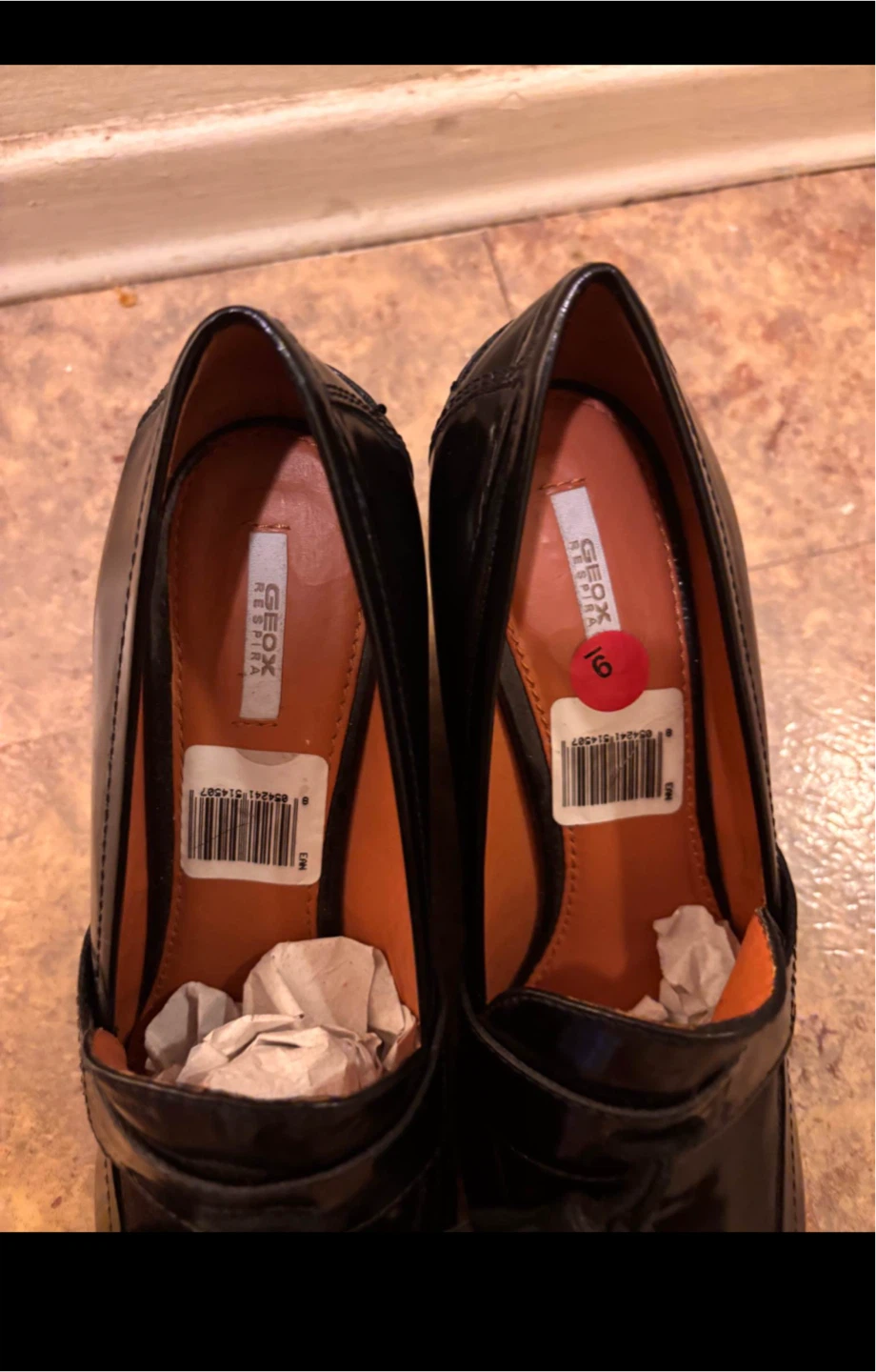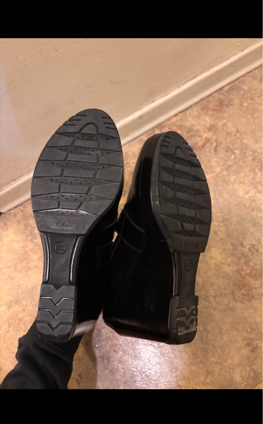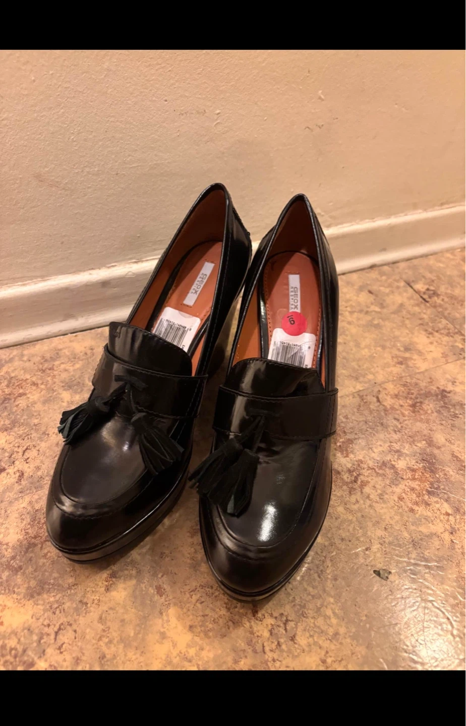 Selling a pair of Geox black leather loafer heels in size 9. These stylish shoes feature a comfortable design and are perfect for adding a touch of elegance to any outfit. The Geox brand is known for its quality and comfort, making these heels a great addition to your wardrobe