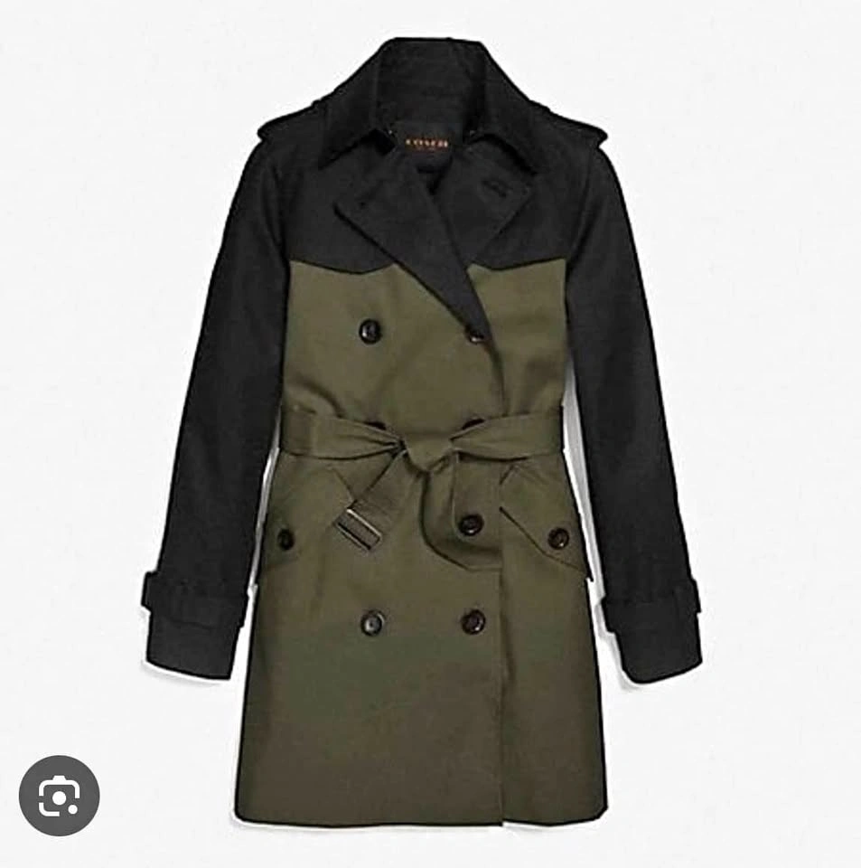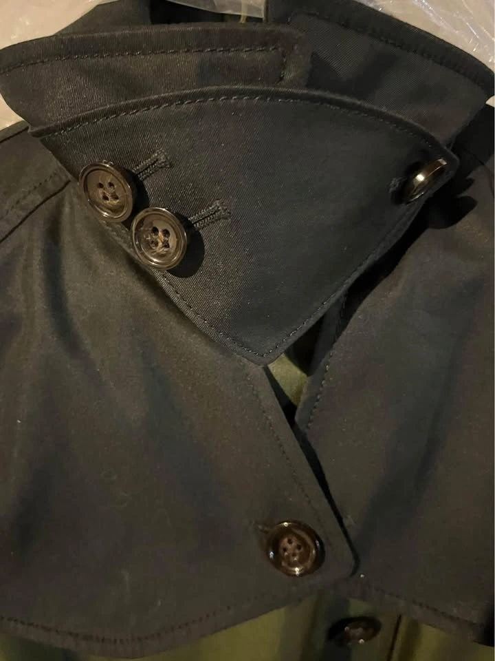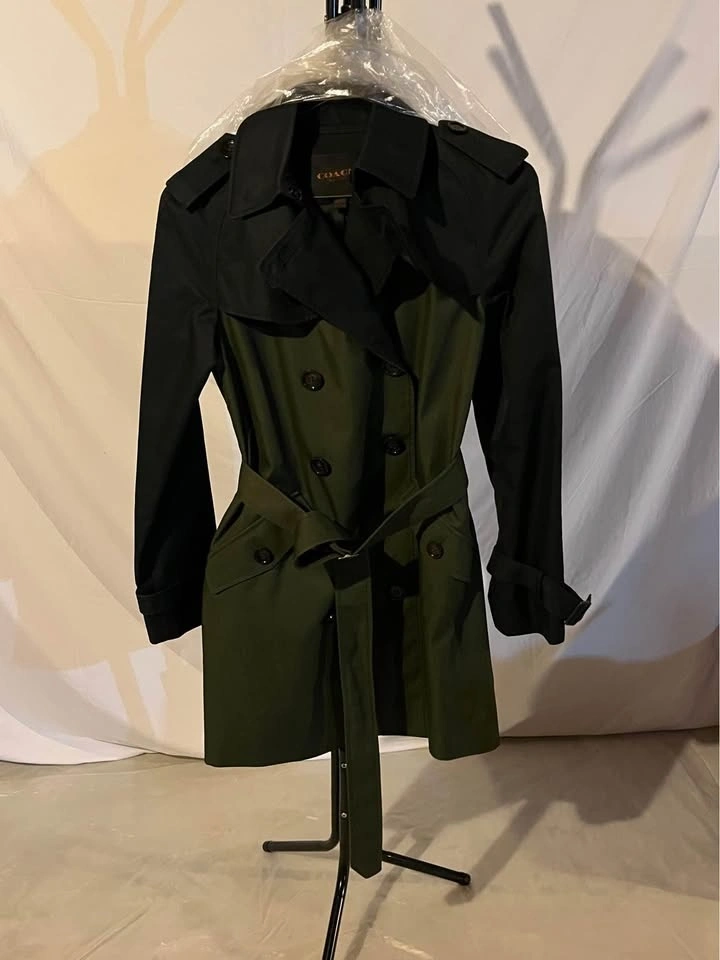 Excellent used condition. No tears, fading, stains, or other material defects. It has been dry cleaned, but can be machine washed on the delicate cycle in cold water. Size small. Black/Khaki Green (dark olive green) colour. Please refer to the last photo for measurements.