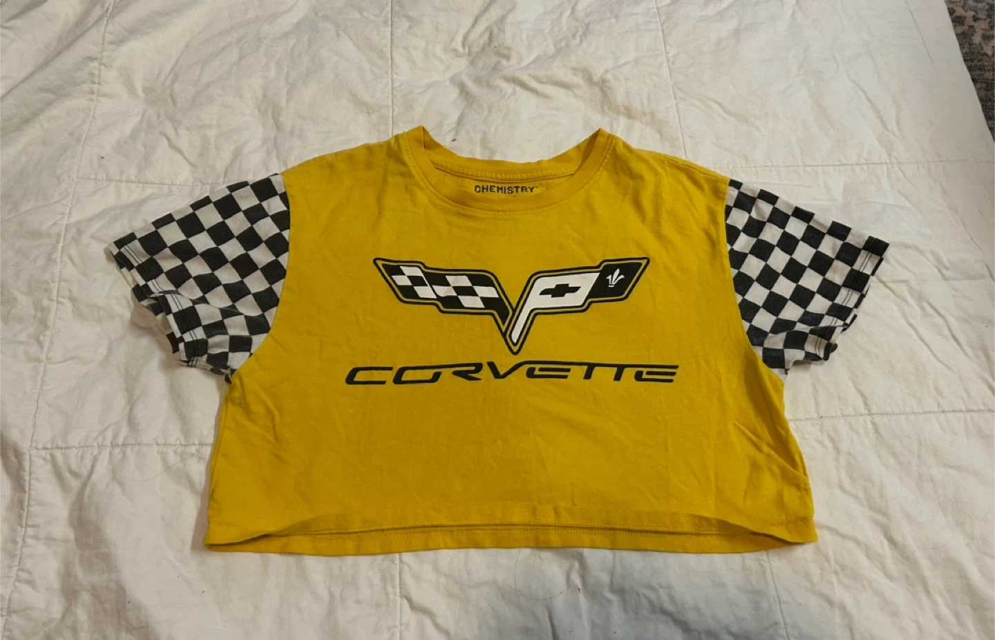 Cute yellow crop top with a Corvette logo! It has unique checkered sleeves that add a fun touch. Perfect for casual wear or showing off your love for classic cars