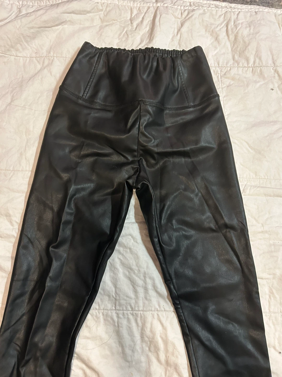 Selling a pair of black faux leather leggings. They look great and are in good condition. These would be a great addition to your wardrobe!