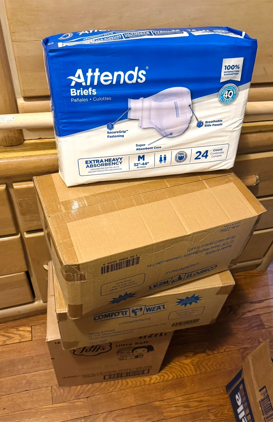 Giving away Attends Briefs, size medium (32"-44"). These briefs have extra heavy absorbency and feature SecureGrip fastening and breathable side panels. Each pack contains 24 briefs. 3 boxes total.