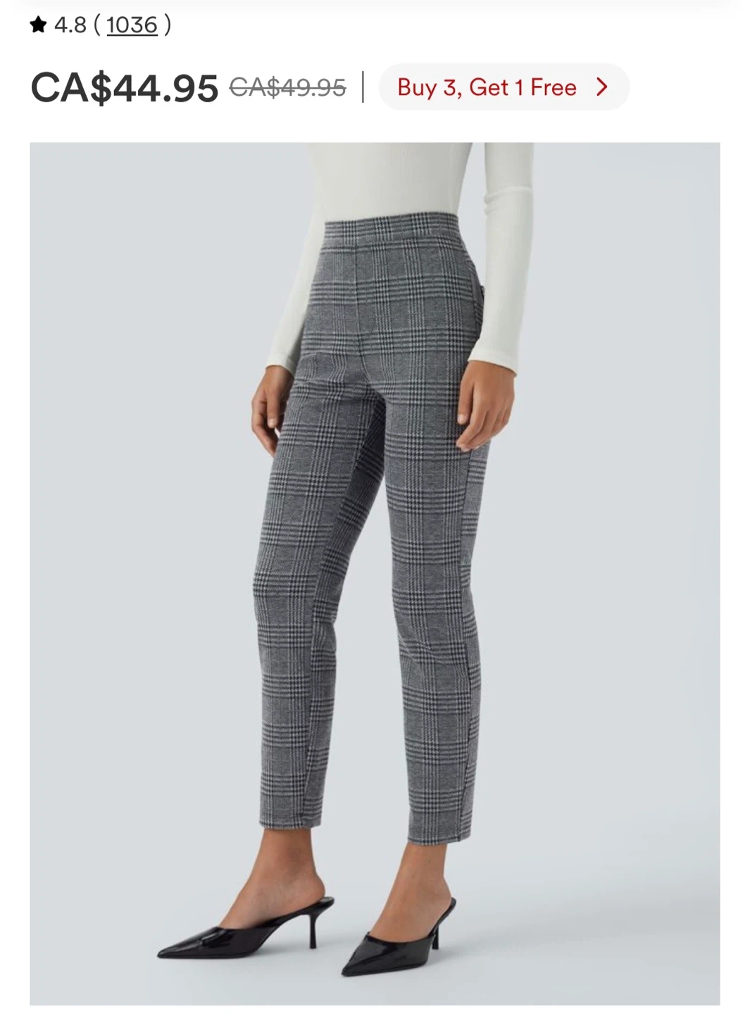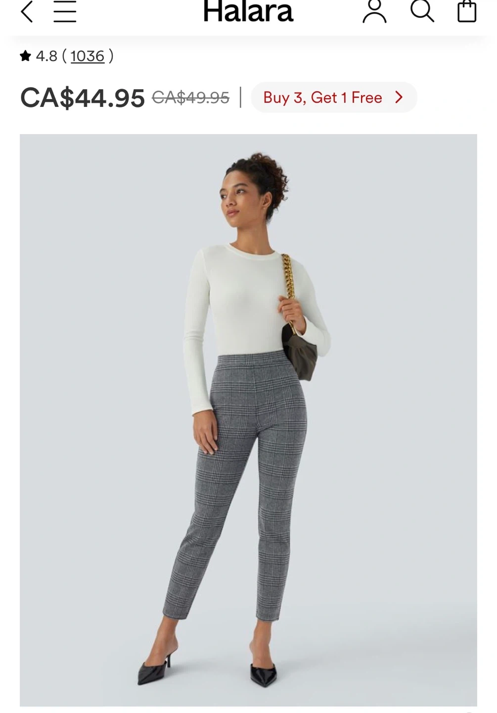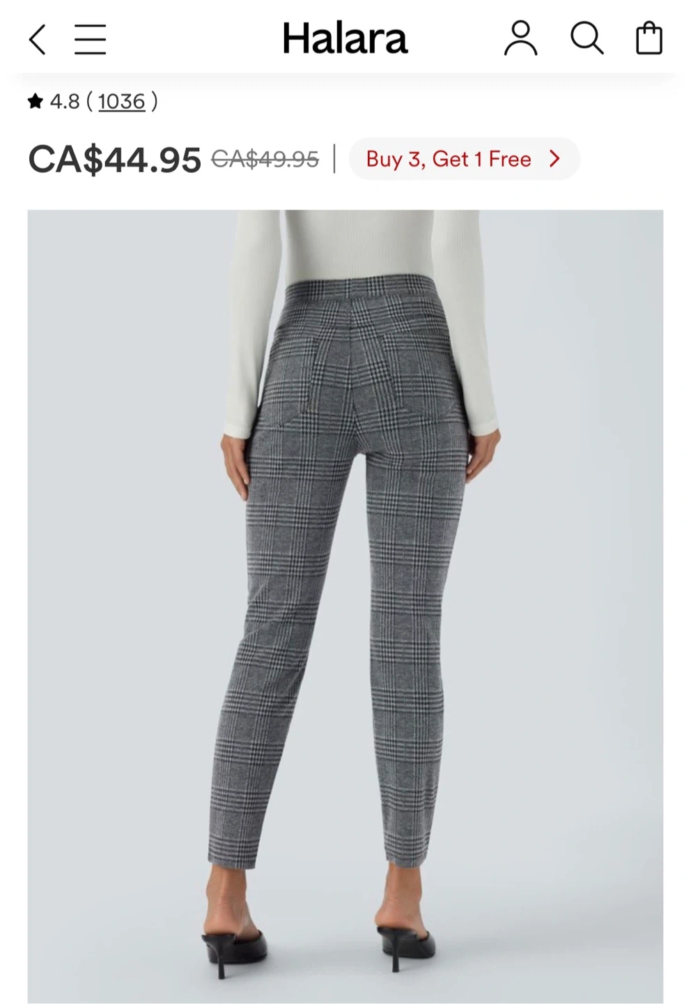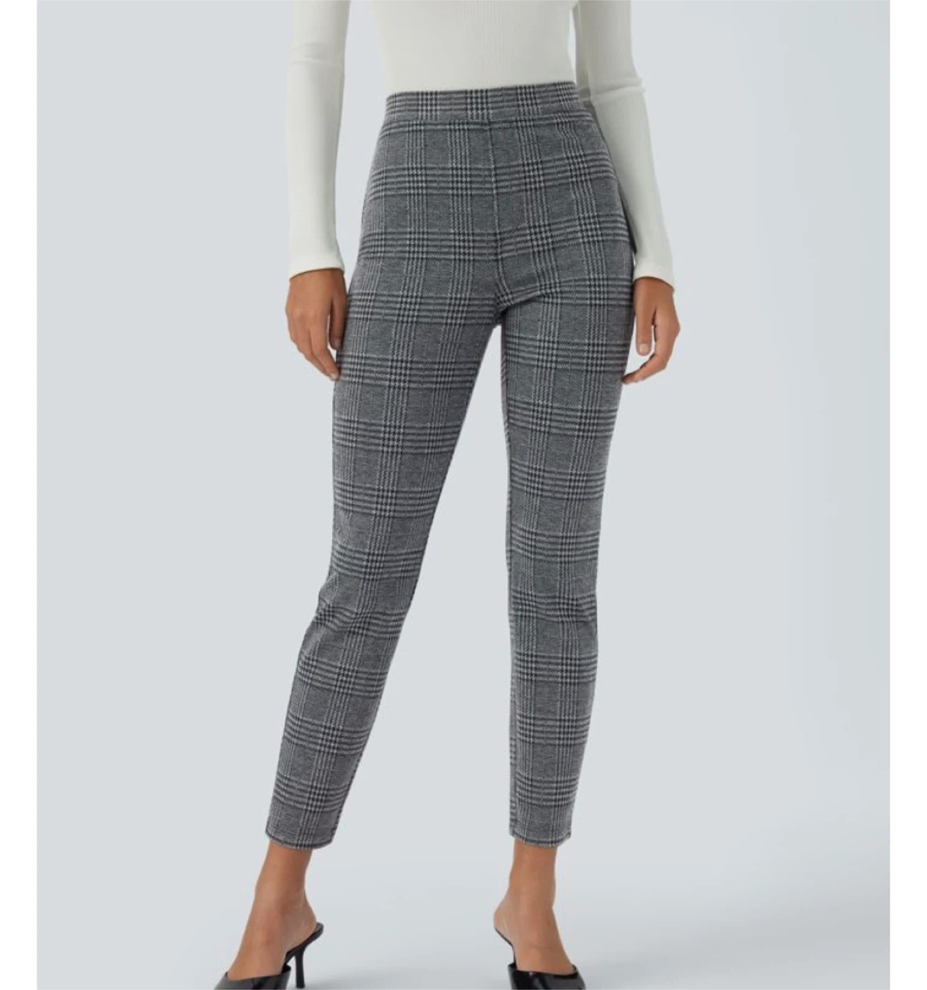 Never worn. These are a pair of Halara high-waisted pants in a grey plaid pattern. They look great and are super comfy. They retail for $44.95!