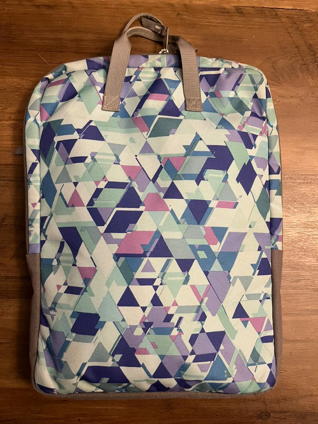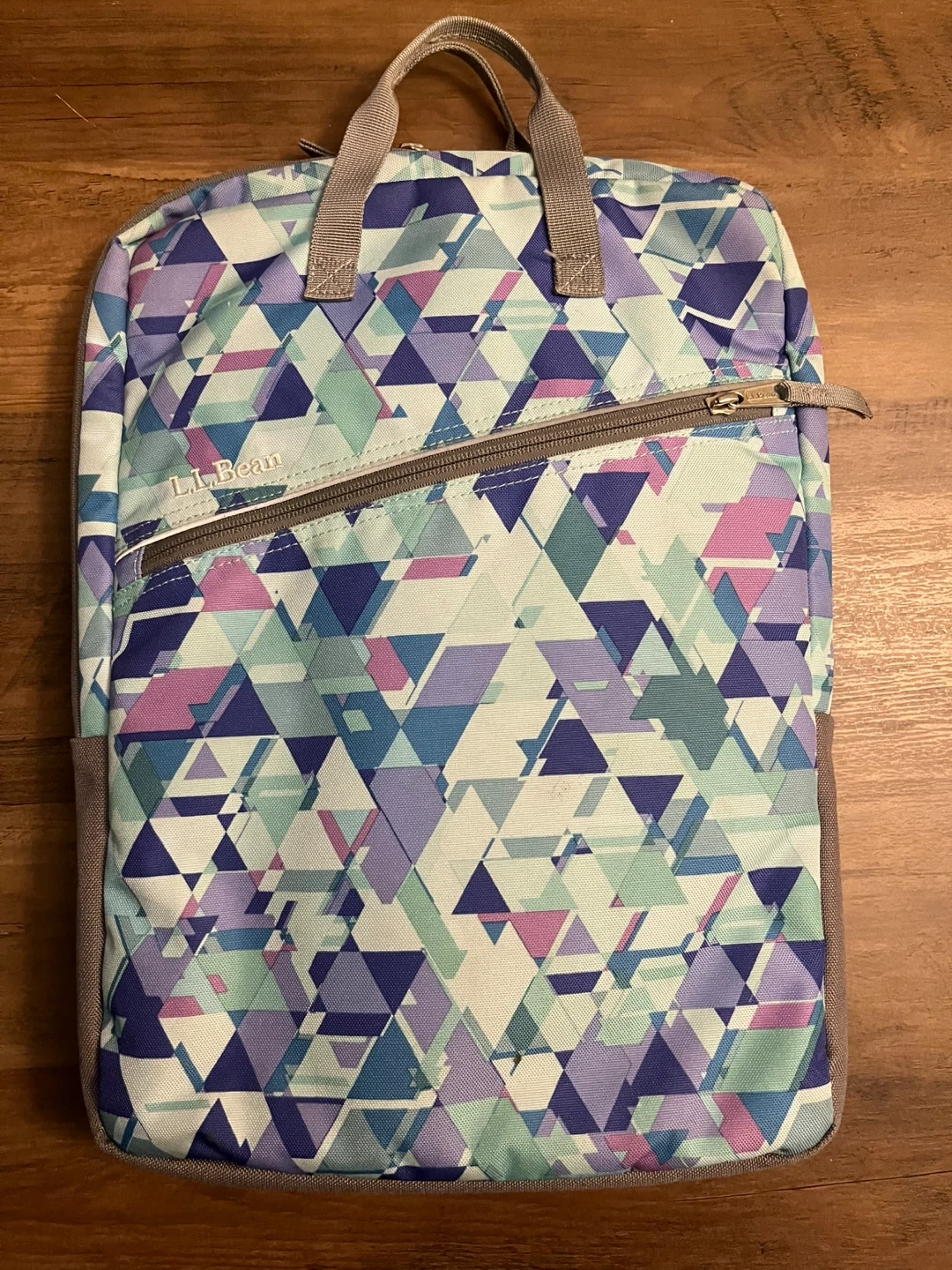 Selling a L.L.Bean laptop bag. It has a geometric design with shades of blue, purple, and green. The interior is grey and has multiple compartments for organization