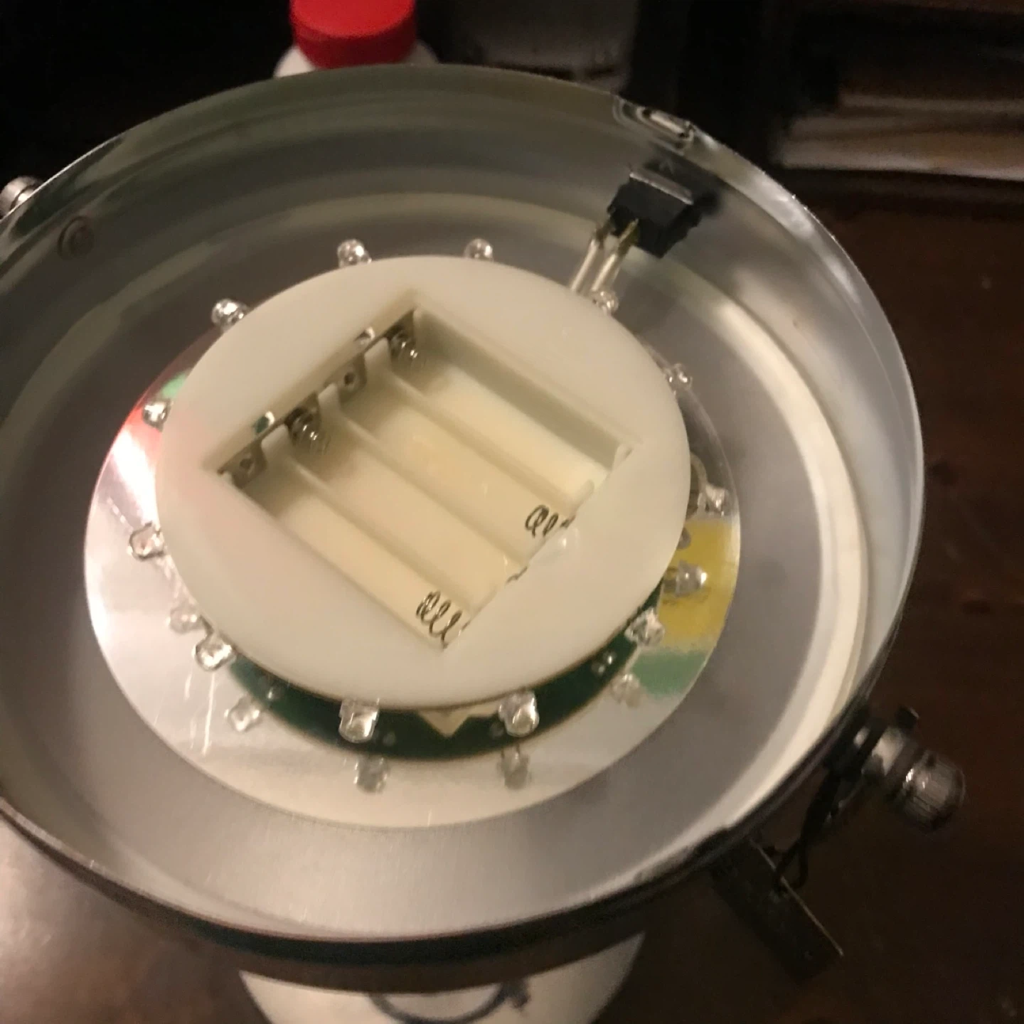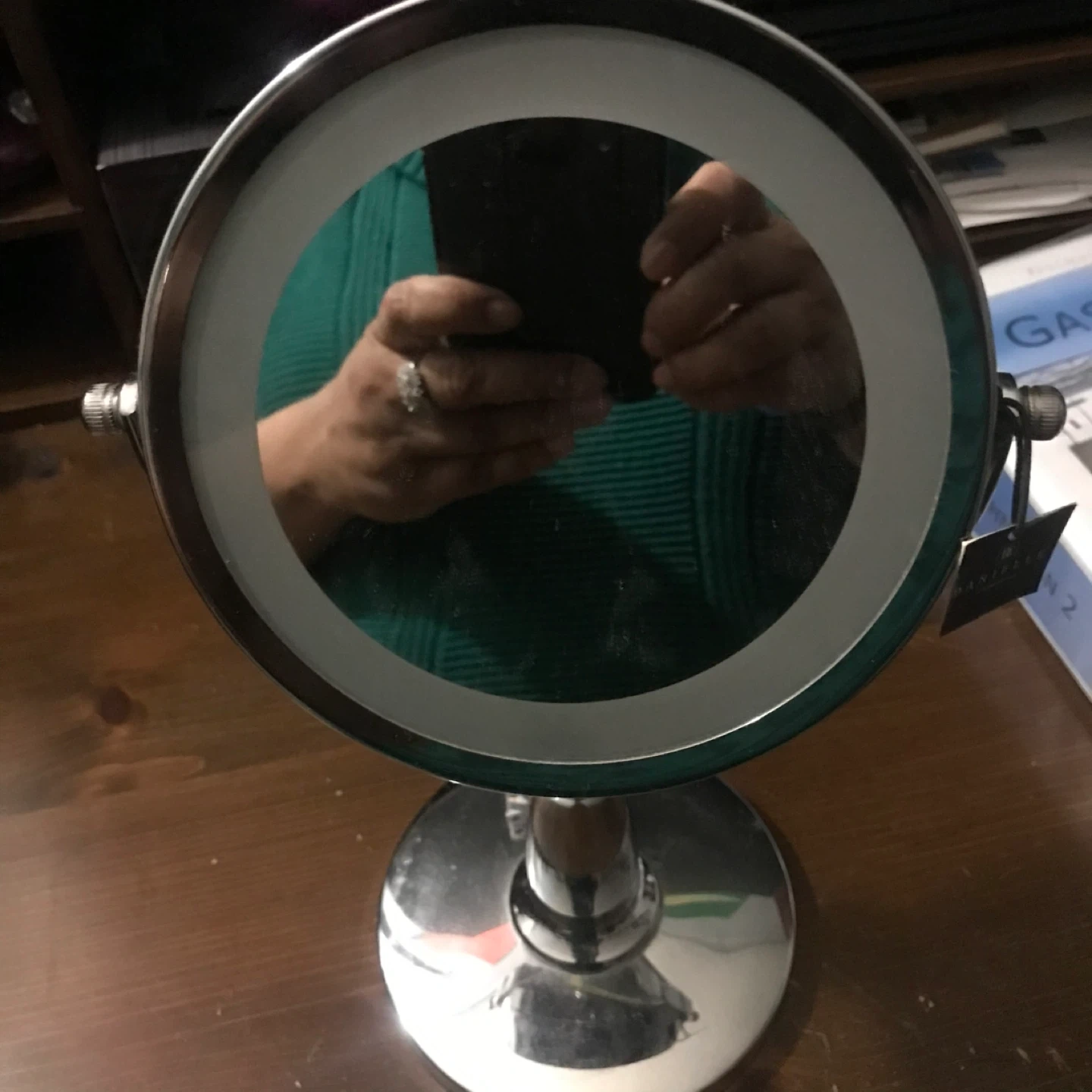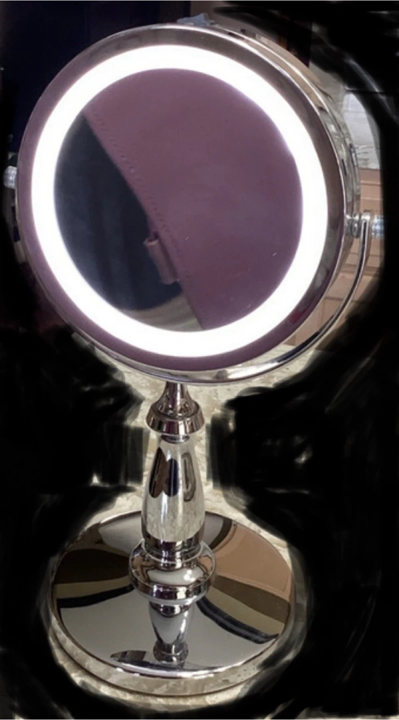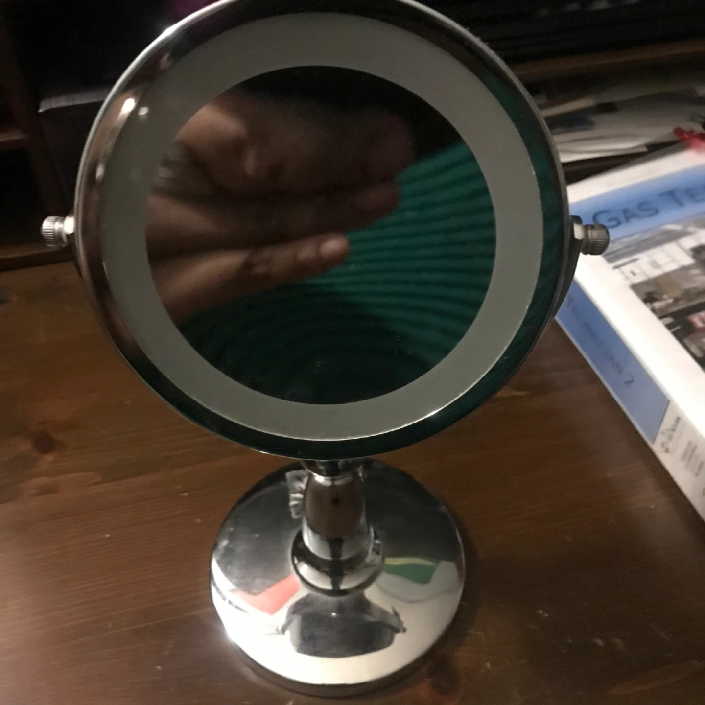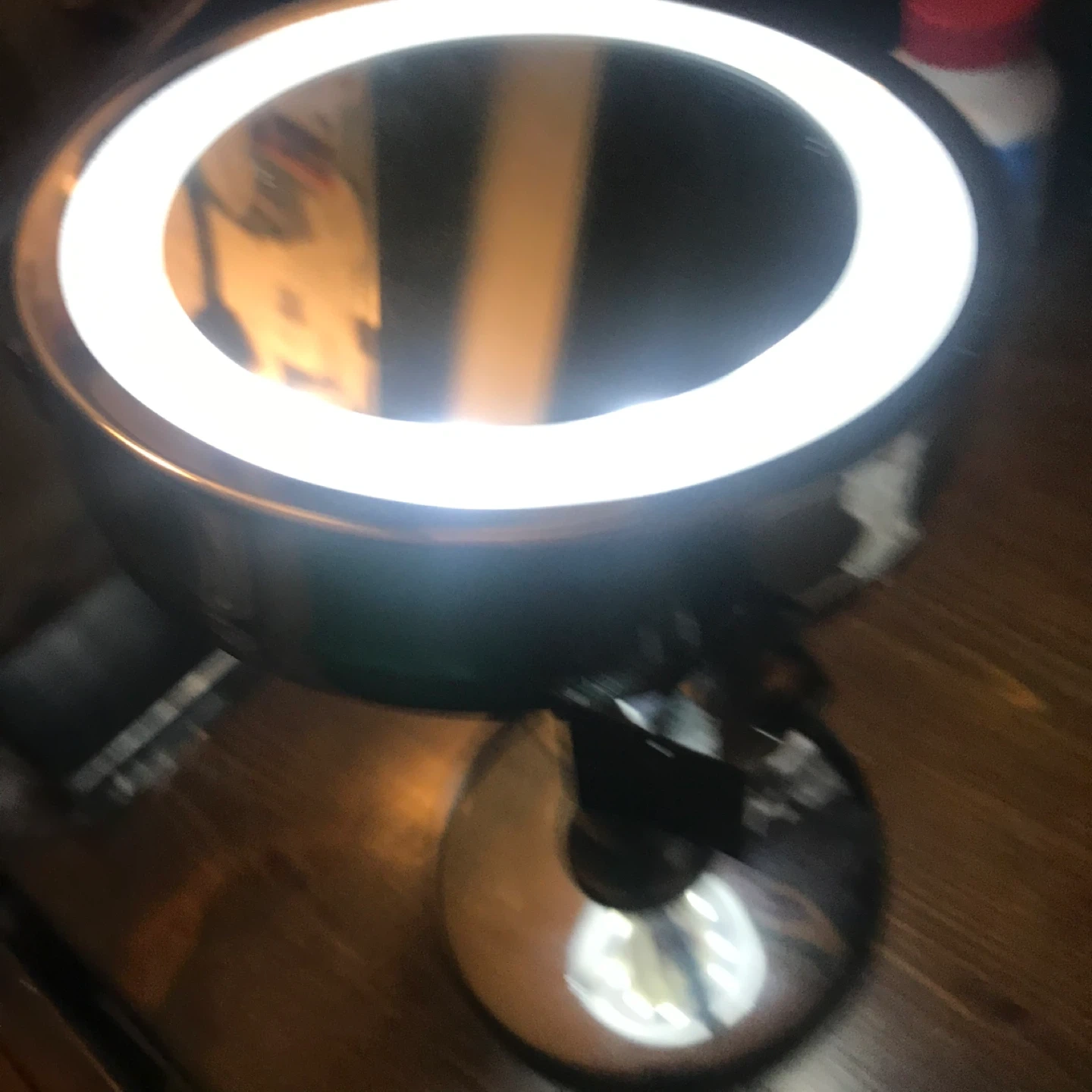 Selling a vanity mirror with built-in battery-powered lights. One side has a magnifying mirror. It's in great shape and perfect for applying makeup or skincare. The mirror is round and has a stand, making it easy to place on any surface. Sturdy, no wobbling.