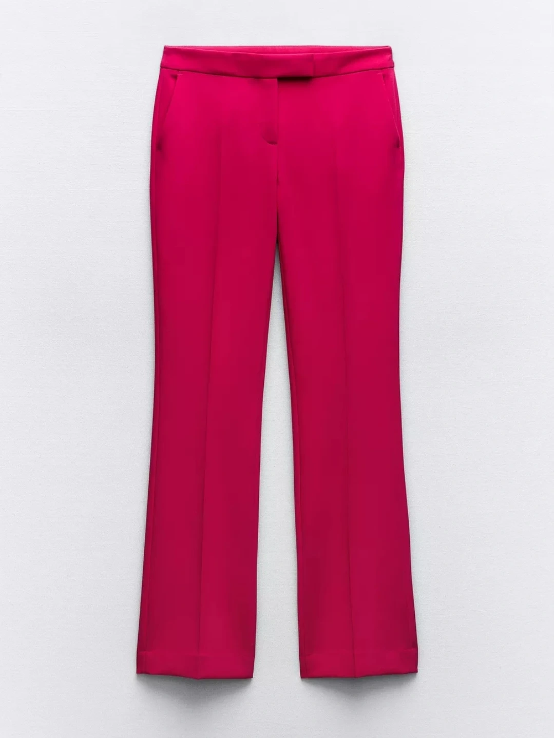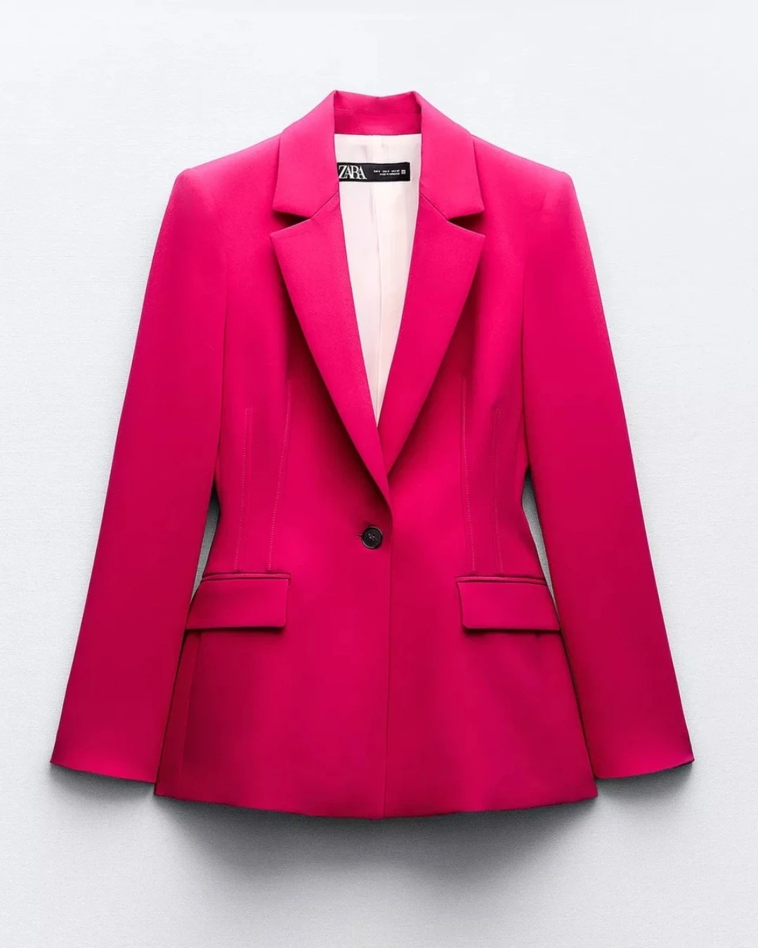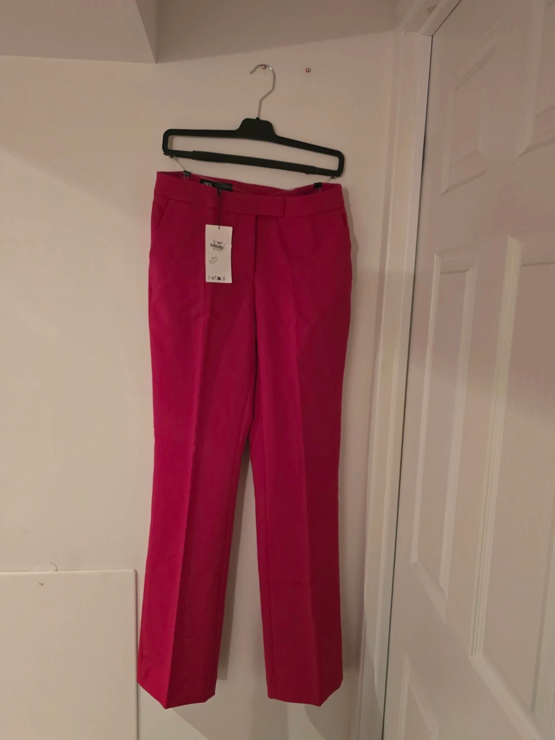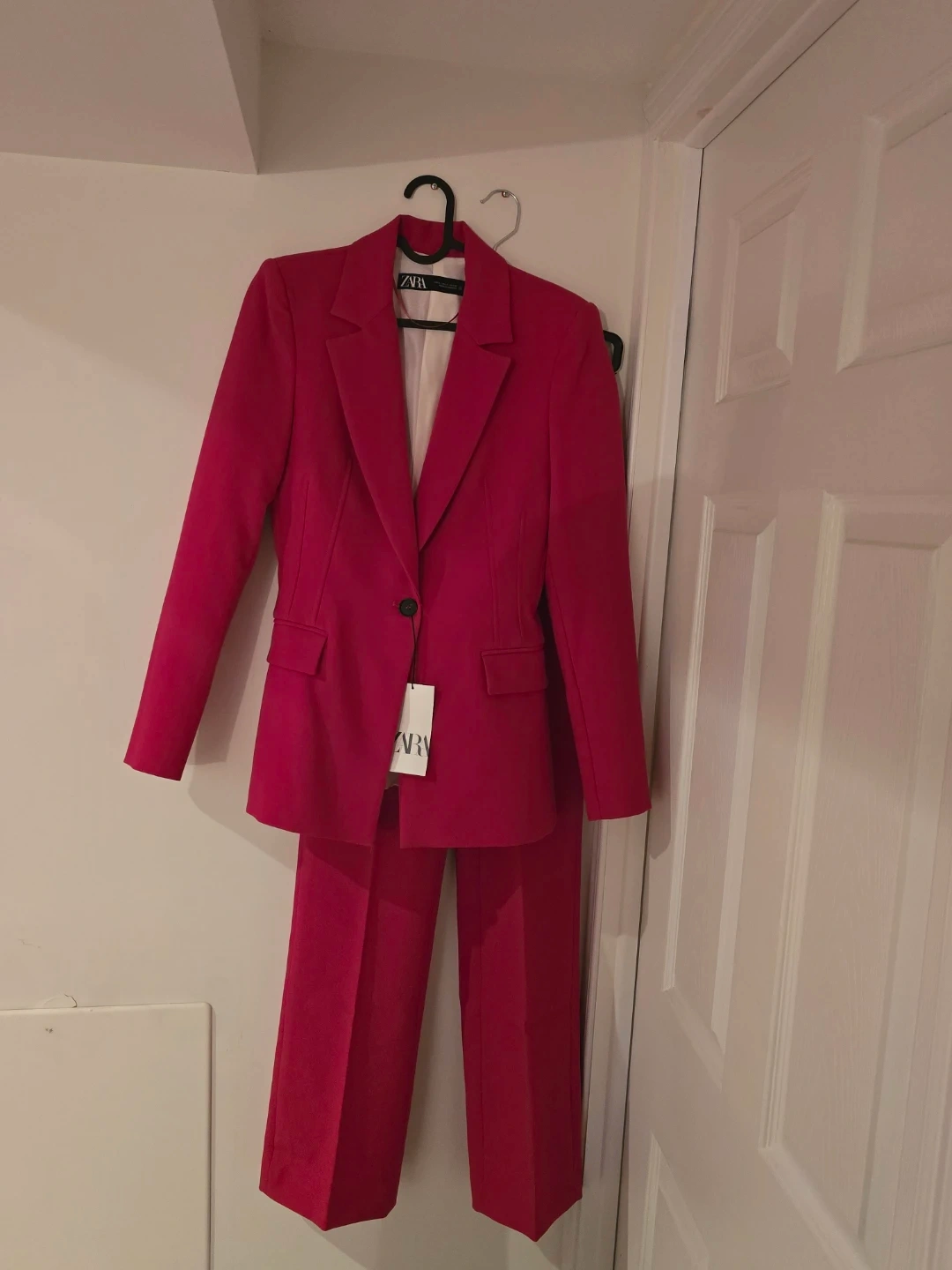 Selling a vibrant pink suit from Zara! This set includes a blazer and a pair of trousers. Perfect for adding a pop of colour to your wardrobe. The blazer features a classic design with a single-button closure, while the trousers offer a flattering fit. Both pieces are brand new, ready to be worn.