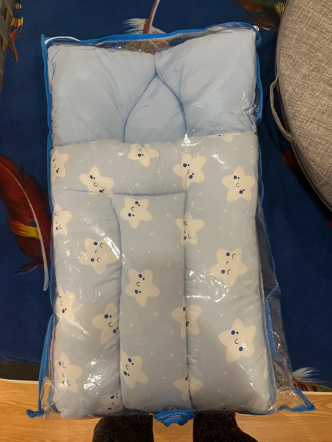 Selling a baby nest bed with a cute blue star pattern! It's in great condition and comes in its original packaging. Perfect for newborns and infants!