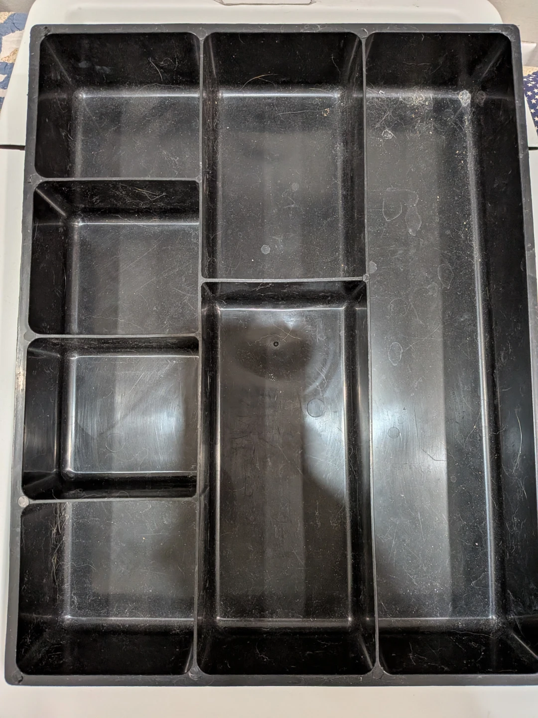 Selling a black plastic cutlery tray. It has multiple compartments to keep your silverware organized. It's in good condition and ready to use in your kitchen!