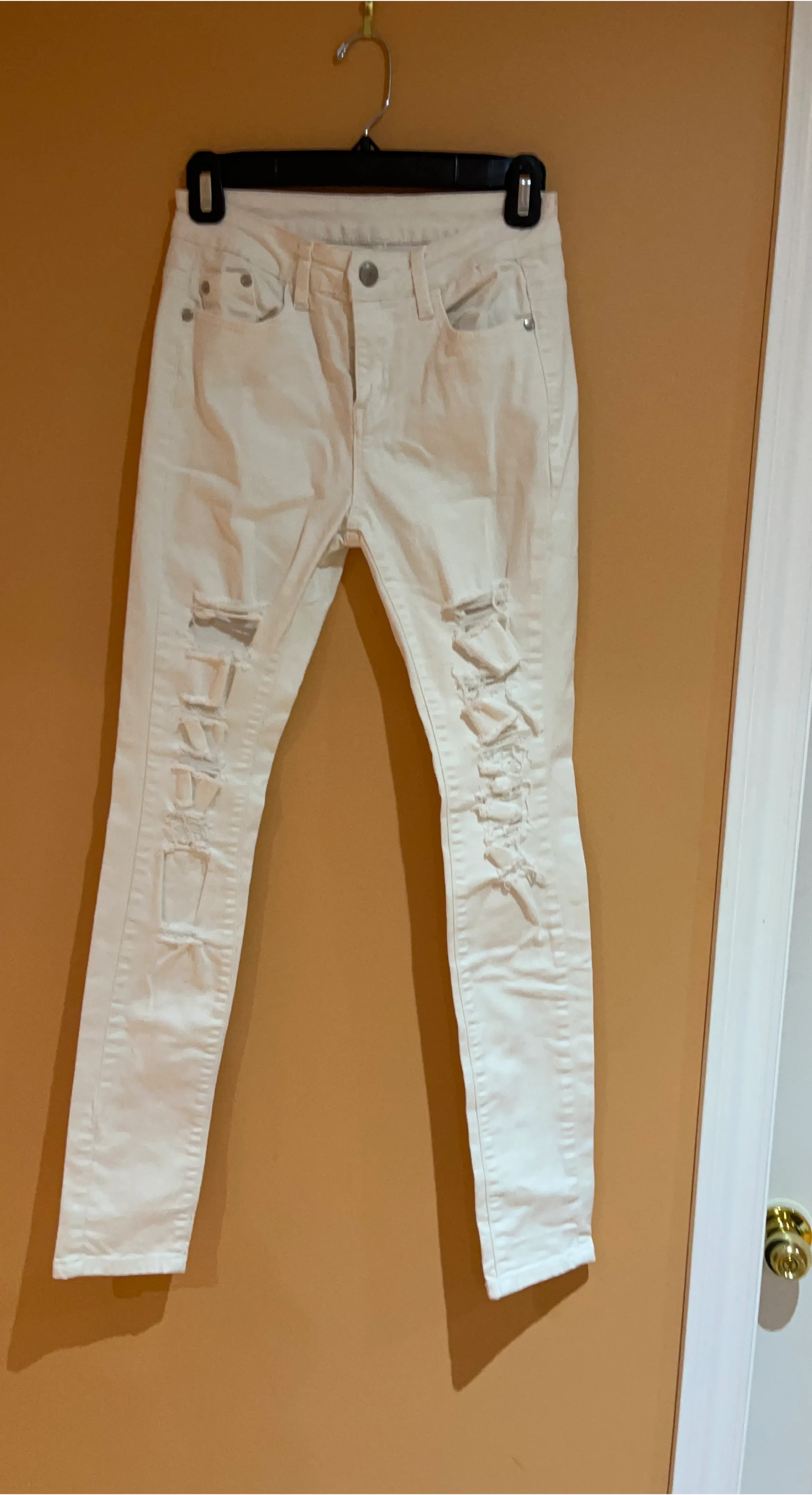 Selling a pair of white denim jeans with a distressed design. They're in good condition and ready for a new owner. Perfect for a casual look!