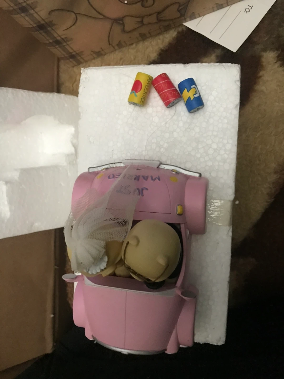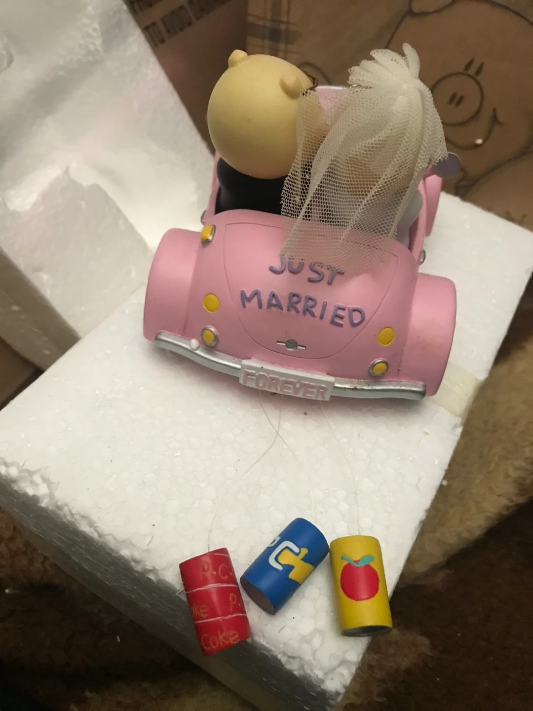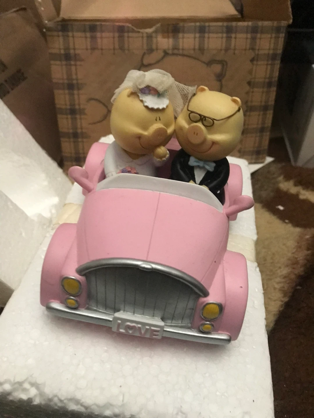 This is an adorable Pork Chop & Piggy figurine from the Polyresin Collection! It features two piggies dressed in wedding attire riding in a pink car that says "Just Married" and "Forever". Comes with the original damaged box!