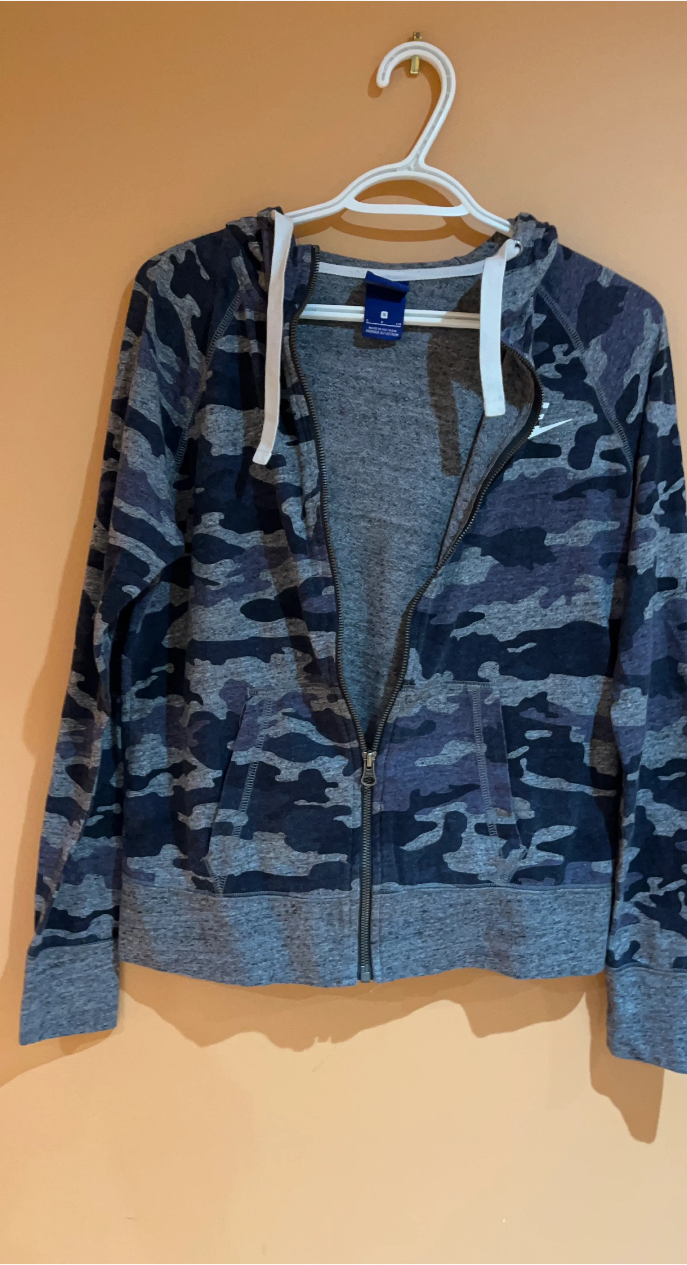 Selling a Nike zip-up hoodie in a cool camo pattern! It's a size small and in great condition. Perfect for layering or wearing on its own.