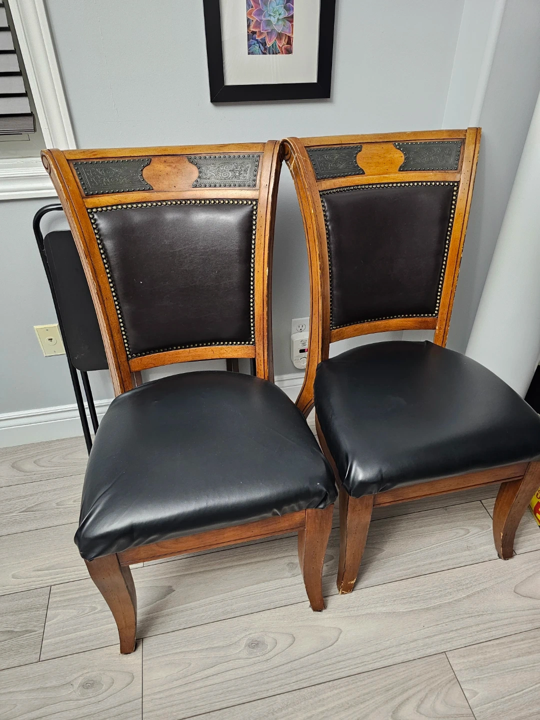 Selling a set of two dining chairs. They are brown with black leather seats. They are in good ,study condition.