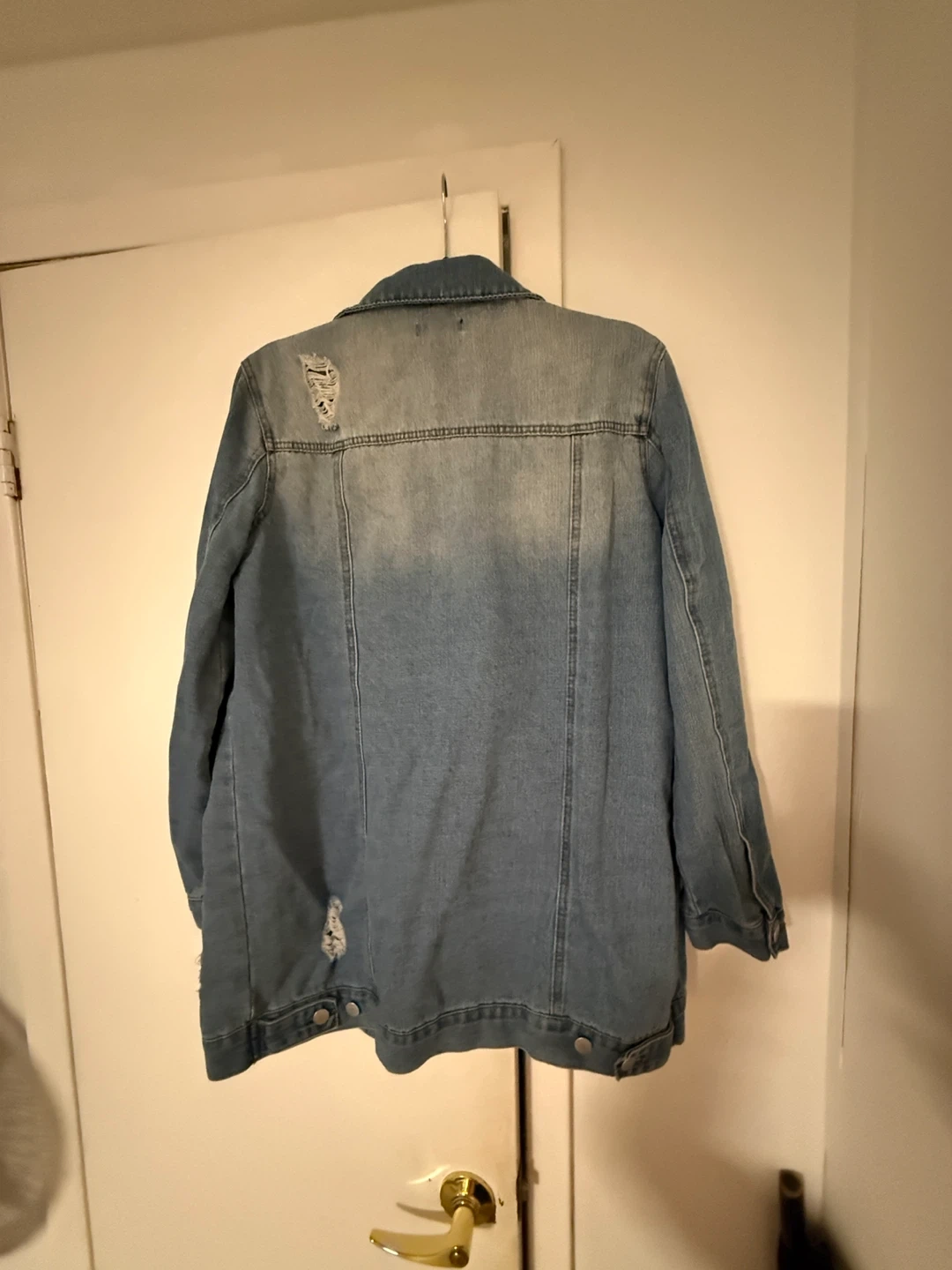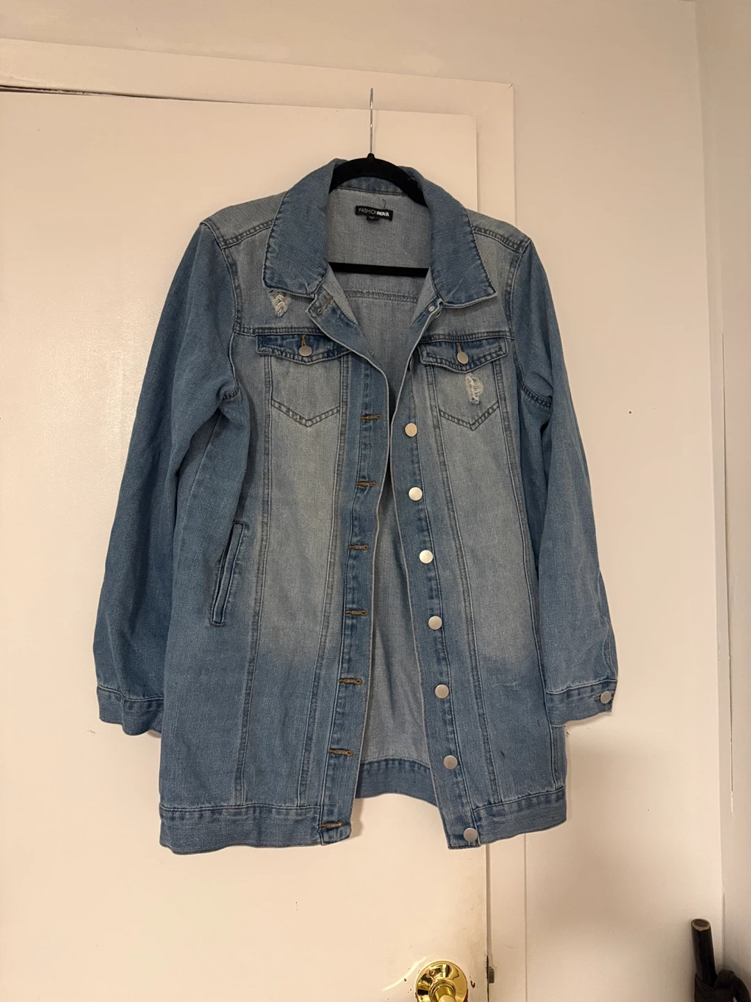 Selling a Fashion Nova denim jacket in size L. It's a stylish, distressed denim jacket that would be a great addition to your wardrobe! Feel free to ask any questions