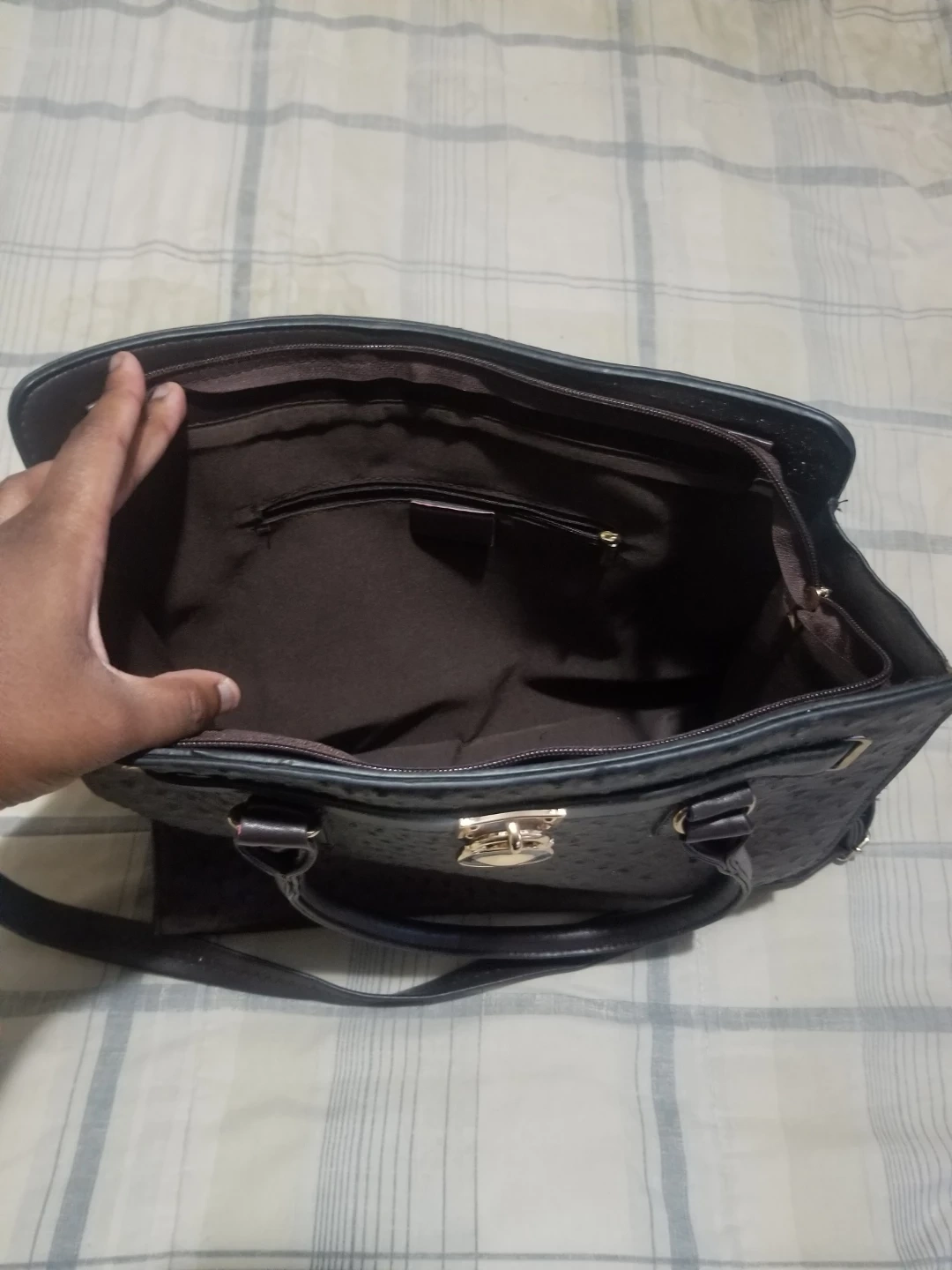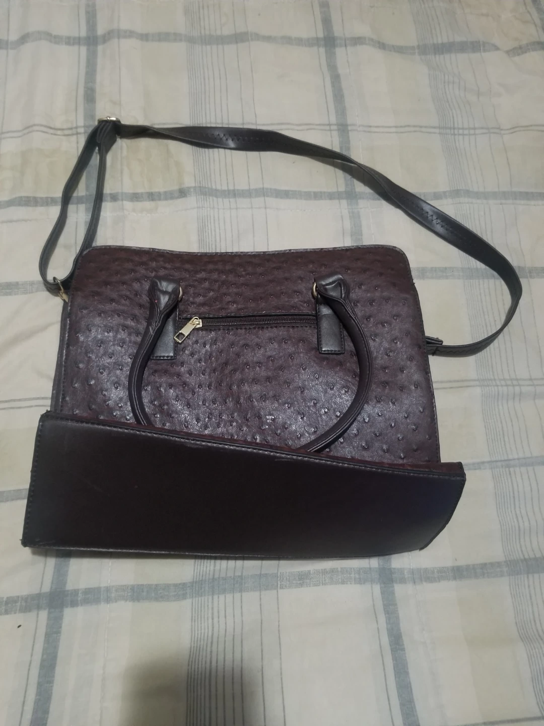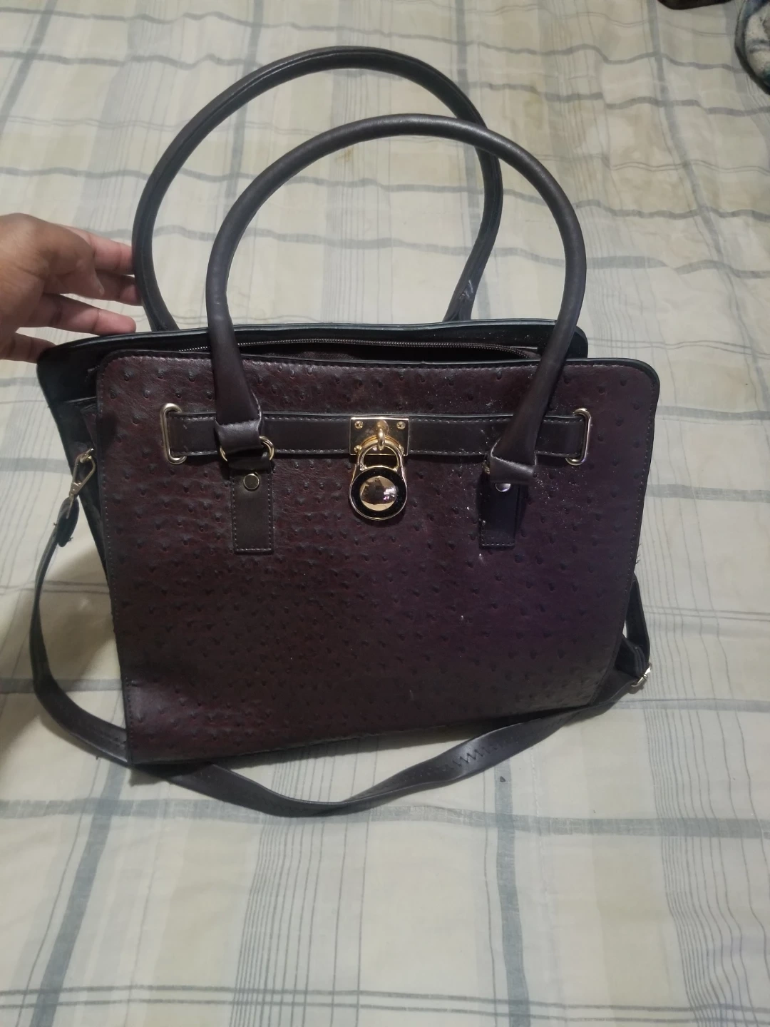 ππ€π₯ This is a stylish burgundy satchel handbag with an ostrich print texture. It features a top handle and a detachable shoulder strap. The bag has a secure lock closure, perfect for keeping your belongings safe and organized Asking Just $12 for This