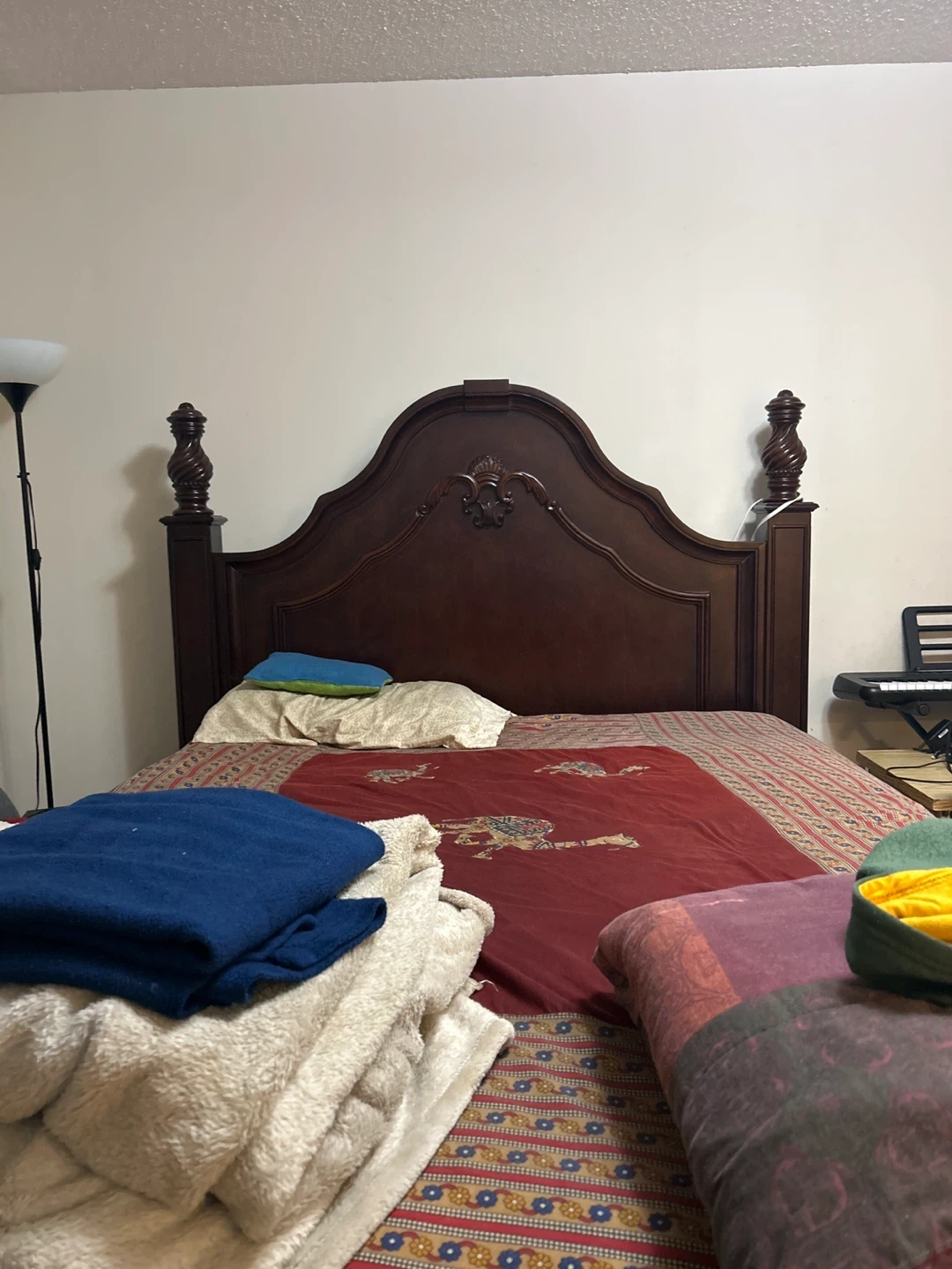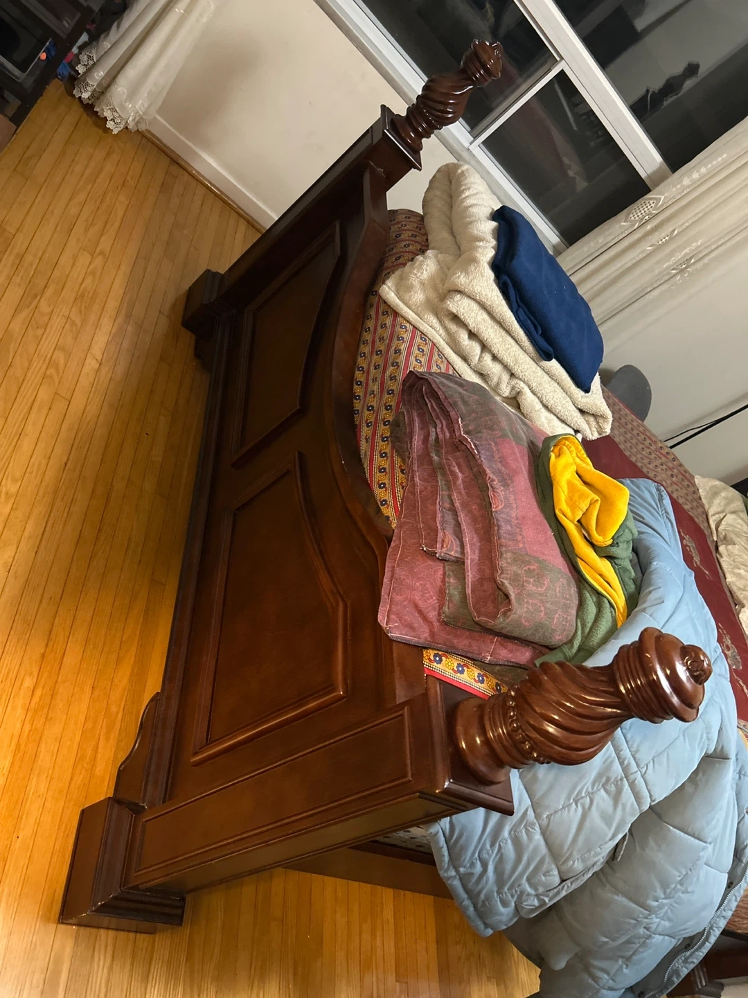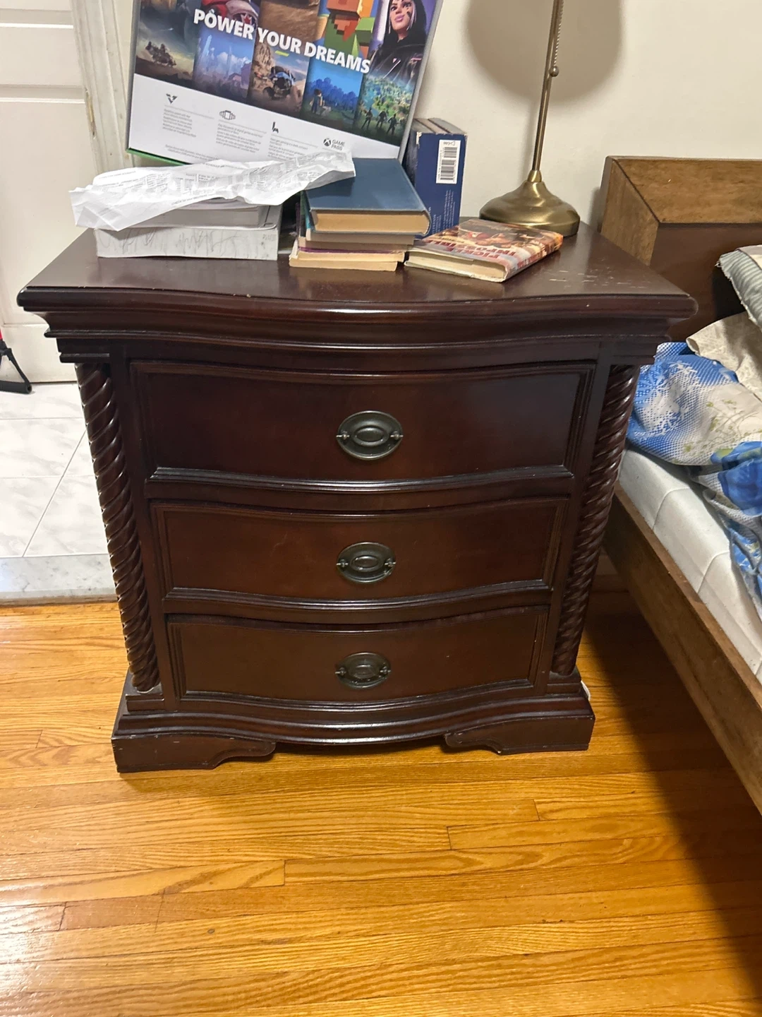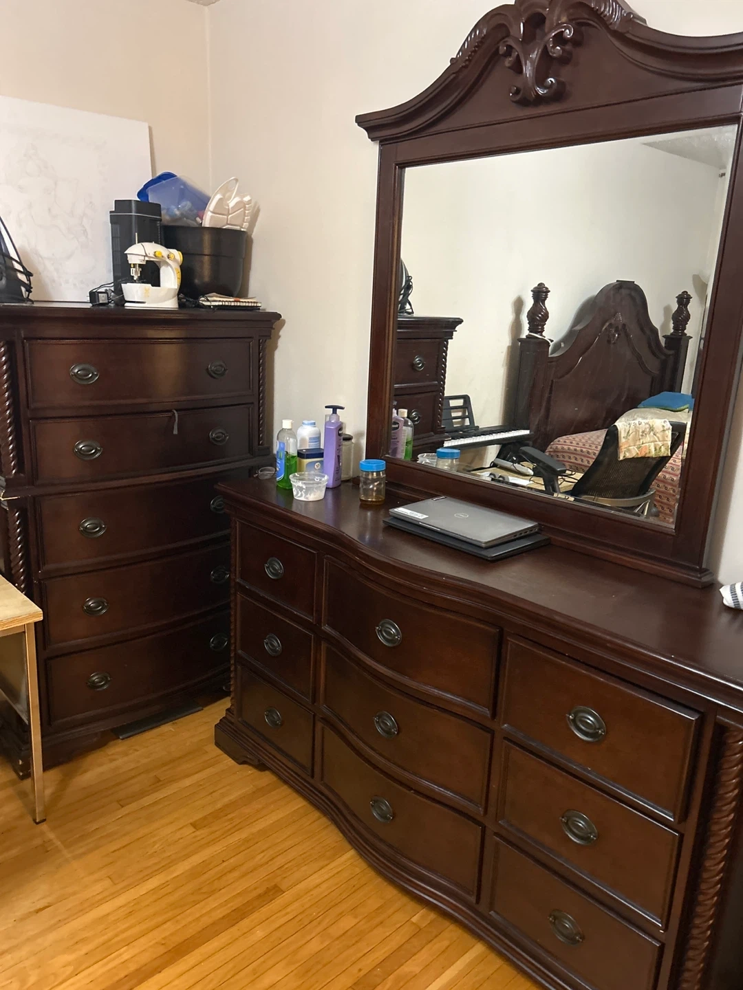 Selling a bedroom set that includes a bed frame, dresser with mirror, and a nightstand. The set is a dark brown colour and has a traditional style with carved details. It's in good condition and ready for a new home!