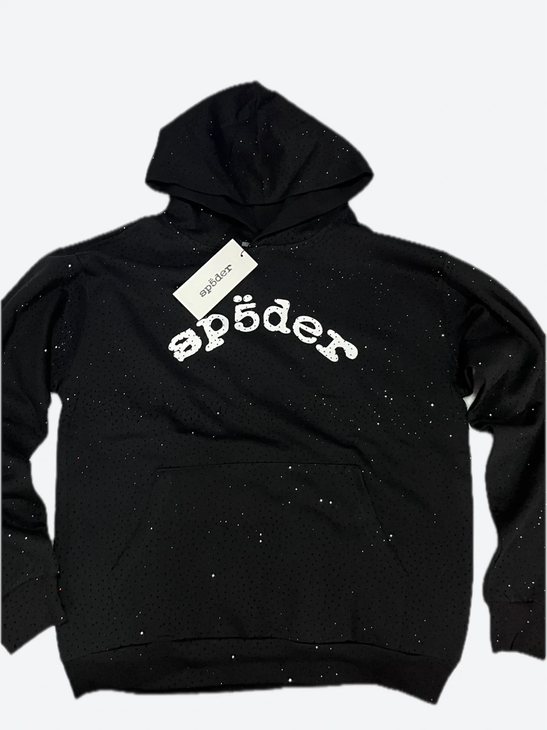 Selling a Sp5der black hoodie. The hoodie is black with white lettering. It's in great condition and ready for a new owner