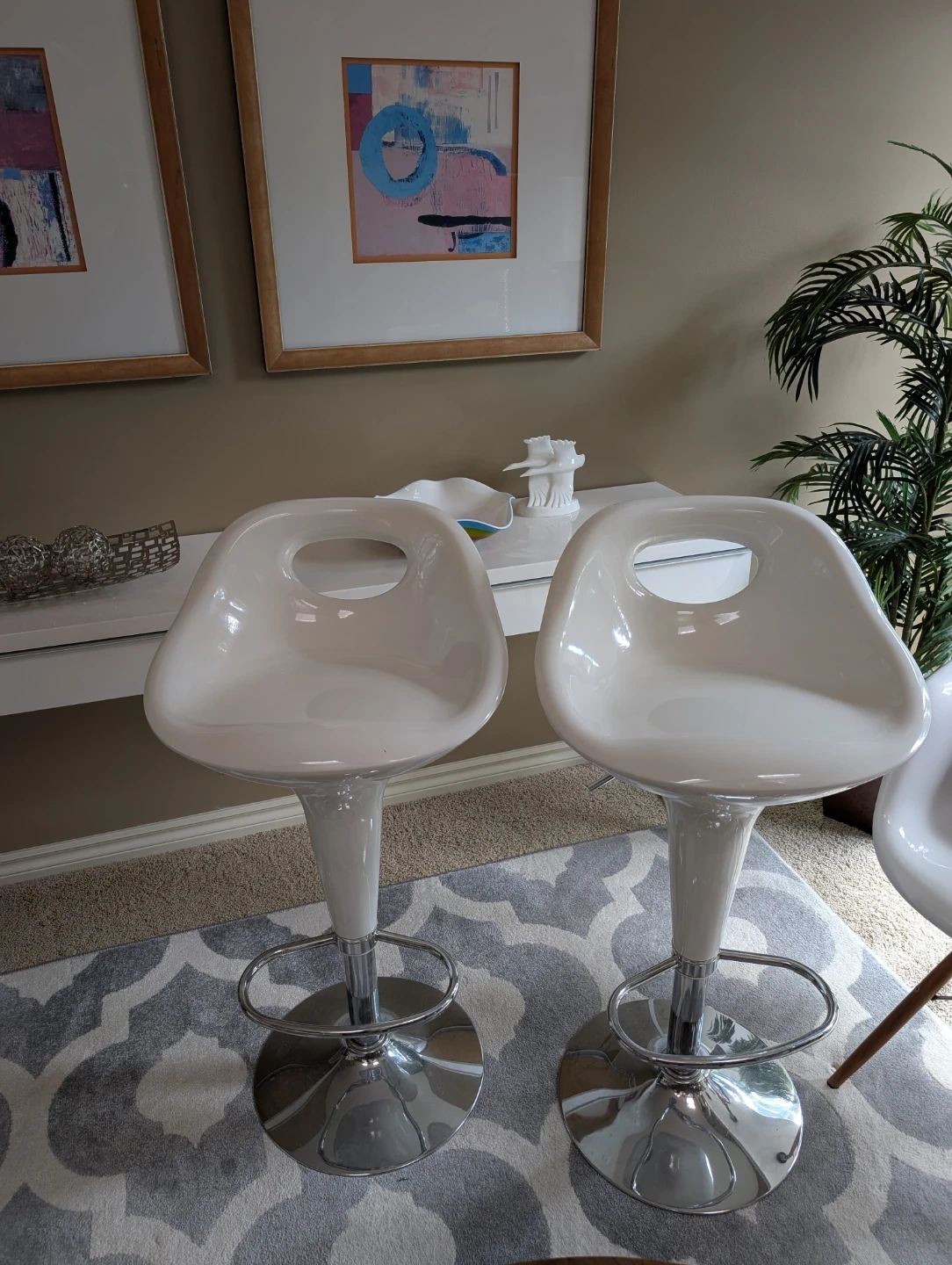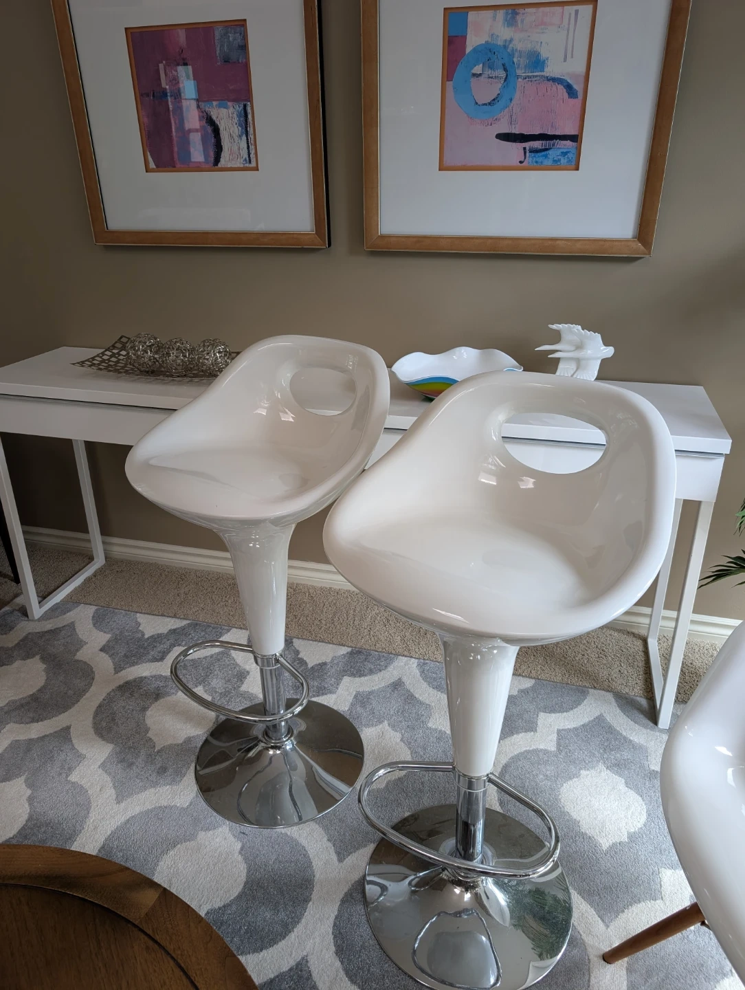 We are selling 2 beautiful, modern, white lacquer, adjustable-height, swivel bar stools. These are very sturdy, high-end, contemporary counter stools in beautiful like-new condition!