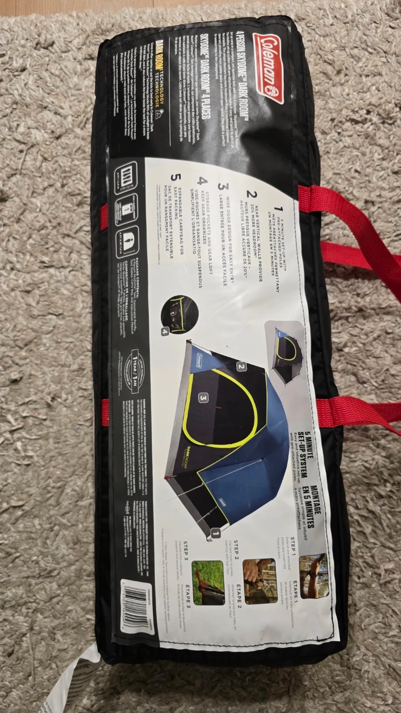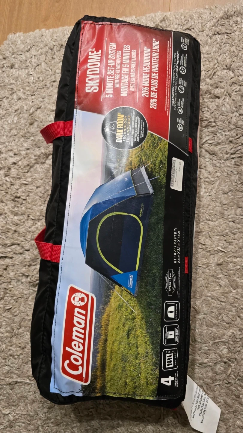 Selling a Coleman Skydome 4-person tent! It features a 5-minute setup system and dark room technology. The tent offers 20% more headroom.