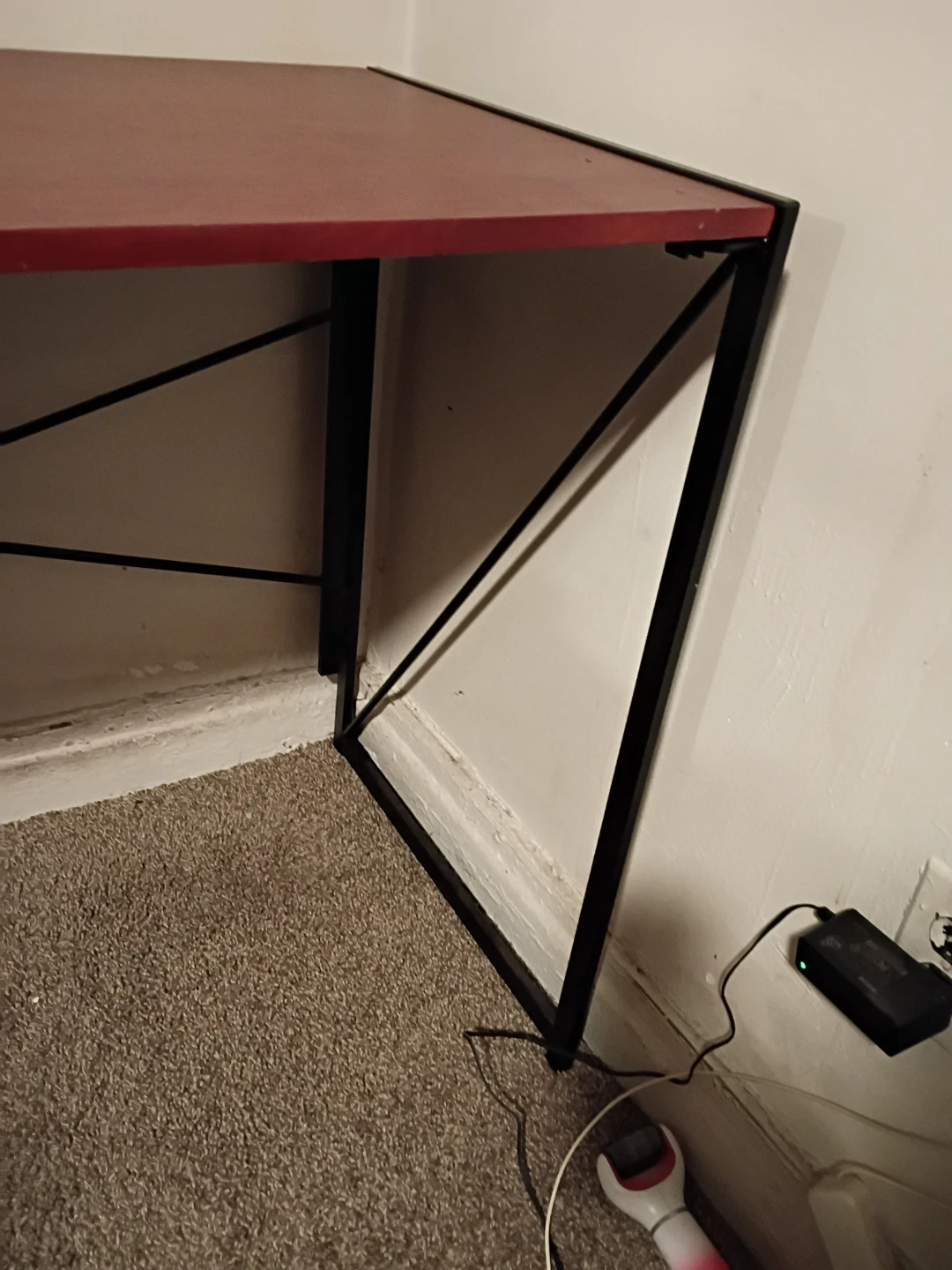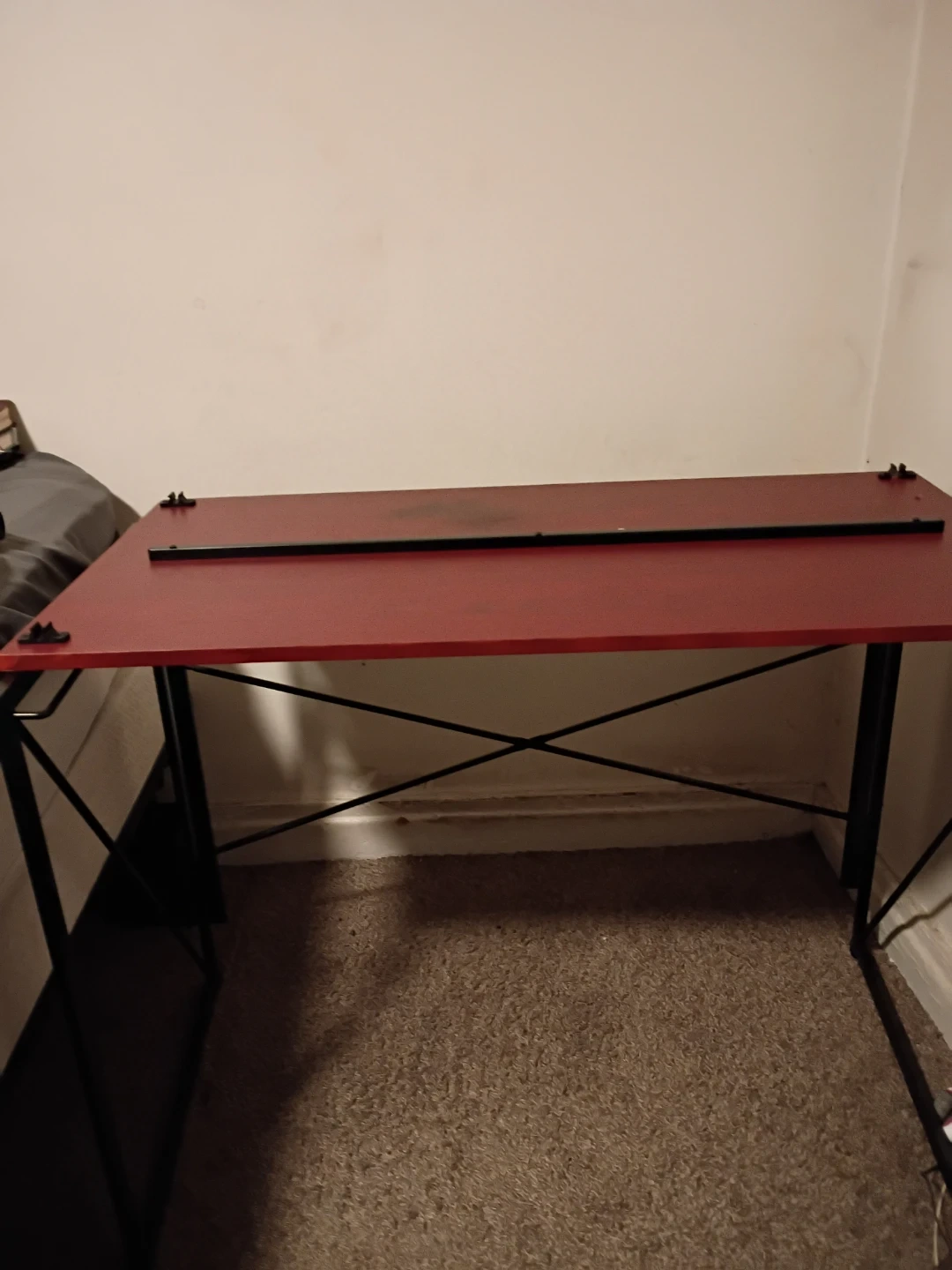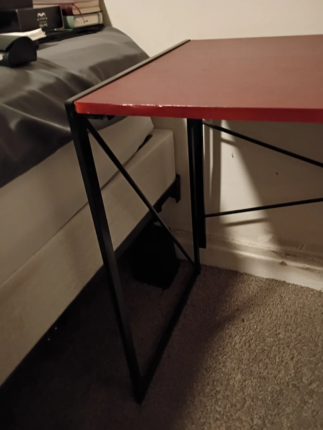 I'm selling a folding desk with a red top and black metal frame. It's in good condition and perfect for small spaces or anyone who needs a desk that can be easily stored away when not in use