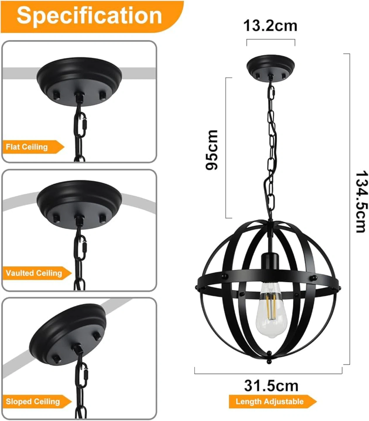 - Dimensions: 13.2cm (ceiling plate diameter), 95cm (height from ceiling plate to top of globe), 134.5cm (total height with chain), 31.5cm (globe diameter)