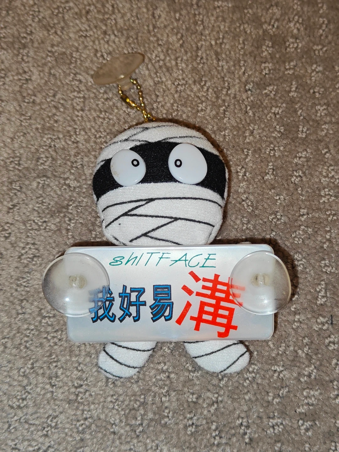 I am selling a Vintage Cheeky Mummy Ninja 1990s Plush Doll Window Sign in used, good condition. A rare, humorous mummy plush collectible. This piece is perfect for those who appreciate quirky, "Engrish" style humor or unique novelty items. The plush depicts a wide-eyed mummy holding a sign with a mix of English and Traditional Chinese text.