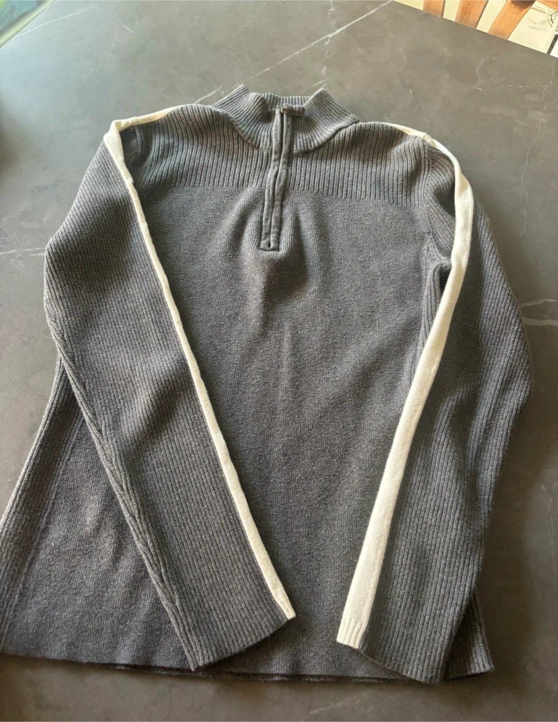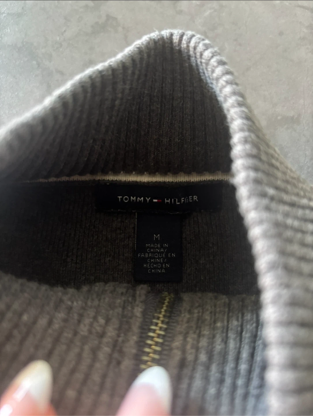 Here's a Tommy Hilfiger grey 1/4 zip sweater in size medium! It features a white stripe down the sleeves with the Tommy Hilfiger logo. Perfect for layering or wearing on its own
